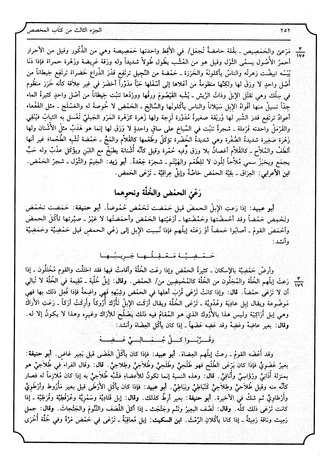 مرعًى والحمصيص - بقلة حامضة تجعَل فِي الأقط واحدتها حمصيصة وَهِي من الذُّكُور وَقيل م نالأحرار أَحْمَر الْأُصُول يسمّى الثّول وَقيل هُوَ من العشب يطول طولا شَدِيدا وَله ورقة عريضة وزهرة حَمْرَاء فَإِذا دنا يُبسُه ابيضّت زهرته وَالنَّاس يَأْكُلُونَهُ والخرزة - حمضة من النّجيل ترْتَفع قدر الذِراع خضراء ترْتَفع خيطاناً من أصل وَاحِد لَا ورق لَهَا ولكنّها منظومة من أَعْلَاهَا إِلَى أَسْفَلهَا حبّاً مدوّراً أَخْضَر فِي غير عِلاقة كَأَنَّهُ خرز منظوم فِي سلك وَهِي تقتل الْإِبِل وَذَات الرّيش - يشبه القيصوم وَرقهَا ووردها تنْبت خيطاناً من أصل وَاحِد كَثِيرَة المَاء جدا تسيل مِنْهَا أَفْوَاه الْإِبِل سَيَلاناً وَالنَّاس يأكلونها والسّالخ - الحمض لَا خوصَة لَهُ والغسلَج - مثل القَفْعاء أَعْوَاد ترْتَفع قدر الشِبر لَهَا وريقة صَغِيرَة مدوّرة لزجة وَلها زهرَة كزهرة المرو الْجبلي تُغسل بِهِ الثِّيَاب فينقي والقرمل واحدته قرملة - شَجَرَة تنْبت فِي السِباخ على سَاق وَاحِدَة لَا ورق لَهَا إِنَّمَا هُوَ هدب مثل الأُشنان وَلها زهرَة صَغِيرَة شَدِيدَة الصُفرة وَهِي شَدِيدَة الخضرة تُؤْكَل وطعمها كالقُلاّم والمجّ - حمضة تشبه الطحْماء غير أَنَّهَا ألطف والمُلاّح - كالقُلاّم أَغْصَان بِلَا ورق وَفِيه حمرَة وَقيل كَأَنَّهُ أشنانة يطْبخ مَعَ اللَّبن ويؤكل عذبٌ وَله حب يجمع ويخبز سمي مُلاّحاً للون لَا للطعم والهيتم - شَجَرَة جعدة. أَبُو زيد: الخيم والثّول - شجر الحمض. ابْن الْأَعرَابِي: العِراق - بَقِيَّة الحمض خاصّة وإبل عراقية - ترعى الحمض.