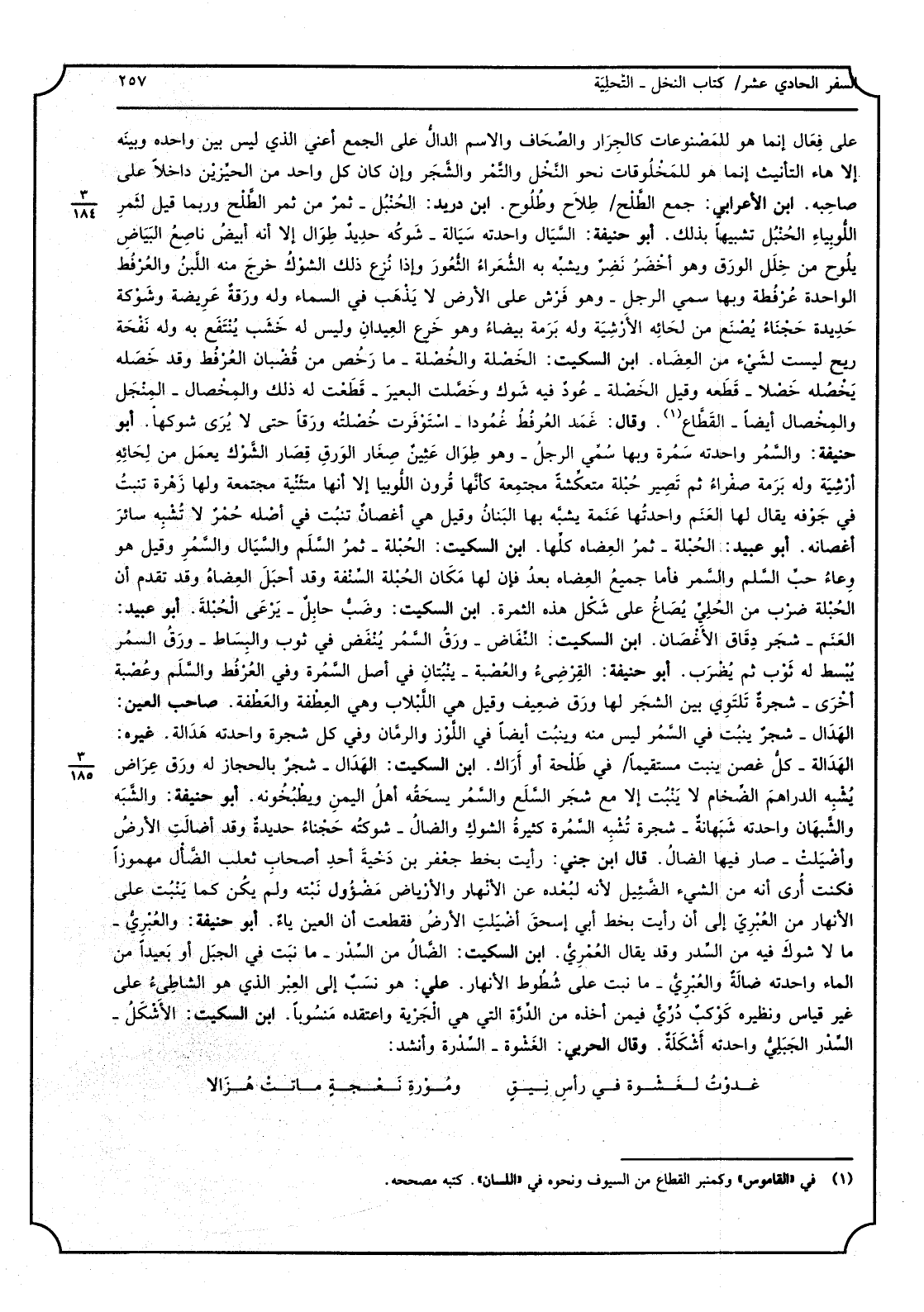 على فعال إِنَّمَا هُوَ للمصنوعات كالجِرار والصِحاف وَالِاسْم الدَّال على الْجمع أَعنِي الَّذِي لَيْسَ بَين واحده وَبَين إِلَّا هَاء التأنيف إِنَّمَا هُوَ للمخلوقات نَحْو النّخل وَالتَّمْر وَالشَّجر وَإِن كَانَ كل وَاحِد من الحيزين دَاخِلا على صَاحبه. ابْن الْأَعرَابِي: جمع الطّلح طِلاح وطُلوح. ابْن دُرَيْد: الحُنبُل - ثَمَر من ثَمَر الطلح وَرُبمَا قيل لثمر اللوبياء الحُنبُل تَشْبِيها بذلك. أَبُو حنيفَة: السّيال واحدته سَيالة - شوكه حَدِيد طوال إِلَّا أَنه أبيضُ ناصع الْبيَاض يلوح من خِلَل الْوَرق وَهُوَ أَخْضَر نضر وَيُشبه بِهِ الشُعراء الثّغور وَإِذا نُزع ذَلِك الشوك خرج مِنْهُ اللَّبن والعرفط الْوَاحِدَة عرفطة وَبهَا سمي الرجل - وَهُوَ فرش على الأَرْض لَا يذهب فِي السَّمَاء وَله ورقة عريضة وشوكة حَدِيدَة حجناء يُصنع من لحائه الأرشية وَله برمة بَيْضَاء وَهُوَ خرع العيدان وَلَيْسَ لَهُ خشب يُنتفع بِهِ وَله نفحة ريح لَيست لشَيْء من العضاه. ابْن السّكيت: الْخصْلَة والخُصلة - مَا رخص من قضبان العرفط وَقد خصله يخصُله خَصْلاً - قطعه وَقيل الخَصلة - عود فِيهِ شوك وخصّلت الْبَعِير - قطعت لَهُ ذَلِك والمِخصال - المنجل والمِخصال أَيْضا - القطّاع. وَقَالَ: غمد العرفط غُموداً - استوفرت خُصلته ورَقاً حَتَّى لَا يُرى شَوْكهَا. أَبُو حنيفَة: والسمر واحدته سمُرة وَبهَا سمي الرجل - وَهُوَ طِوال عثين صغَار الْوَرق قصار الشوك يعْمل من لحائه أرشية وَله برمة صفراء ثمَّ تصير حبلة متعكّشة مجتمعة كَأَنَّهَا قُرُون اللوبيا إِلَّا أَنَّهَا منثنية مجتمعة وَلها زهرَة تنْبت فِي جَوْفه يُقَال لَهَا العنم واحدتها عنمة يشبّه بهَا البنان وَقيل هِيَ أَغْصَان تنْبت فِي أَصله حُمر لَا تشبه سَائِر أغصانه. أَبُو عبيد: الحُبلة - ثَمَر العضاه كلهَا. ابْن السّكيت: الحبلة - ثَمَر السّلم والسّيال والسمُر وَقيل هُوَ وعَاء حبّ السّلم والسمر فَأَما جَمِيع العضاه بعد فَإِن لَهَا مَكَان الحُبلة السِنفة وَقد أحبل العضاه وَقد تقدم أَن الحبلة ضرب من الحُليّ يصاغ على شكل هَذِه الثَّمَرَة. ابْن السّكيت: وضبّ حابل - يرْعَى الحبلة. أَبُو عبيد: العنم - شجر دِقاق الأغصان. ابْن السّكيت: النِفاض - ورق السمر ينفض فِي ثوب والبِساط - ورق السمر يُبسط لَهُ ثوب ثمَّ يُضرب. أَبُو حنيفَة: القرضيءُ والعصية - ينبتان فِي أصل السمرَة وَفِي العرفط والسلَم وعصبة أُخْرَى - شَجَرَة تلتوي بَين الشّجر لَهَا ورق ضَعِيف وَقيل هِيَ اللبلاب وَهِي العطفة والعطفة. صَاحب الْعين: الهدال - شجر ينْبت فِي السمر لَيْسَ مِنْهُ وينبت أَيْضا فِي اللوز والرمّان وَفِي كل شَجَرَة واحدته هَدالة. غَيره: الهدالة - كل غُصْن ينْبت مُسْتَقِيمًا فِي طَلْحَة أَو أَرَاك. ابْن السّكيت: الهدال - شجر بالحجاز لَهُ ورق عِراض يشبه الدَّرَاهِم الضِخام لَا ينْبت إِلَّا مَعَ شجر السّلع والسمر يسحقه أهل الْيمن ويطبخونه. أَبُو حنيفَة: والشَّبَه والشّبَهان واحدته شبَهانة. شَجَرَة تشبه السمرَة كَثِيرَة الشوك والضال - شوكته حجناء حَدِيدَة وَقد أضالت الأَرْض وأضيَلتْ - صَار فِيهَا الضال. قَالَ ابْن جني: رَأَيْت بِخَط جَعْفَر بن دحْيَة أحد أَصْحَاب ثَعْلَب الضّأل مهموزاً فَكنت أرى أَنه من الشَّيْء الضّئيل لِأَنَّهُ لبعده عَن الْأَنْهَار والأرياض مضؤُل نبته وَلم يكن كَمَا ينْبت على الْأَنْهَار من العبري إِلَى أَن رَأَيْت بِخَط أبي إِسْحَاق أضيَلت الأَرْض فَقطعت أَن الْعين يَاء. أَبُو حنيفَة: والعبري - مَا لَا شوك فِيهِ من السِدر وَقد يُقَال الْعمريّ. ابْن السّكيت: الضّال من السدر - مَا نبت فِي الْجَبَل أَو بَعيدا من المَاء واحدته ضَالَّة والعُبري - مَا نبت على شطوط الْأَنْهَار. عَليّ: هُوَ نسب إِلَى العبر الَّذِي هُوَ الشاطئ على غير قِيَاس وَنَظِيره كَوْكَب درّي فِيمَن أَخذه من الدرّة الَّتِي هِيَ الجرية واعتقده مَنْسُوبا. ابْن السّكيت: الأشكل - السِدر الْجبل