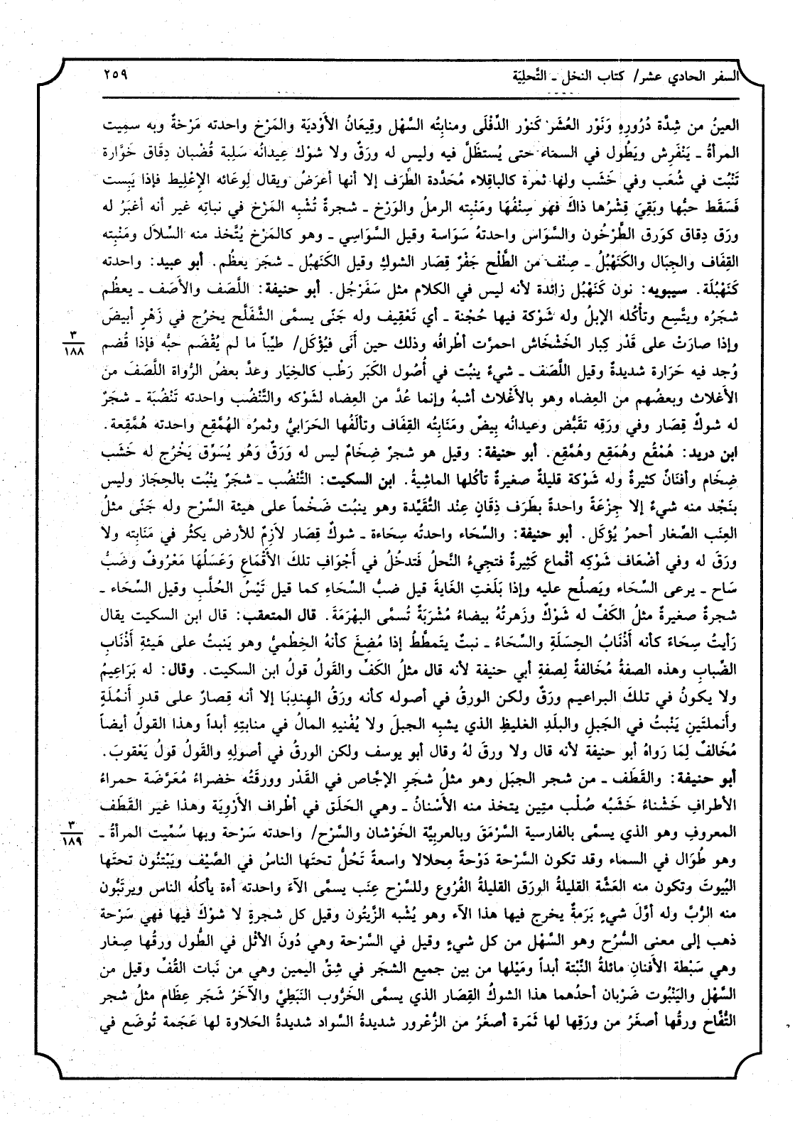الْعين من شدّة دروره وَنور الْعشْر كنور الدِفلى ومنابته السهل وقيعان الأودية والمرْخ واحدته مرخة وَبِه سميت الْمَرْأَة - ينفرش وَيطول فِي السَّمَاء حَتَّى يُستظلّ فِيهِ وَلَيْسَ لَهُ ورق وَلَا شوك عيدانه سلبة قُضبان دِقاق خوّارة تنْبت فِي شعَب وَفِي خشب وَلها ثَمَرَة كالباقلاء محدّدة الطّرف إِلَّا أَنَّهَا أعرض وَيُقَال لوعائه الإعليط فَإِذا يَبِسَتْ فَسقط حبها وَبَقِي قشرها ذَاك فَهُوَ سنفها ومنبته الرمل والورْخ - شَجَرَة تشبه المرْخ فِي نَبَاته غير أَنه أغبر لَهُ ورق دِقاق كورق الطّرخون والسّواس واحدته سواسة وَقيل السّواسي - وَهُوَ كالمرْخ يتّخذ مِنْهُ السلال ومنبته القِفاف وَالْجِبَال والكنهبُل - صنف من الطّلح جفر قِصار الشوك وَقيل الكنهبل - شجر يعظم. أَبُو عبيد: واحدته كنهبلة. سِيبَوَيْهٍ: نون كنهبل زَائِدَة لِأَنَّهُ لَيْسَ فِي الْكَلَام مثل سفرجل. أَبُو حنيفَة: اللصَف والأصَف - يعظم شَجَره ويتّسع وتأكله الْإِبِل وَله شَوْكَة فِيهَا حُجْنة - أَي تعقيف وَله جنى يُسمى الشّفلّح يخرج فِي زهر أَبيض وَإِذا صَارَت على قدر كبار الخشخاش احمرّت أَطْرَافه وَذَلِكَ حِين أَتَى فيؤكل طيّباً مَا لم يُقضَم حبه فَإِذا قُضم وجد فِيهِ حرارة شَدِيدَة وَقيل اللصَف - شَيْء ينْبت فِي أصُول الْكبر رطْب كالخِيار وعدّ بعض الرّواة اللصَف من الأغلاث وَبَعْضهمْ من العضاه وَهُوَ بالأغلاث أشبه وَإِنَّمَا عُدّ من العِضاه لشوكه والتّنْضُب واحدته تنضُبة - شجر لَهُ شوك قِصار وَفِي ورقه تقبّض وعيدانه بيض ومنابته القِفاف وتألفها الحرابيّ وثمره الهمّقِع واحدته همّقعة. ابْن دُرَيْد: همقُع وهُمَقِع وهمّقِع. أَبُو حنيفَة: وَقيل هُوَ شجر ضِخام لَيْسَ لَهُ ورق وَهُوَ يسوّق يخرج لَهُ خشب ضِخام وأفنان كَثِيرَة وَله شَوْكَة قَليلَة صَغِيرَة تأكلها الْمَاشِيَة. ابْن السّكيت: التنْضُب - شجر ينْبت بالحجاز وَلَيْسَ بِنَجْد مِنْهُ شَيْء إِلَّا جزعة وَاحِدَة بِطرف ذِقان عِنْد التُّقَيدة وَهُوَ ينْبت ضخماً على هَيْئَة السّرح وَله جنى مثل الْعِنَب الصغار أَحْمَر يُؤْكَل. أَبُو حنيفَة: والسِحاء واحدته سحاءة - شوك قِصار لَازم للْأَرْض يكثر فِي منابته وَلَا ورق لَهُ وَفِي أَضْعَاف شوكه أقماع كَثِيرَة فتجيء النّحل فَتدخل فِي أَجْوَاف تِلْكَ الأقماع وعسلها مَعْرُوف وضبّ ساح - يرْعَى السحاء وَيصْلح عَلَيْهِ وَإِذا بلغت الْغَايَة قيل ضبّ السِحاء كَمَا قيل تيسُ الحُلّب وَقيل السِحاء - شَجَرَة صَغِيرَة مثل الْكَفّ لَهُ شوك وزهرته بَيْضَاء مشربَة تسمى البهرمة. قَالَ المتعقب: قَالَ ابْن السّكيت يُقَال رَأَيْت سِحاء كَأَنَّهُ أَذْنَاب الْحلَّة والسِحاء - نبت يتمطّط إِذا مُضِغ كَأَنَّهُ الخِطميّ وَهُوَ ينْبت على هَيْئَة أَذْنَاب الضباب وَهَذِه الصّفة مُخالفة لصفة أبي حنيفَة لِأَنَّهُ قَالَ مثل الكفّ وَالْقَوْل قَول ابْن السّكيت. وَقَالَ: لَهُ براعيم وَلَا يكون فِي تِلْكَ البراعيم ورق وَلَكِن الْوَرق فِي أُصُوله كَأَنَّهُ ورق الهِندِبا إِلَّا أَنه قصار على قدر أُنْمُلَة وأنملتين ينْبت فِي الْجَبَل والبلد الغليظ الَّذِي يشبه الْجَبَل وَلَا يُفنيه المالُ فِي منابته أبدا وَهَذَا القَوْل أَيْضا مُخَالف لما رَوَاهُ أَبُو حنيفَة لِأَنَّهُ قَالَ وَلَا ورق لَهُ وَقَالَ أَبُو يُوسُف وَلَكِن الْوَرق فِي أُصُوله وَالْقَوْل قَول يَعْقُوب. أَبُو حنيفَة: والقطَف - من شجر الْجَبَل وَهُوَ مثل شجر الاجّاص فِي الْقدر وورقته خضراء معرّضة جراء الْأَطْرَاف خشناء خشبه صلب متين يتَّخذ مِنْهُ الأسْنان - وَهِي الحلَق فِي أَطْرَاف الأروية وَهَذَا غير القطَف الْمَعْرُوف وَهُوَ الَّذِي يُسمى بِالْفَارِسِيَّةِ السرْمَق وبالعربية الخوشان والسّرْح واحدته سرحة وَبهَا سميت الْمَرْأَة - وَهُوَ طوال فِي السَّمَاء وَقد تكون السّرحة دوحة محلالاً وَاسِعَة تحلّ تحتهَا النَّاس فِي الصّيف ويبتنون تحتهَا الْبيُو
