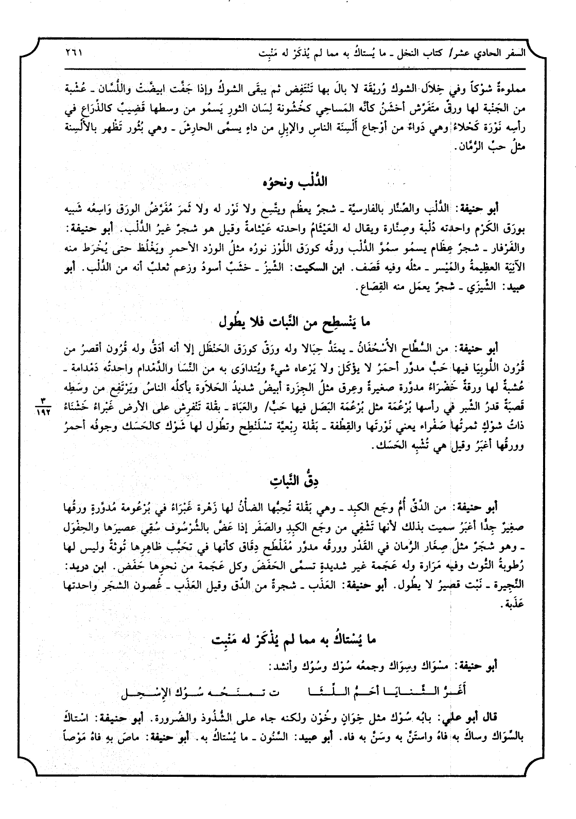أَبُو حنيفَة: من الدِقّ أمُ وجع الكبد - وَهِي بقلة تحبها الضَّأْن لَهَا زهرَة غبراء فِي برعومة مدوّرة وَرقهَا صَغِير جدا أغبر سميت بذلك لِأَنَّهَا تشفي من وجع الكبد والصفَر إِذا عضّ بالشرسوف سُقي عصيرها والحِفْوَل - وَهُوَ شجر مثل صغَار الرُمّان فِي القدْر وورقه مدوّر مفلطح دِقاق كَأَنَّهَا فِي تحبّب ظَاهرهَا توثة وَلَيْسَ لَهَا رُطُوبَة التّوث وَفِيه مرَارَة وَله عجمة غير شَدِيدَة تسمّى الحفضّ وكل عجمة من نَحْوهَا حفض. ابْن دُرَيْد: النجيرة - نبت قصير لَا يطول. أَبُو حنيفَة: العذَب - شَجَرَة من الدِق وَقيل العذَب - غصون الشّجر واحدتها عذبة.
