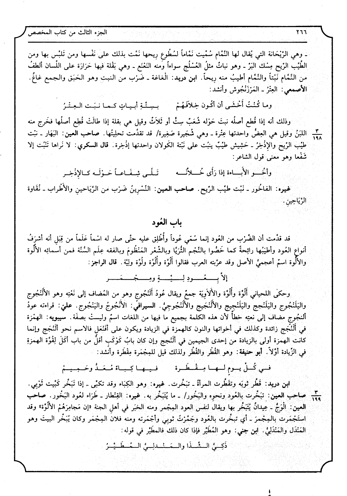 وَهِي الريحانة الَّتِي يُقَال لَهَا النّمّام سميت لسطوع رِيحهَا نمّت بذلك على نَفسهَا وَمن تلبّس بهَا وَمن الطّيب الرّيح مسك البرّ - وَهُوَ نَبَات مثل العُسلج سَوَاء وَمِنْه النّعنع - وَهِي بقلة فِيهَا حرارة على اللِّسَان ألطف من النّمّام نبتاً والنّمّام أطيب مِنْهُ ريحًا. ابْن دُرَيْد: الغاغة - ضرب من النبت وَهُوَ الحبق وَالْجمع غاغ. الْأَصْمَعِي: العِتْر - المرنجوش وَأنْشد: وَمَا كنت أخْشَى أَن أكون خلافَهم بستّة أَبْيَات كَمَا نبت العِترُ وَذَلِكَ أَنه إِذا قُطع أَصله نبت حوله شعبٌ ستٌ أَو ثَلَاث وَقيل هِيَ بقلة إِذا طَالَتْ قطِع أَصْلهَا فَخرج مِنْهُ اللَّبن وَقيل هِيَ العِضّ واحدتها عِترة - وَهِي شجيرة صَغِيرَة قد تقدّمت تحليتها. صَاحب الْعين: البَهار - نبت طيب الرّيح والإذخر - حشيش طيب ينْبت على نبتة الكَولان واحدتها إذخِرة. قَالَ السكرِي: لَا نرَاهَا تنْبت إِلَّا شَفعاً وَهُوَ معنى قَول الشَّاعِر: وأخو الأباءة إِذْ رأى خُلاّنَه تلّى شِفاعاً حوله كالإذْخِر غَيره: الفاخور: نبت طيب الرّيح. صَاحب الْعين: النّسرين - ضرب من الرياحين والأطْراب - نُقاوة الرّياحين.