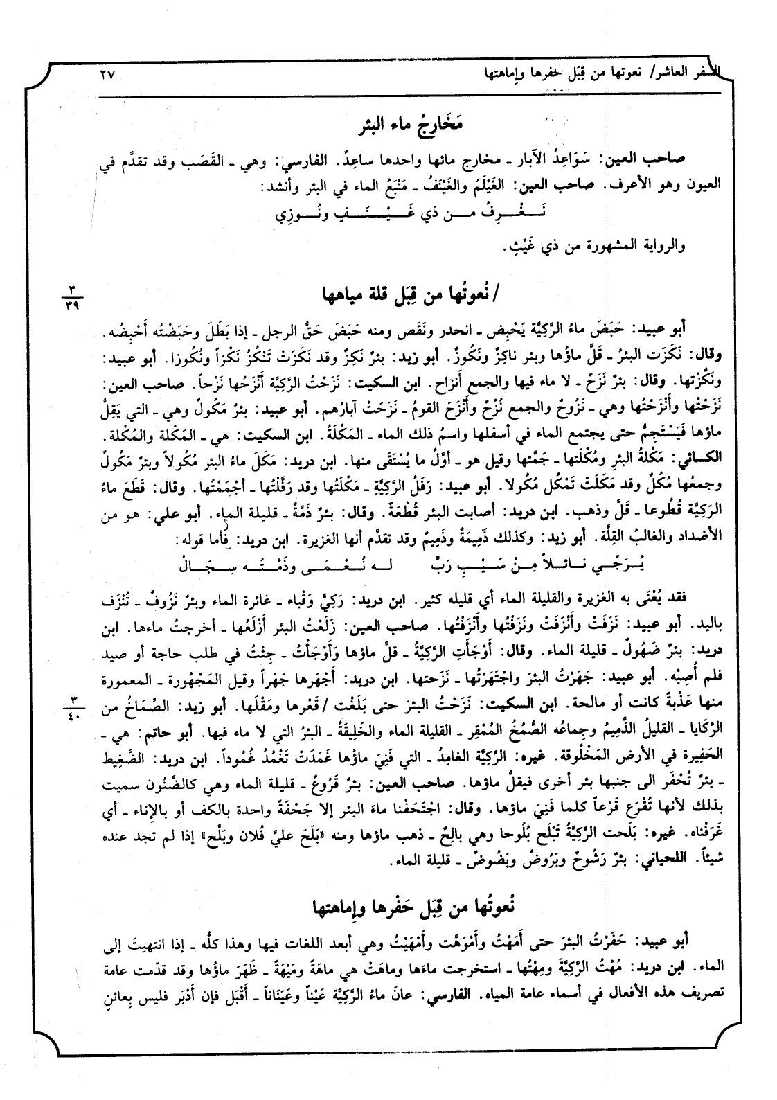 أَبُو عبيد حبض مَاء الرَّكية يحبض - انحدر وَنقص وَمِنْه حبض حق الرجل - إِذا بَطل وحبضته أحبضه وَقَالَ نكزت الْبِئْر - قل مَاؤُهَا وبئر ناكز ونكوز أَبُو زيد بِئْر نكز وَقد نكزت تنكز نكزاً ونكوزاً أَبُو عبيد ونكزتها وَقَالَ بِئْر نزح - لَا مَاء فِيهَا وَالْجمع أنزاح ابْن السّكيت نزحت الرَّكية أنزحها نزحاً صَاحب الْعين نزحتها وأنزحتها وَهِي - نزوح وَالْجمع نزح وأنزح الْقَوْم - نزحت آبارهم أَبُو عبيد بِئْر مكول وَهِي - الَّتِي يقل مَاؤُهَا فيستجم حَتَّى يجْتَمع المَاء فِي أَسْفَلهَا وَاسم ذَلِك المَاء - المكلة ابْن السّكيت هِيَ المكلة والمكلة الْكسَائي مكلة الْبِئْر ومكلتها - جمتها وَقيل هُوَ - أول مَا يستقى مِنْهَا ابْن دُرَيْد مكل مَاء الْبِئْر مكولاً وبئر مكول وَجَمعهَا مكل وَقد مكلت تمكل مكولاً أَبُو عبيد رفل الرَّكية - مكلتها وَقد رفلتها - أجمعتها وَقَالَ قطع مَاء الرَّكية قطوعاً - قل وَذهب ابْن دُرَيْد أَصَابَت الْبِئْر قِطْعَة وَقَالَ بِئْر ذمَّة - قَليلَة المَاء أَبُو عَليّ هُوَ من الاضداد وَالْغَالِب الْقلَّة أَبُو زيد وَكَذَلِكَ ذميمة وذميم وَقد تقدم أَنَّهَا الغزيرة ابْن دُرَيْد فَأَما قَوْله: يُرْجَى نائلاً من سيب رب لَهُ نعمى وذمته سِجَال فقد يعْنى بِهِ الغزيرة والقليلة المَاء أَي قَلِيله كثير ابْن دُرَيْد ركي وقباء - غائرة المَاء وبئر نزوف - تنزف بِالْيَدِ أَبُو عبيد نزفت وأنزفت ونزفتها وأنزفتها صَاحب الْعين زلعت الْبِئْر أزلعها - أخرجت ماءها ابْن دُرَيْد بِئْر ضهول - قَليلَة المَاء وَقَالَ أوجأت الرَّكية - قل مَاؤُهَا وأوجأت - جِئْت فِي طلب حَاجَة أَو صيد فَلم أصبه أَبُو عبيد جهرت الْبِئْر واجتهرتها - نزحتها ابْن دُرَيْد أجهرها جَهرا وَقيل المجهورة - المعمورة مِنْهَا عذبة كَانَت أَو مالحة ابْن السّكيت نزحت الْبِئْر حَتَّى بلغت قعرها ومقلها أَبُو زيد الصماخ من الركايا - الْقَلِيل الذميم وجماعه الصمخ الممقر - القليلة المَاء والخليقة - الْبِئْر الَّتِي لَا مَاء فِيهَا أَبُو حَاتِم هِيَ - الحفيرة فِي الأَرْض المخلوقة غَيره الرَّكية الغامد - الَّتِي فني مَاؤُهَا عَمَدت تغمد غموداً ابْن دُرَيْد الضغيط - بِئْر تحفر إِلَى جنبها بِئْر أُخْرَى فيقل مَاؤُهَا صَاحب الْعين بِئْر قروع - قَليلَة المَاء وَهِي كالضنون سميت بذلك لِأَنَّهَا تقرع قرعاً كلما فني مَاؤُهَا وَقَالَ اجتحفنا مَاء الْبِئْر إِلَّا جحفة وَاحِدَة بالكف أَو الاناء - أَي غرفناه غَيره بلحت الرَّكية تبلح بلوحاً وَهِي بالح - ذهب مَاؤُهَا وَمِنْه (بلح على فلَان وبلح) إِذا لم تَجِد عِنْده شيئأ الليحاني بِئْر رشوح وبروض وبضوض - قَليلَة المَاء