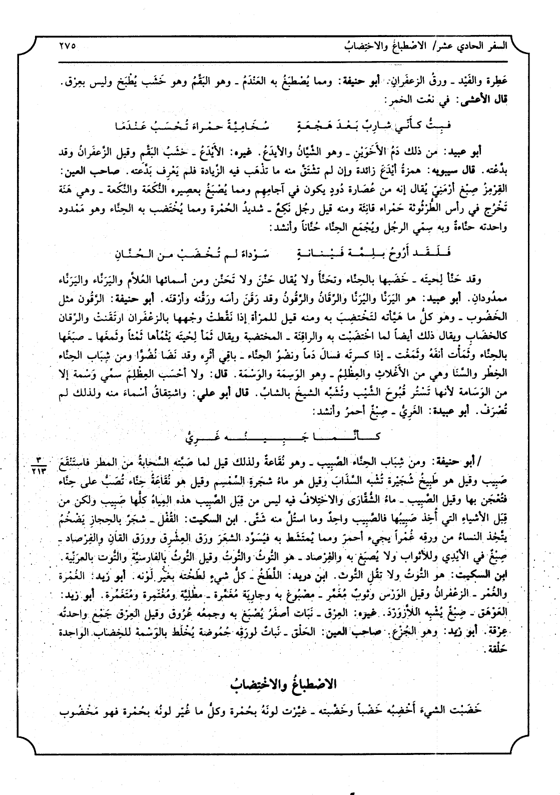 عطرة والفيْد - ورق الزَّعْفَرَان. أَبُو حنيفَة: وَمِمَّا يُصطبغ بِهِ العندم - وَهُوَ البقّم وَهُوَ خشب يُطبخ وَلَيْسَ بعرق. قَالَ الْأَعْشَى فِي نعت الْخمر: فبتّ كَأَنِّي شاربٌ بعد هجعةٍ سُخاميّة حَمْرَاء تحسَب عندَما أَبُو عبيد: من ذَلِك دم الْأَخَوَيْنِ - وَهُوَ الشّيّان والأيدَع. غَيره: الأيدع - خشب البقم وَقيل الزَّعْفَرَان وَقد بدّعته. قَالَ سِيبَوَيْهٍ: همزَة أيدع زَائِدَة وَإِن لم تشتقّ مِنْهُ مَا تذْهب فِيهِ الزِّيَادَة فَلم يعرف يدّعته. صَاحب الْعين: القرمز - صبغ أرمني يُقال إِنَّه من عصارة دود يكون فِي آجامهم وَمِمَّا يُصبغ بعصيره النُكَعة والنّكَعة - وَهِي هَنة تخرج فِي رَأس الطّرثوثة حَمْرَاء قانئة وَمِنْه قيل رجل نكع - شَدِيد الْحمرَة وَمِمَّا يُختضب بِهِ الحنّاء وَهُوَ مَمْدُود واحدته حنّاءة وَبِه سمي الرجل ويُجمع الْحِنَّاء حُنّاناً وَأنْشد: فَلَقَد أروح بلمّة فينانة سَوْدَاء لم تخضَب من الحُنّان وَقد حنّأ لحيته - خضبها بالحنّاء وتحنّأ وَلَا يُقَال حنّن وَلَا تَحَنن وَمن أسمائها العُلاّم واليرنّاء واليرنّاء ممدودان. أَبُو عبيد: هُوَ اليرنّا واليُرنّا والرّقان والرّقون وَقد رقن رَأسه ورقّنه وأرقنه. أَبُو حنيفَة: الرّقون مثل الخضوب - وَهُوَ كل مَا هيأته لتختضب بِهِ وَمِنْه قيل للْمَرْأَة إِذا نقّطت وَجههَا بالزعفران ارتقنت والرّقان كالخضاب وَيُقَال ذَلِك أَيْضا لما اختضبت بِهِ والراقنة - المختضبة وَيُقَال ثمأ لحيته يثمأها ثمئاً وثمغها - صبغها بِالْحِنَّاءِ وثمأت أَنفه وثمغت - إِذا كَسرته فَسَالَ دَمًا ونضو الْحِنَّاء - بَاقِي أَثَره وَقد نضا نضوّاً وَمن شباب الحنّاء الخِطْر والسّنا وَهِي من الأغلاث والعظلِم - وَهُوَ الوسمة والوسْمة. قَالَ: وَلَا أَحسب العِظلم سمي وسْمة إِلَّا من الوسامة لِأَنَّهَا تستر قُبوح الشّيب وتشبّه الشَّيْخ بالشباب. قَالَ أَبُو عَليّ: واشتقاق أَسمَاء مِنْهُ وَلذَلِك لم تُصرَف. أَبُو عُبَيْدَة: الغريّ - صبغ أَحْمَر وَأنْشد: كأنّما جبينُه غريُّ أَبُو حنيفَة: وَمن شِباب الحنّاء الصبيب - وَهُوَ نُقاعة وَلذَلِك قيل لما صبّته السّحابة من الْمَطَر فاستنقع صبيب وَقيل هُوَ طبيخ شُجيرة تشبه السّذاب وَقيل هُوَ مَاء شَجَرَة السمسم وَقيل هُوَ نقاعة حنّاء تصبّ على حنّاء فتعجن بهَا وَقيل الصّبيب - مَاء الشُقّارى وَالِاخْتِلَاف فِيهِ لَيْسَ من قبل الصّبيب هَذِه الْمِيَاه كلّها صبيب وَلَكِن من قبل الْأَشْيَاء الَّتِي أَخذ صبيبها فالصّبيب وَاحِد وَمَا استُلّ مِنْهُ شَتَّى. ابْن السّكيت: القُفْل - شجر بالحجاز يضخم يتّخذ النِّسَاء من ورقه غُمراً يَجِيء أَحْمَر وَمِمَّا يمتشط بِهِ فيسوّد الشّعْر ورق العشرِق وورق القان والفِرصاد - صبغ فِي الْأَيْدِي وللأثواب وَلَا يُصبغ بِهِ والفرصاد - هُوَ التّوث والتوت وَقيل التّوث بِالْفَارِسِيَّةِ والتوت بِالْعَرَبِيَّةِ. ابْن السّكيت: هُوَ التّوت وَلَا تقل النّوث. ابْن دُرَيْد: اللطَخ - كل شَيْء لطخته بِغَيْر لَونه. أَبُو زيد: الغمرة والغمْر - الزَّعْفَرَان وَقيل الورس وثوب مغمر - مصبوغ بِهِ وَجَارِيَة مغمّرة - مطلية ومغتمرة ومتغمّرة. أَبُو زيد: العوهَق - صبغ يشبه اللازورد. غَيره: العِرق - نَبَات أصفر يُصبغ بِهِ وَجمعه عُروق وَقيل الْعرق جمع واحدته عِرقة. أَبُو زيد: وَهُوَ الجزْع. صَاحب الْعين: الحلْق - نَبَات لورقه حُموضة يخلَط بالوسمة للخِضاب الْوَاحِدَة حلْقة.