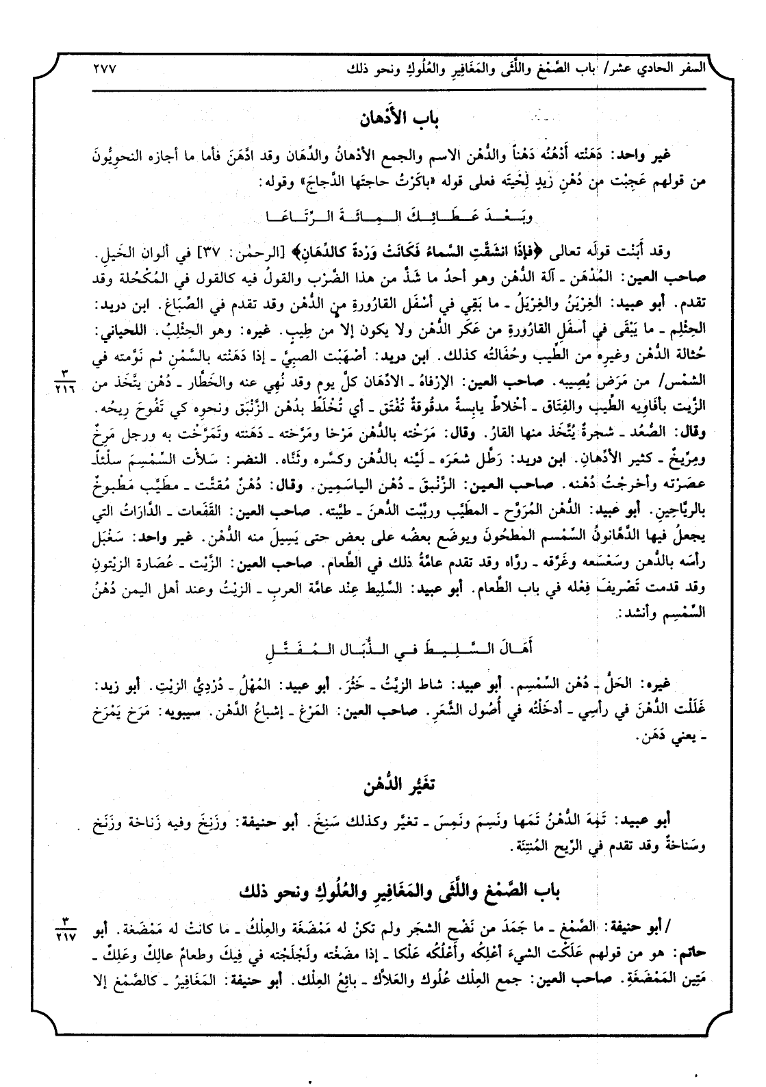 غير وَاحِد: دهنته أدهنه دهناً والدُهْن الِاسْم وَالْجمع الأدهان والدِهان وَقد ادّهَن فَأَما مَا أجَازه النحويون من قَوْلهم عجبت من دُهن زيد لحيته فعلى قَوْله باكرْت حَاجَتهَا الدّجاج وَقَوله: وَبعد عطائك الْمِائَة الرّتاعا وَقد أبنْت قَوْله تَعَالَى) فَإِذا انشقّت السّماء فَكَانَت وردة كالدِهان (فِي ألوان الْخَيل. صَاحب الْعين: المدهن - آلَة الدُهْن وَهُوَ أحد مَا شذّ من هَذَا الضَّرْب وَالْقَوْل فِيهِ كالقول فِي المُكحلة وَقد تقدم. أَبُو عبيد: الغِرين والغريَل - مَا بَقِي فِي أَسْفَل القارورة من الدُهن وَقد تقدم فِي الصِباغ. ابْن دُرَيْد: الحثلِم - مَا يبْقى فِي أَسْفَل القارورة من عكَر الدُهن وَلَا يكون إِلَّا من طيب. غَيره: وَهُوَ الحثلِب. اللحياني: حُثالة الدُهن وَغَيره من الطّيب وحُفالته كَذَلِك. ابْن دُرَيْد: أصهيت الصَّبِي - إِذا دهنته بالسّمن ثمَّ نوّمته فِي الشَّمْس من مرض يُصيبه. صَاحب الْعين: الإرفاه - الادّهان كل يَوْم وَقد نهي عَنهُ والخطار - دهن يتّخذ من الزّيت بأفاويه الطّيب والفِتاق - أخلاط يابسة مدقوقة تفتَق - أَي تخلط بدهن الزّنبق وَنَحْوه كي تفوح رِيحه. وَقَالَ: الصّعُد - شَجَرَة يُتّخذ مِنْهَا القار. وَقَالَ: مرخْته بالدُهن مرْخاً ومرّخته - دهَنته وتمرّخت بِهِ وَرجل مرِخ ومريخ - كثير الادّهان. ابْن دُرَيْد: رطّل شعرَه - ليّنه بالدهن وكسّره وثنّاه. النَّضر: سلأت السمسِم سلئاً - عصرته وأخرجت دهنه. صَاحب الْعين: الزّنبق - دهن الياسمين. وَقَالَ: دهن مقتّت - مطيّب مطبوخ بالرّياحين. أَبُو عبيد: الدُهن المروح - المطيّب وربّبت الدّهن - طيبته. صَاحب الْعين: القفَعات - الدّارات الَّتِي يَجْعَل فِيهَا الدّهانون السمسم المطحون وَيُوضَع بعضه على بعض حَتَّى يسيل مِنْهُ الدّهن. غير وَاحِد: سغبل رأسَه بالدهن وسعسعه وغرّقه - روّاه وَقد تقدم عامّة ذَلِك فِي الطَّعَام. صَاحب الْعين: الزّيت - عُصارة الزَّيْتُون وَقد قدمت تصريف فعله فِي بَاب الطَّعَام. أَبُو عبيد: السّليط عِنْد عَامَّة الْعَرَب - الزَّيْت وَعند أهل الْيمن دهن السمسم وَأنْشد: أهال السّليط فِي الذُبال المفتّل غَيره: الحلّ - دهن السمسم. أَبُو عبيد: شاط الزَّيْت - خثُر. أَبُو عبيد: المهْل - دُردي الزَّيْت. أَبُو زيد: غللت الدُهن فِي رَأْسِي - أدخلته فِي أصُول الشّعر. صَاحب الْعين: المرْغ - إشباع الدّهن. سِيبَوَيْهٍ: مرخ يمرخ - يَعْنِي دهن.
