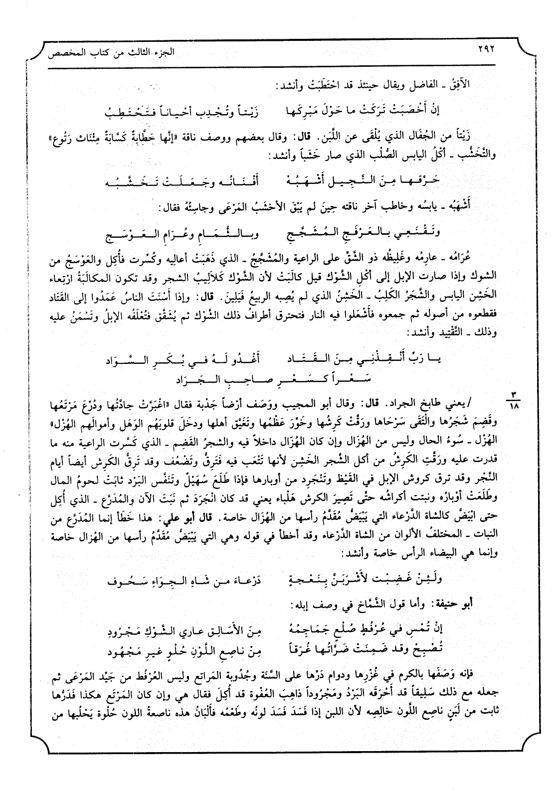 الآفِق - الْفَاضِل وَيُقَال حِينَئِذٍ قد احتطبَت وَأنْشد: إِن أخضبَتْ تركَت مَا حول مبركِها زيتاً وتُجدِب أَحْيَانًا فتحتطب زيتاً من الجُفال الَّذِي يُلقى عَن اللّبن. قَالَ: وَقَالَ بَعضهم وَوصف نَاقَة إِنَّهَا حطّابة كسّابة مئناث رَتوع والتخشّب - أكل الْيَابِس الصُلب الَّذِي صَار خشباً وَأنْشد: حرّقها من النّجيل أشهبُه أفنانُه وجعلتْ تخشّبُه أشهبُه - يابسه وخاطب آخر نَاقَته حِين لم يبقَ إِلَّا خشبُ المرعى وجاسئُه فَقَالَ: وتقنَعي بالعرفَج المشجّجِ وبالثّمام وعُرام العوْسَج عُرامه - عارمه وغليظه ذُو الشقِّ على الراعية والمشجّجُ - الَّذِي ذهبت أعاليه وكُسرت فأُكل والعوسج من الشوك وَإِذا صَارَت الْإِبِل أكل الشّوك قيل كالبَتْ لِأَن الشوك كلاليبُ الشّجر وَقد تكون المكالبَة ارتِعاء الخشِن الْيَابِس وَالشَّجر الكلِب - الخشن الَّذِي لم يُصِبه الرّبيع فيلين. قَالَ: وَإِذا أسْنَت النَّاس عَمدُوا إِلَى القَتاد فقطعوه من أُصُوله ثمَّ جَمَعُوهُ فأشعلوا فِيهِ النَّار فتحترق أَطْرَاف ذَلِك الشوك ثمَّ يُشقَّق فتُعلَفه الْإِبِل وتسمَن عَلَيْهِ وَذَلِكَ - التقتيد وَأنْشد: يَا ربِّ أنقذني من القتاد أغدو لَهُ فِي بُكَر السّواد سَعراً كسَعْر صاحبِ الْجَرَاد يَعْنِي طابخ الْجَرَاد. قَالَ: وَقَالَ أَبُو الْمُجيب وَوصف أَرضًا جدْبة فَقَالَ: اغبرّت جادّتُها ودُرِّع مرتَعُها وقَضِم شجرُها والتقى سرْحاها ورقّت كرِشُها وخَوِر عظمُها وتغيّق أَهلهَا وَدخل قلوبَهم الوهَل وَأَمْوَالهمْ الهُزْل، الهُزل - سوء الْحَال وَلَيْسَ من الهُزال وَإِن كَانَ الهُزال دَاخِلا فِيهِ وَالشَّجر القَضِم - الَّذِي كسّرت الراعية مِنْهُ مَا قدرت عَلَيْهِ ورقّت الكرِشُ من أكل الشّجر الخشن لِأَنَّهَا تتعب فِيهِ فترقّ وتضعُف وَقد ترقّ الكرش أَيْضا أَيَّام النّجْر وَقد ترق كروش الْإِبِل فِي القيظ وتنجرد من أوبارها فَإِذا طلع سُهيل وتنفّس الْبرد ثابَت لُحُوم المَال وطلعت أوباره ونبتت أكراشه حَتَّى تَصير الكرش هَلباء يَعْنِي قد كَانَ انجرد ثمَّ نبت الْآن والمدرّع - الَّذِي أُكل حَتَّى ابيضّ كالشاة الدّرعاء الَّتِي يبيَضّ مُقدّم رَأسهَا من الهُزال خَاصَّة. قَالَ أَبُو عَليّ: هَذَا خطأ إِنَّمَا المدرّع من النَّبَات - الْمُخْتَلف الألوان من الشَّاة الدّرعاء وَقد أَخطَأ فِي قَوْله وَهِي الَّتِي يبيضّ مُقدّم رَأسهَا من الهُزال خَاصَّة وَإِنَّمَا هِيَ الْبَيْضَاء الرَّأْس خَاصَّة وَأنْشد: وَلَئِن غضبْت لأشربَنّ بنعجٍ درْعاءَ من شاهِ الجِواء سَحوف أَبُو حنيفَة: وَأما قَول الشمّاخ فِي وصف إبِله: إِن تُمسي فِي عرفُط صُلع جماجمُه من الأسالق عاري الشّوك مجرود تُصبح وَقد ضمنَتْ ضرّاتُها غُرَقاً من ناصع اللونِ حلوٍ غير مجهود فَإِنَّهُ وصفهَا بِالْكَرمِ فِي غُزرِها ودوام درّها على السّنة وجُدوبة المراتع وَلَيْسَ العُرفط من جيّد المرعى ثمَّ جعله مَعَ ذَلِك سَليقاً قد أحرقه الْبرد ومجروداً ذَاهِب العُفوة قد أُكل فَقَالَ هِيَ وَإِن كَانَ المرتع هَكَذَا فدرّها ثَابت من لبن ناصع اللَّوْن خالصِه لِأَن اللَّبن إِذا فسد فسدَ لَونه وطعمُه فألبان هَذِه ناصعة اللَّوْن حُلوة يحلُبها من