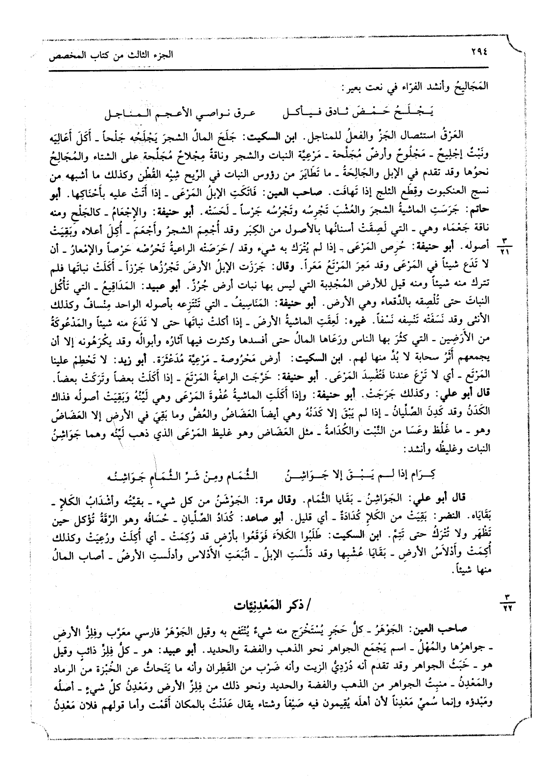 المجاليح وَأنْشد الفرّاء فِي نعت بعير: يجلحُ حمضَ ثادق فياكل عرق نواصي الْأَعْجَم المناجل العرْقُ استئصال الجزّ وَالْفِعْل للمناجل. ابْن السّكيت: جلحَ المالُ الشجرَ يجلحه جلْحاً - أكل أعاليه ونبتٌ إجليح - مجلوح وَأَرْض مجلّحة - مرعيّة النَّبَات وَالشَّجر وناقة مجلاح مجلحة على الشتَاء والمُجالِح نَحْوهَا وَقد تقدم فِي الْإِبِل والجالحة - مَا تطاير من رُؤُوس النَّبَات فِي الرّيح شبه الْقطن وَكَذَلِكَ مَا أشبهه من نسج العنكبوت وقِطع الثَّلج إِذا تهافت. صَاحب الْعين: فاتكت الْإِبِل المرعى - إِذا أَتَت عَلَيْهِ بأحْناكها. أَبُو حَاتِم: جرسَت الْمَاشِيَة الشّجر والعُشبَ تجرسه وتجرُسه جرْساً - لحستْه. أَبُو حنيفَة: والإجعام - كالجلح وَمِنْه نَاقَة جعْماء وَهِي - الَّتِي لصِقَت أسنانها بالأصول من الكِبر وَقد أُجعِم الشّجر وأجعَم - أُكِل أَعْلَاهُ وَبقيت أُصُوله. أَبُو حنيفَة: حُرِص المرعى - إِذا لم يُترك بِهِ شَيْء وَقد حرصَتْه الراعية تحرُصْه حرْصاً والإمعار - أَن لَا تدع شَيْئا فِي المرعى وَقد معِر المرتع معَراً. وَقَالَ: جرزَت الْإِبِل الأَرْض تجرزها جرْزاً - أكلت نباتها فَلم تتْرك مِنْهُ شَيْئا وَمِنْه قيل للْأَرْض المُجدِبة الَّتِي لَيْسَ بهَا نَبَات أَرض جُرُز. أَبُو عبيد: المداقيع - الَّتِي تَأْكُل النَّبَات حَتَّى تُلصقه بالدّقعاء وَهِي الأَرْض. أَبُو حنيفَة: المناسيف - الَّتِي تنتزعه بأصوله الْوَاحِد منْساف وَكَذَلِكَ الْأُنْثَى وَقد نسفَته تنسِفه نسْفاً. غَيره: لعِقَت الْمَاشِيَة الأَرْض - إِذا أكلت نباتَها حَتَّى لَا تدع مِنْهُ شَيْئا والمدعوكة من الأرَضين - الَّتِي كثر بهَا النَّاس ورعاها المَال حَتَّى أفسدها وَكَثُرت فِيهَا آثاره وأبواله وَقد يكرهونه إِلَّا أَن يجمعهُمْ أثر سَحَابَة لابدّ مِنْهَا لَهُم. ابْن السّكيت: أَرض محروسة - مرعيّة مدَعْثرة. أَبُو زيد: لَا نحطِم علينا المرتَع - أَي لَا ترْع عندنَا فتُفسد المرعى. أَبُو حنيفَة: خرّجَت الراعية المرتَع - إِذا أكلتْ بَعْضًا وتركتْ بَعْضًا. قَالَ أَبُو عَليّ: وَكَذَلِكَ جرجَتْ. أَبُو حنيفَة: وَإِذا أكلتِ الْمَاشِيَة عفْوةَ المرعى وَهِي لينُه وَبقيت أُصُوله فَذَاك الكدَن وَقد كدِن الصلّيان - إِذا لم يبْق إِلَّا كدَنُه وَهِي أَيْضا العَضاض والعُضّ وَمَا بَقِي فِي الأَرْض إِلَّا العضاض وَهُوَ - مَا غلُظ وعسا من النّبت والكُدامة - مثل العَضاض وَهُوَ غليظ المرعى الَّذِي ذهب ليّنُه وهما جواشن النَّبَات وغليظُه وَأنْشد: كِرام إِذا لم يبقَ إِلَّا جواشنُ ال ثُمام وَمن شرّ الثُمام جواشِنُه قَالَ أَبُو عَليّ: الجواشن - بقايا الثُمام. وَقَالَ مرّة: الجوشَن من كل شَيْء - بقيّته وأشداب الْكلأ - بقاياه. النَّضر: بقيَت من الْكلأ كُدادة - أَي قَلِيل. أَبُو صاعد: كُداد الصلّيان - حُسافه وَهُوَ الرِقة تُؤْكَل حِين تظهر وَلَا تُترك حَتَّى تتمّ. ابْن السّكيت: طلبُوا الْكلأ فوقعوا بِأَرْض قد وُكِمَت - أَي أُكلَت ورُعِيَت وَكَذَلِكَ أُكمَت وأدْلاسُ الأَرْض - بقايا عُشبها وَقد دلّسَت الْإِبِل - اتّبعتِ الأدلاس وأدلستِ الأَرْض - أصَاب المَال مِنْهَا شَيْئا.
