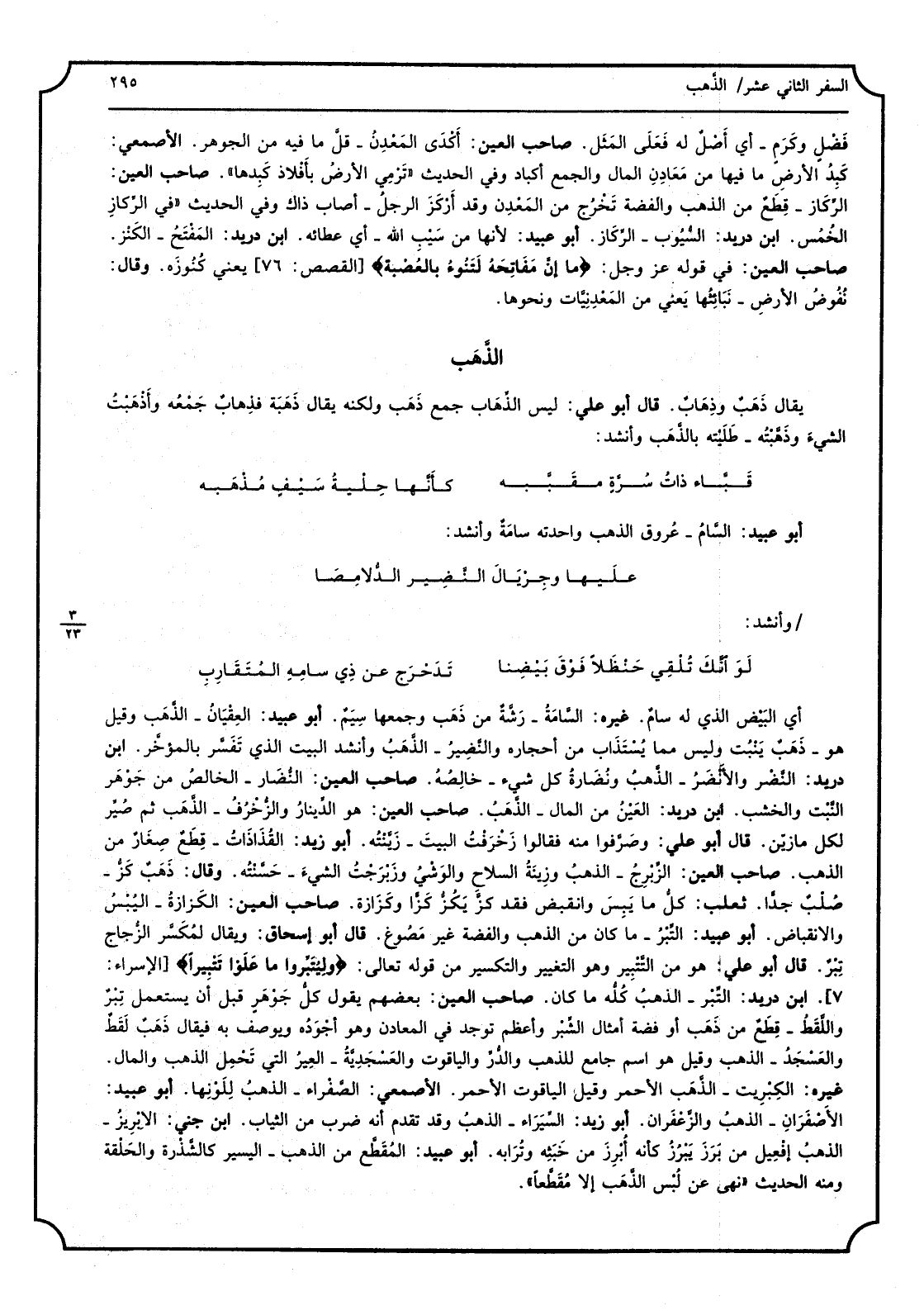 فضلٍ وكرم - أَي أصل لَهُ فعلى الْمثل. صَاحب الْعين: أكْدَى الْمَعْدن - قلّ مَا فِيهِ من الْجَوْهَر. الْأَصْمَعِي: كبِد الأَرْض - مَا فِيهَا من معادن المَال وَالْجمع أكباد وَفِي الحَدِيث) ترمي الأرضُ بأفلاذ كبِدها (. صَاحب الْعين: الرِّكاز - قطع من الذَّهَب وَالْفِضَّة تخرج من الْمَعْدن وَقد أرْكزَ الرجل - أصَاب ذَاك وَفِي الحَدِيث) فِي الرّكاز الخُمُس (. ابْن دُرَيْد: السّيوب - الرِكاز. أَبُو عبيد: لِأَنَّهَا من سَيْب الله - أَي عطائه. ابْن دُرَيْد: المفتَح - الْكَنْز. صَاحب الْعين. فِي قَوْله عز وَجل) مَا إنّ مَفاتح لَتنوء بالعُصبة (يَعْنِي كُنوزَه. وَقَالَ: نُفوض الأَرْض - نبائثُها يَعْنِي من المعدِنيّات وَنَحْوهَا.