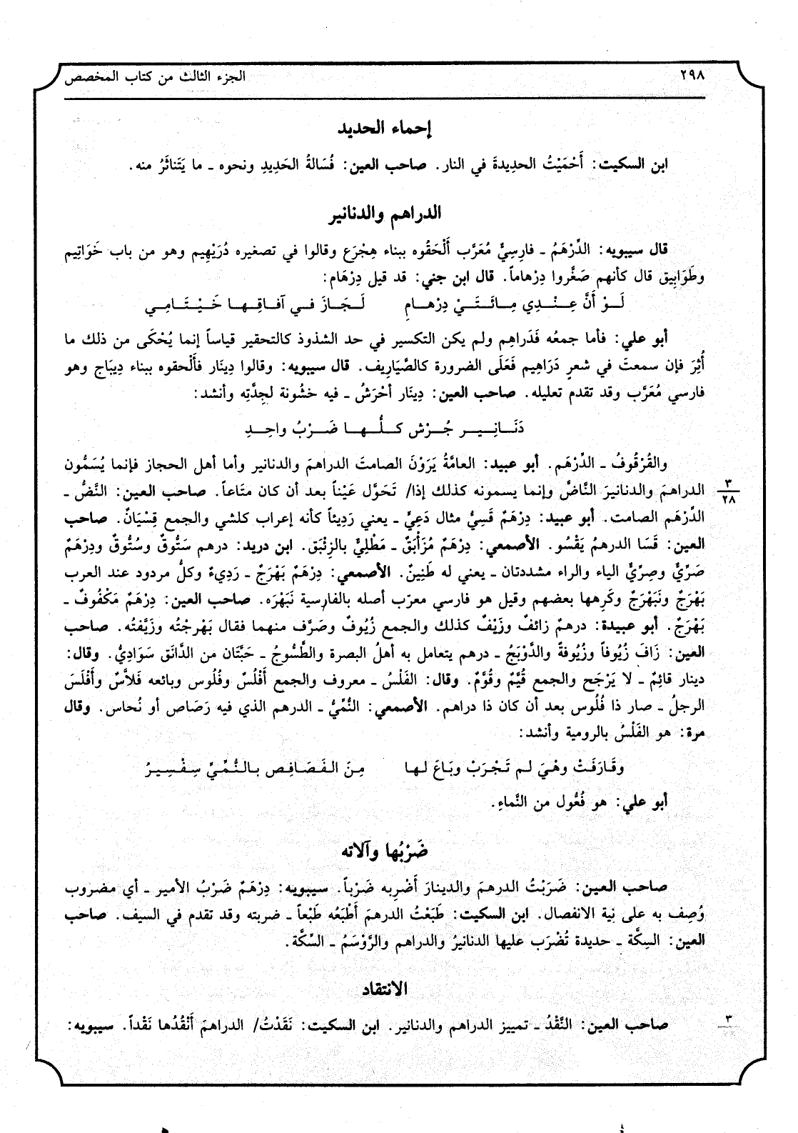 قَالَ سِيبَوَيْهٍ: الدِّرْهَم - فَارسي معرّب ألحقوه بِبِنَاء هجرَع وَقَالُوا فِي تصغيره دُرَيهيم وَهُوَ من بَاب خَوَاتِيم وطوابيق قَالَ كَأَنَّهُمْ صغّروا دِرْهاماً. قَالَ ابْن جني: قد قيل دِرْهام: لَو أنّ عِنْدِي مائَتي دِرهامِ لجازَ فِي آفاقِها خَيتَامي أَبُو عَليّ: فَأَما جمعُه فدَراهِم وَلم يكن التكسير فِي حد الشذوذ كالتحقير قِيَاسا إِنَّمَا يُحكى من ذَلِك مَا أثِر فَإِن سَمِعت فِي شعرٍ دراهِيم فعلَى الضَّرُورَة كالصّياريف. قَالَ سِيبَوَيْهٍ: وَقَالُوا دِينَار فألحقوه بِبِنَاء ديباج وَهُوَ فَارسي معرّب وَقد تقدم تَعْلِيله. صَاحب الْعين: دِينَار أحرش - فِيهِ خُشونة لجِدّته وَأنْشد: دَنَانِير جُرش كلهَا ضربُ وَاحِد والقُرقوف - الدِرهم. أَبُو عبيد: العامّة يروْن الصامتَ الدَّرَاهِم وَالدَّنَانِير وَأما أهل الْحجاز فَإِنَّمَا يسمّون الدَّرَاهِم وَالدَّنَانِير النّاضّ وَإِنَّمَا يسمونه كَذَلِك إِذا تحوّل عينا بعد أَن كَانَ مَتَاعا. صَاحب الْعين: النّضّ - الدِّرْهَم الصَّامِت. أَبُو عبيد: دِرهم قَسيّ مِثَال دعِيّ - يَعْنِي رديئاً كَأَنَّهُ إِعْرَاب كلئي وَالْجمع قِسيان. صَاحب الْعين: قَسا الدِّرْهَم يقسو. الْأَصْمَعِي: دِرْهَم مُزأبق - مَطْلِي بالزئبق. ابْن دُرَيْد: دِرْهَم ستّوق وسُتّوق وَدِرْهَم صَرّي وصِرّي الْيَاء وَالرَّاء مشددتان - يَعْنِي لَهُ طنين. الْأَصْمَعِي: دِرْهَم بهرَج - رَدِيء وكل مَرْدُود عِنْد الْعَرَب بهرَج ونبَهرج وكرِهها بَعضهم وَقيل هُوَ فَارسي معرّب أَصله بِالْفَارِسِيَّةِ نبهره. صَاحب الْعين: دِرْهَم مكفوف - بهرج. أَبُو عُبَيْدَة: دِرْهَم زائف وزيْف كَذَلِك وَالْجمع زُيوف وصرّف مِنْهُمَا فَقَالَ بهرجته وزيّفته. صَاحب الْعين: زاف زُيوفاً وزُيوفة والدّوبَج - دِرْهَم يتعامل بِهِ أهل الْبَصْرَة والطّسّوج - حبّتان من الدّانَق سوَادِي. وَقَالَ: دِينَار قَائِم - لَا يرجَح وَالْجمع قيم وقُوّم. وَقَالَ: الفَلْس - مَعْرُوف وَالْجمع أفلس وفُلوس وبائعه فلاّس وأفلس الرجل - صَار ذَا فُلوس بعد أَن كَانَ ذَا دَرَاهِم. الْأَصْمَعِي: النُميّ - الدِّرْهَم الَّذِي فِيهِ رصاص أَو نُحاس. وَقَالَ مرّة: هُوَ الفَلس بالرومية وَأنْشد: وفارقَتْ وهْي لم تجْرَب وباعَ لَهَا من الفصافِص بالنُّميّ سُسيرُ أَبُو عَليّ: هُوَ فُعّول من النّماء.