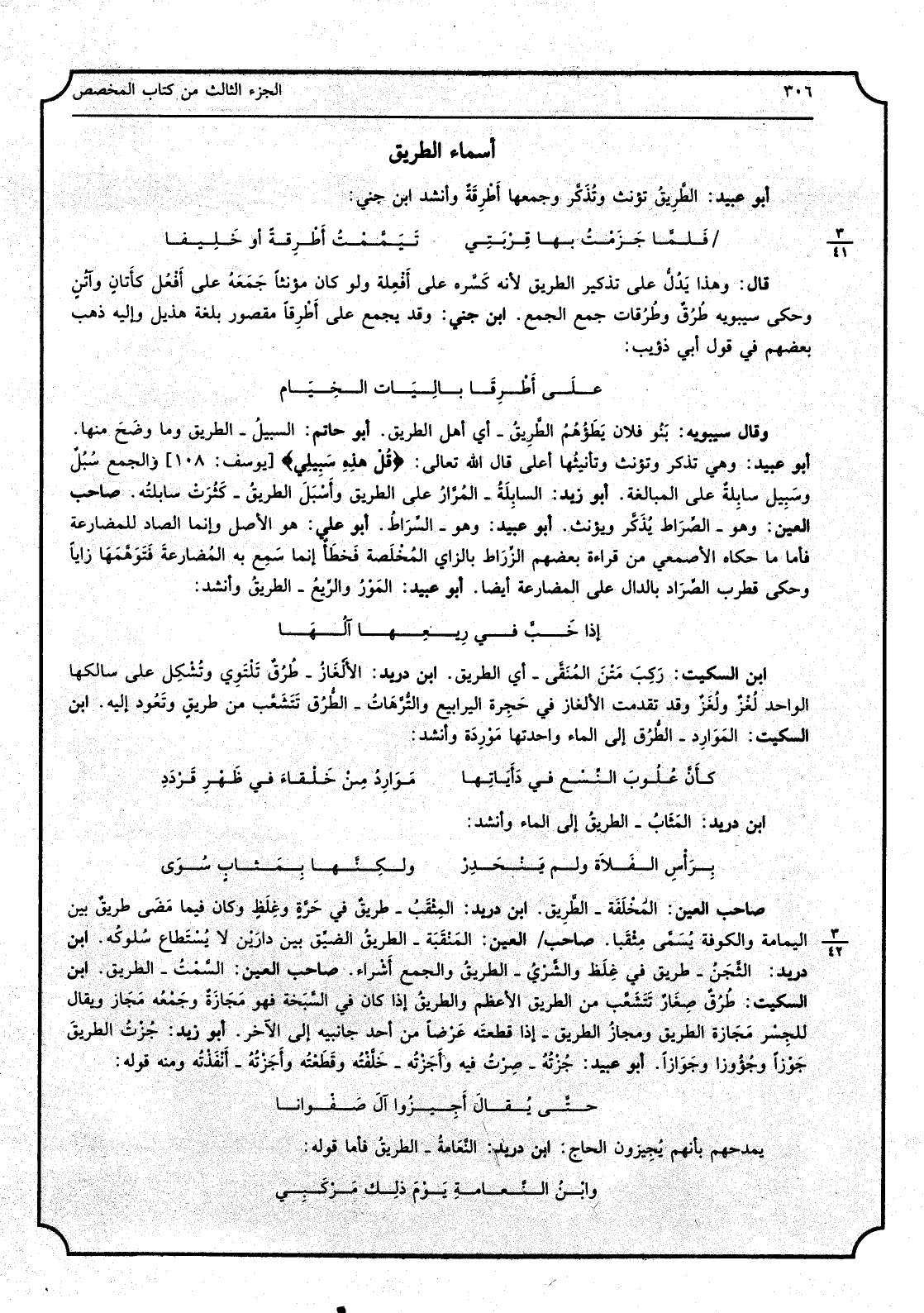 أَبُو عبيد: الطَّرِيق تؤنّث وتذكّر وَجَمعهَا أطرِقة وَأنْشد ابْن جني: فَلَمَّا جزمتُ بهَا قِربتي تيمّمْتُ أطرِقةً أَو خَليفا قَالَ: وَهَذَا يدلّ على تذكير الطَّرِيق لِأَنَّهُ كسّره على أفعلة وَلَو كَانَ مؤنثاً جمعه على أفعُل كأتان وآتُن وَحكى سِيبَوَيْهٍ طُرُق وطُرُقات جمع الْجمع. ابْن جني: وَقد يجمع على أطرِقاً مَقْصُور بلغَة هُذَيْل وَإِلَيْهِ ذهب بَعضهم فِي قَول أبي ذُؤَيْب: على أطْرِقا بالِيات الخِيام وَقَالَ سِيبَوَيْهٍ: بَنو فلَان يطؤهم الطّريق - أَي أهل الطَّرِيق. أَبُو حَاتِم: السَّبِيل - الطَّرِيق وَمَا وضح مِنْهَا. أَبُو عبيد: وَهِي تذكر وتؤنث وتأنيثُها أَعلَى قَالَ الله تالى) قل هَذِه سَبيلي (وَالْجمع سُبُل وسَبيل سابلة على الْمُبَالغَة. أَبُو زيد: السابِلة - المُرّار على الطَّرِيق وأسبَل الطَّرِيق - كثرت سابلته. صَاحب الْعين: وَهُوَ - الصِراط يُذكّر وَيُؤَنث. أَبُو عبيد: وَهُوَ - السِراط. أَبُو عَليّ: هُوَ الأَصْل وَإِنَّمَا الصَّاد للمضارعة فَأَما مَا حَكَاهُ الْأَصْمَعِي من قِرَاءَة بَعضهم الزِراط بالزاي المُخلَصة فخطأ إِنَّمَا سمع بِهِ المضارعة فتوهمها زاياً وَحكى قطرب الصّراد بِالدَّال على المضارعة أَيْضا. أَبُو عبيد: المَوْر والريعُ - الطَّرِيق وَأنْشد: إِذا خبّ فِي ريعِها آلُها ابْن السّكيت: ركب متنَ المنقّى - أَي الطَّرِيق. ابْن دُرَيْد: الألغاز - طرُق تلتوي وتُشكِل على سالكها الْوَاحِد لُغز ولغَز وَقد تقدّمت الألغاز فِي حجرَة اليرابيع والتُرّهات - الطُرق تتشعّب من طَرِيق وتعود إِلَيْهِ. ابْن السّكيت: الْمَوَارِد - الطّرق إِلَى المَاء واحدتها موردة وَأنْشد: كأنّ صُلوبَ النِسْع فِي دَأَياتها موارِدُ من خلْقاءَ فِي ظهر قرْدَدِ ابْن دُرَيْد: المَثاب - الطَّرِيق إِلَى المَاء وَأنْشد: برأسِ الفَلاة وَلم ينحدرْ وَلكنهَا بمثابٍ سُوى صَاحب الْعين: المخلَفة - الطَّرِيق. ابْن دُرَيْد: المِثقَب - طَرِيق فِي حرّة وغِلَظ وَكَانَ فِيمَا مضى طَرِيق بَين الْيَمَامَة والكوفة يسمّى مِثْقَبا. صَاحب الْعين: المَنقَبة - الطَّرِيق الضيّق بَين دارين لَا يُستطاع سُلوكه. ابْن دُرَيْد: الثّجَن - طَرِيق فِي غِلظ والشّرْي - الطَّرِيق وَالْجمع أشراء. صَاحب الْعين: السّمْت - الطَّرِيق. ابْن السّكيت: طُرق صِغار تتشعّب من الطَّرِيق الْأَعْظَم وَالطَّرِيق إِذا كَانَ فِي السّبخة فَهُوَ مجازة وَجمعه مَجاز وَيُقَال للجسر مَجازة الطَّرِيق ومجاز الطَّرِيق - إِذا قطعتَه عرْضاً من أحد جانبيه إِلَى الآخر. أَبُو زيد: جُزْت الطريقَ جوْزاً وجؤوزاً وجَوازاً. أَبُو عبيد: جُزتُه - صِرت فِيهِ وأجزْتُه - خلّفتُه وقطعْتُه وأجزْتُه - أنفذْتُه وَمِنْه قَوْله: حَتَّى يُقالَ أجيزوا آلَ صَفوانا يمدحهم بِأَنَّهُم يُجيزون الْحَاج. ابْن دُرَيْد: النّعامة - الطَّرِيق فَأَما قَوْله: وابنُ النّعامة يومَ ذَلِك مرْكَبي