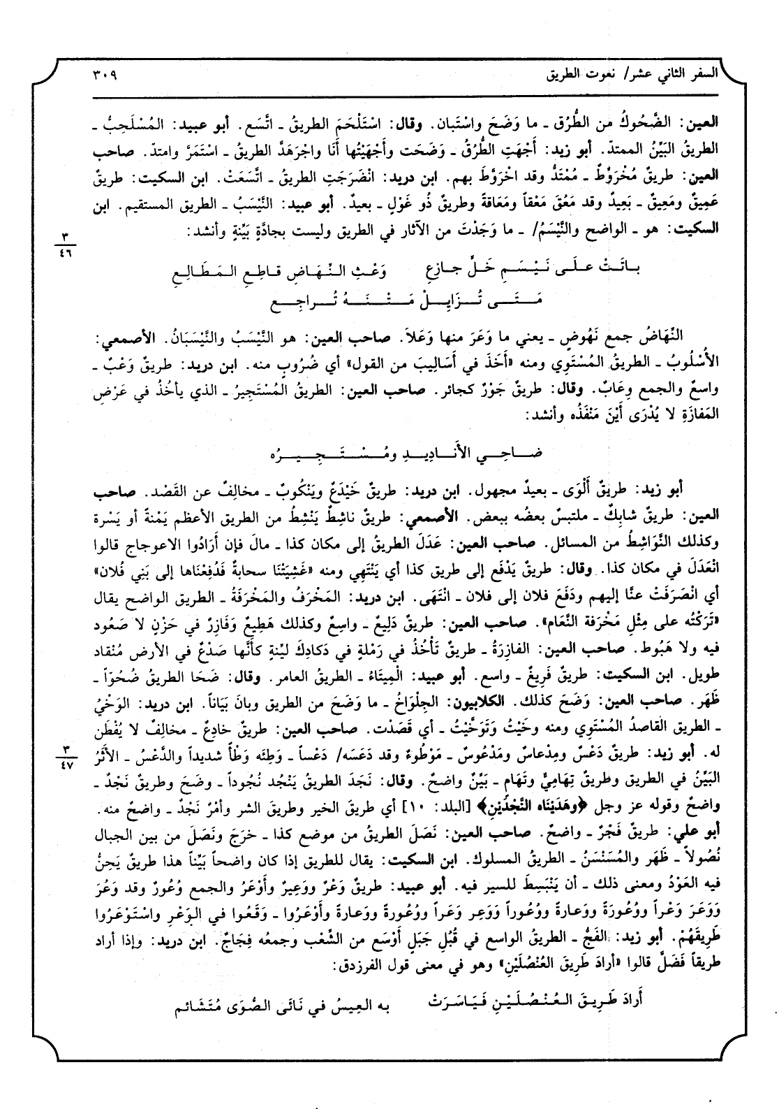 الْعين: الضّحوك من الطُرُق - مَا وضح واستبان. وَقَالَ: استلْحم الطَّرِيق - اتّسع. أَبُو عبيد: المُسلَحِبّ - الطَّرِيق البيّن الممتد. أَبُو زيد: أجْهَتِ الطُرُق - وضحت وأجهَيْتُها أَنا واجرَهدّ الطَّرِيق - استمرّ وامتد. صَاحب الْعين: طَرِيق مخروط - ممتد وَقد اخروّط بهم. ابند دُرَيْد: انضرَجتِ الطَّرِيق - اتّسعت. ابْن السّكيت: طَرِيق عميق ومَعيق - بعيد وَقد مَعُقَ مَعقاً ومَعاقة وَطَرِيق ذُو غَول - بعيد. أَبُو عبيد: النّيْسَب - الطَّرِيق الْمُسْتَقيم. ابْن السّكيت: هُوَ - الْوَاضِح والنّيسَم - مَا وجدتَ من الْآثَار فِي الطَّرِيق وَلَيْسَت بجادّة بيّنة وَأنْشد: باتَت على نيسم خلٍّ جازِع وعْثِ النِهاض قاطِعِ المَطالعِ مَتى تُزايلْ متنَه تُراجِع النِهاضُ جمع نَهوض - يَعْنِي مَا وعرَ مِنْهَا وعَلا. صَاحب الْعين: هُوَ النّيْسَب والنّيسَبان. الْأَصْمَعِي: الأسلوب - الطَّرِيق المستوي وَمِنْه أَخذ فِي أساليب من القَوْل: أَي ضُروب مِنْهُ. ابْن دُرَيْد: طَرِيق وعْب - وَاسع وَالْجمع وِعاب. وَقَالَ: طَرِيق جوْر كجائر. صَاحب الْعين: الطَّرِيق المُستجير - الَّذِي يَأْخُذ فِي عَرض المَفازة لَا يُدرى أَيْن منفذُه وَأنْشد: ضاحي الأناديد ومُستجيرُه أَبُو زيد: طَرِيق ألوى - بعيد مَجْهُول. ابْن دُرَيْد: طَرِيق خيدَع ويَنكوب - مُخَالف عَن الْقَصْد. صَاحب الْعين: طَرِيق شابك - ملتبس بعضه بِبَعْض. الْأَصْمَعِي: طَرِيق ناشط - ينشِط من الطَّرِيق الْأَعْظَم يَمنة أَو يَسرة وَكَذَلِكَ النّواشطُ من الْمسَائِل. صَاحب الْعين: عدَل الطَّرِيق إِلَى مَكَان كَذَا - مَال فَإِن أَرَادوا الاعوجاج قَالُوا انعدَل فِي مَكَان كَذَا. وَقَالَ: طَرِيق يدْفع إِلَى طَرِيق كَذَا أَي يَنْتَهِي وَمِنْه غشيَتْنا سَحَابَة فدُفِعْناها إِلَى بني فلَان أَي انصرفَتْ عَنَّا إِلَيْهِم وَدفع فلَان إِلَى فلَان. انْتهى. ابْن دُرَيْد: المَخْرفُ والمخرَفة - الطَّرِيق الْوَاضِح يُقَال تركته عَليّ مثلِ مخرَفة النّعام. صَاحب الْعين: طَرِيق دَليع - وَاسع وَكَذَلِكَ هَطيع وفازر فِي حَزْن لَا صَعود فِيهِ وَلَا هَبوط. صَاحب الْعين: الفارِزة - طَرِيق تَأْخُذ فِي رَملَة فِي دكادك ليّنة كَأَنَّهَا صدْع فِي الأَرْض منقاد طَوِيل. ابْن السّكيت: طَرِيق فَريغ - وَاسع. أَبُو عبيد: المِيتاءُ - الطَّرِيق العامر. وَقَالَ: ضحا الطَّرِيق ضُحوّاً - ظهر. صَاحب الْعين: وضح كَذَلِك. الكلابيون: الجِلواخُ - مَا وضحَ من الطَّرِيق وَبَان بَيَانا. ابْن دُرَيْد: الوخْي - الطَّرِيق القاصد المُستوي وَمِنْه وخيْتُ وتوخّيت - أَي قصدْت. صَاحب الْعين: طَرِيق خَادع - مُخَالف لَا يُفْطَن لَهُ. أَبُو زيد: طَرِيق دَعْس ومِدعاس ومدعوس - موطوء وَقد دعسَه دعْساً - وطِئه وطأً شَدِيدا والدّعْس - الْأَثر البيّن فِي الطَّرِيق وَطَرِيق تِهامي وتِهام - بيّن وَاضح. وَقَالَ: نجدَ الطَّرِيق ينجُد نُجوداً - وضح وَطَرِيق نجد - وَاضح وَقَوله عز وَجل) وهديْناه النّجْدَين (أَي طَرِيق الْخَيْر وَطَرِيق الشَّرّ وأمرٌ نجْد - وَاضح مِنْهُ. أَبُو عَليّ: طَرِيق فجْرٌ - وَاضح. صَاحب الْعين: نصَل الطَّرِيق من مَوضِع كَذَا - خرج ونصَل من بَين الْجبَال نُصولاً - ظهر والمُسَنْسَن - الطَّرِيق المسلوك. ابْن السّكيت: يُقَال للطريق إِذا كَانَ وَاضحا بيّناً هَذَا طَرِيق يحنّ فِيهِ العَوْد وَمعنى ذَلِك - أَن ينبسط للسير فِيهِ. أَبُو عبيد: طَرِيق وعْز ووعِير وأوعَر وَالْجمع وُعور وَقد وَعُر ووعَر وعْراً ووعورَة ووَعارة ووعوراً ووَعِر وَعَراً ووعورة ووَعارة وأوعَروا - وَقَعُوا فِي الوعْر واستوعَروا طريقهم. أَبُو زيد: الفجّ - الطَّرِيق الْوَاسِع فِي قُبُل جبلٍ أوسع من الشِّعْب وَجمعه فِجاج. ابْن دُرَيْد: وَإِذا أَرَادَ طَرِيقا فضَلّ قَالُوا أَرَادَ طَرِيق العُنصُلَين وَهُوَ فِي معنى قَول الفرزدق: أَرَادَ طريقَ العُنصُلين فياسَرَتْ بِهِ العيسُ فِي ناني الصّوى متشائم