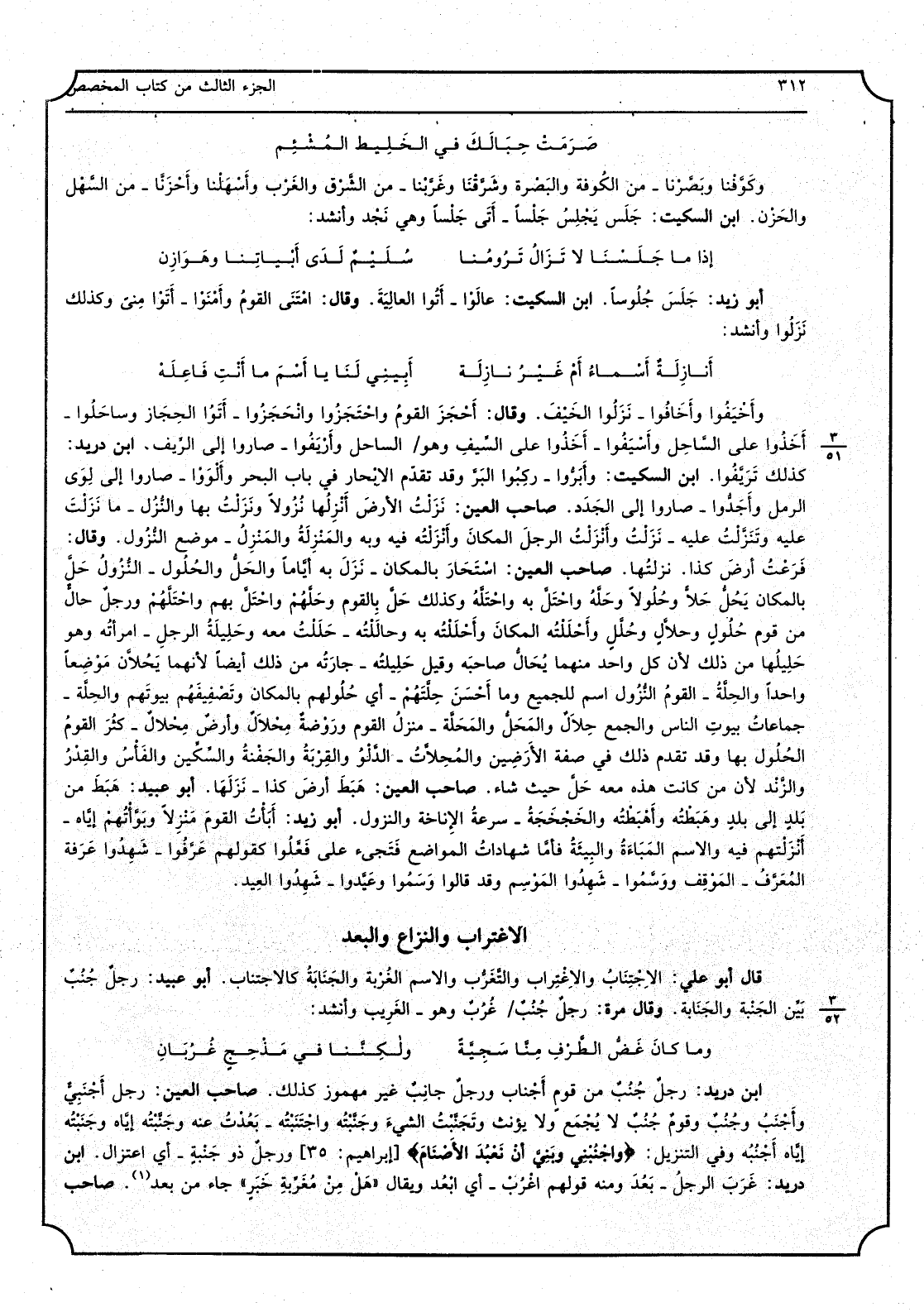 صرمَتْ حبالكَ فِي الخليط المُشئمِ وكوّفنا وبصّرنا - من الْكُوفَة وَالْبَصْرَة وشرّقنا وغرّبنا - من الشرق والغرب وأسهَلنا وأحزنّا - من السهل والحزْن. ابْن السّكيت: جلس يجلس جلْساً - أَتَى جلْساً وَهِي نجْد وَأنْشد: إِذا مَا جلسْنا لَا تزَال تَرومنا سُلَيم لَدَى أَبْيَاتنَا وهوازِن أَبُو زيد: جلس جُلوساً. ابْن السّكيت: عالَوا - أَتَوا الْعَالِيَة. وَقَالَ: امتَنى الْقَوْم وأمنَنوا - أَتَوا منى وَكَذَلِكَ نزلُوا وَأنْشد: أنازلة أسماءُ أم غيرُ نازلهْ أبيني لنا يَا أسْمَ مَا أنتِ فاعِلَهْ وأخيَفوا وأخافوا - نزلُوا الْخيف. وَقَالَ: أحجزَ الْقَوْم واحتجزوا وانحجَزوا - أَتَوا الْحجاز وساحلوا - أخذُوا عل السَّاحِل وأسيَفوا - أخذُوا على السَّيْف وَهُوَ السَّاحِل وأريفوا - صَارُوا إِلَى الرِّيف. ابْن دُرَيْد: كَذَلِك تريّفوا. ابْن السّكيت: وأبرّوا - ركبُوا البرّ وَقد تقدم الإبحار فِي بَاب الْبَحْر وألوَوا - صَارُوا إِلَى لِوى الرمل وأجدّوا - صَارُوا إِلَى الجدَد. صَاحب الْعين: نزلْتُ الأَرْض أنزِلُها نُزولاً ونزلْت بهَا والنُّزُل - مَا نزلت عَلَيْهِ وتنزّلْت عَلَيْهِ - نزلْت وأنزَلْت الرجل المكانَ وأنزلْته فِيهِ وَبِه والمنزلة والمنزِل - مَوضِع النّزول. وَقَالَ: فرعْت أرضَ كَذَا - نزلتها. صَاحب الْعين: استحار بِالْمَكَانِ - نزل بِهِ أَيَّامًا والحلُّ والحُلول - النُّزُول حلّ بِالْمَكَانِ يحُلّ حلا وحُلولاً وحلّه واحتلّ بِهِ واحتله وَكَذَلِكَ حلّ بالقوم وحلّهُم واحتلّ بهم واحتلهُم وَرجل حالُّ من قوم حُلولٍ وحلالٍ وحُلّل وأحللته الْمَكَان وأحللته بِهِ وحاللته - حللتُ مَعَه وحَليلة الرجل - امْرَأَته وَهُوَ حَليلها من ذَلِك لِأَن كل وَاحِد مِنْهُمَا يُحالُّ صاحبَه وَقيل حَليلتُه - جارته من ذَلِك أَيْضا لِأَنَّهُمَا يحُلاّن موضعا وَاحِدًا والحِلّة - الْقَوْم النّزول اسْم للْجَمِيع وَمَا أحسنَ حلّتَهُم - أَي حُلولهم بِالْمَكَانِ وتصفيفَهم بيوتَهم والحلّة - جماعات بيُوت النَّاس وَالْجمع حِلال والمحَلُّ والمحَلّة - منزل الْقَوْم وروضة مِحلال وأرضٌ مِحلال - كثُر الْقَوْم الحُلول بهَا وَقد تقدم ذَلِك فِي صفة الْأَرْضين والمُحِلاّتُ - الدّلو والقِربة والجفْنة والسّكين والفأس والقِدر والزّنْدلان من كَانَت هَذِه مَعَه حلّ حَيْثُ شَاءَ. صَاحب الْعين: هَبَط أَرض كَذَا - نزلها. أَبُو عبيد: هَبَط من بلد إِلَى بلد وهبطْتُه وأهبطتُه والخجخجة - سرعَة الإناخة وَالنُّزُول. أَبُو زيد: أبأتُ القومَ منزِلاً وبوّأتُهم إيّاه - أنزلتهم فِيهِ وَالِاسْم المَباءة والبيئة فَأَما شَهَادَات الْمَوَاضِع فتجيء على فعّلوا كَقَوْلِهِم عرّفوا - شهِدوا عرَفه المُعرَّف - الْموقف ووسّموا - شهِدوا الموسِم وَقد قَالُوا وسَموا وعيّدوا - شهِدوا الْعِيد.