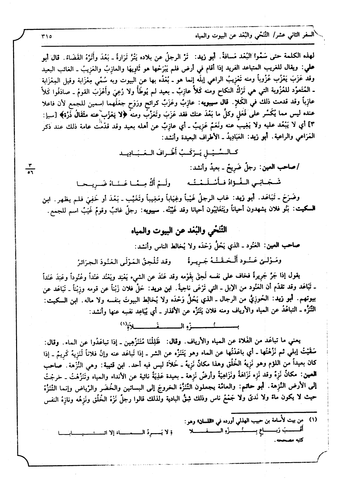 صَاحب الْعين: العَنود - الَّذِي يحلّ وحدَه وَلَا يُخالط النَّاس وَأنْشد: وَمولى عَنود ألحقَتْهُ جريرة وَقد تُلحِقُ الموْلى العَنودَ الجَرائرُ يَقُول إِذا جرّ جريرةً فخاف على نَفسه لحِقَ بقَوْمه وَقد عِنْد عَن الشَّيْء يعنِد ويعنُد عنْداً وعُنوداً وعنِد عنَداً - تبَاعد وَقد تقدّم أَن العَنود من الْإِبِل - الَّتِي ترعى نَاحيَة. ابْن دُرَيْد: حلّ فلَان زَبْناً عَن قومه وزِبْناً - تبَاعد عَن بُيُوتهم. أَبُو زيد: الحوزيّ من الرِّجَال - الَّذِي يحلّ وحدَه وَلَا يخالط الْبيُوت بِنَفسِهِ وَلَا مَاله. ابْن السّكيت: التنزّه - التباعد عَن الْمِيَاه والأرياف وَمِنْه فلَان يتنزّه عَن الأقذار - أَي يُباعد نَفسه عَنْهَا وَأنْشد: بنُزهِ الفَلاة، يَعْنِي مَا تبَاعد من الفلاة عَن الْمِيَاه والأرياف. وَقَالَ: ظلِلْنا متنزّهين - إِذا تباعدوا عَن المَاء. وَقَالَ: سقيتُ إبلي ثمَّ نزّهتُها - أَي باعدْتُها عَن المَاء وَهُوَ يتنزّه عَن الشَّرّ - إِذا تبَاعد عَنهُ وإنّ فلَانا لنزيه كريم - إِذا كَانَ بَعيدا من اللوم وَهُوَ نزيه الخُلُق وَهَذَا مَكَان نزيه - خلاء لَيْسَ فِيهِ أحد. ابْن قُتَيْبَة: وَهِي النُزْهة. صَاحب الْعين: مَكَان نزِه وَقد نزِه نَزاهَة ونزاهِية وَأَرْض نزِهة - بعيدَة عذِبة نائية عَن الأنداء والمياه وتنزّهْت - خرجْت إِلَى الأَرْض النّزِهة. أَبُو حَاتِم: والعامّة يجْعَلُونَ التنزّه الْخُرُوج إِلَى الْبَسَاتِين والخُضَر والرياض وَإِنَّمَا التنزّه حَيْثُ لَا يكون مَاء وَلَا ندًى وَلَا جمع نَاس وَذَلِكَ شِقّ الْبَادِيَة وَلذَلِك قَالُوا رجل نزْه الخُلُق ونزِهُه ونازِه النَّفس