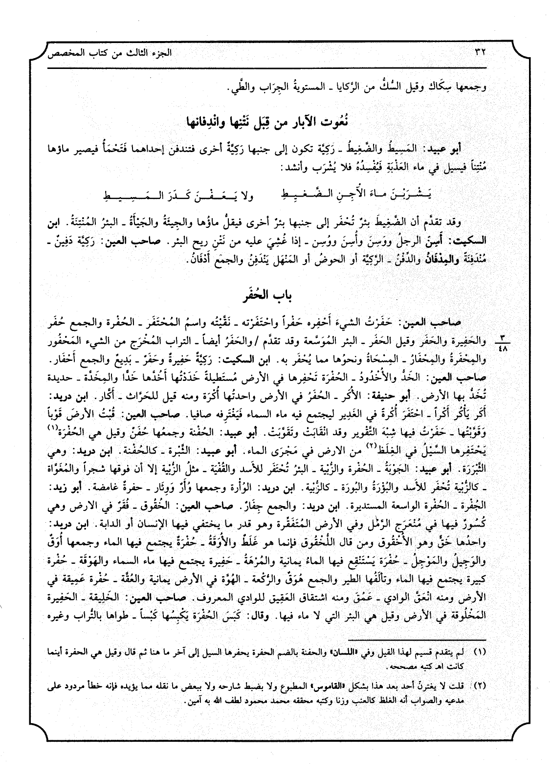 صَاحب الْعين حفرت الشَّيْء أحفره حفراً واحتفرته - نقيته وَاسم المحتفر - الحفرة وَالْجمع حفر والحفيرة والحفر وَقيل الحفرة - الْبِئْر الموسعة وَقد تقدم والحفر أَيْضا - التُّرَاب الْمخْرج من الشَّيْء المحفور والمحفرة والمحفار - المسحاة وَنَحْوهَا مِمَّا يحْفر بِهِ ابْن السّكيت ركية حفيرة وحفر - بديع وَالْجمع أحفار صَاحب الْعين الخد وَالْأُخْدُود - الحفرة تحفرها فِي الأَرْض مستطيلة خددتها أخدها خداً والمخدة - حَدِيدَة تخد بهَا الأَرْض أَبُو حنيفَة الأكر - الْحفر فِي الأَرْض واحدتها أكرة وَمِنْه قيل للحراث أكار ابْن دُرَيْد أكر يأكر أكراً إحتفر أكرةً فِي الغدير ليجتمع فِيهَا مَاء السَّمَاء فيغترفه صافياً صَاحب الْعين قبت الأَرْض قوباً وقوبتها - حفرت فِيهَا شبه التقوير وَقد انقابت وتقوبت أَبُو عبيد الحفنة وَجَمعهَا حفن وَقيل هِيَ الحفرة يحتفرها السَّيْل فِي الغلظ من الأَرْض فِي مجْرى المَاء أَبُو عبيد الثبرة - كالحفنة ابْن دُرَيْد وَهِي الثبرة أَبُو عبيد الجوبة - الحفرة والزبية - الْبِئْر تحتفر للأسد والقفية - مثل الزبية إِلَّا أَن فَوْقهَا شَجرا والمغواة - كالزبية تحفر للأسد والبؤرة والبورة - كالزبية ابْن دُرَيْد الوأرة وَجَمعهَا وأر ووئار - حُفْرَة غامضة أَبُو زيد الجفرة - الحفرة الواسعة المستديرة ابْن دُرَيْد وَالْجمع جفار صَاحب الْعين الْحُقُوق - فقر فِي الأَرْض وَهِي كسور فِيهَا فِي منعرج الرمل وَفِي الأَرْض المتقفرة وَهُوَ قدر مَا يختفي فِيهَا الانسان أَو الدَّابَّة ابْن دُرَيْد وَاحِدهَا خق وَهُوَ الأخقوق وَمن قَالَ اللخقوق فَإِنَّمَا هُوَ غلط والأوقة - حُفْرَة يجْتَمع فِيهَا المَاء وَجَمعهَا أوق والوجيل والموجل - حُفْرَة يستنقع فِيهَا المَاء يَمَانِية والمرهة - حفيرة يجْتَمع فِيهَا مَاء السَّمَاء والهوقة - حُفْرَة كَبِيرَة يجْتَمع فِيهَا المَاء وتألفها الطير وَالْجمع هوق والركعة - الهوة فِي الأَرْض يَمَانِية والعقة - حُفْرَة عميقة فِي الأَرْض وَمِنْه انعق الْوَادي - عمق وَمِنْه اشتقاق العقيق للوادي الْمَعْرُوف صَاحب الْعين الخليقة - الحفيرة المخلوقة فِي الأَرْض وَقيل هِيَ الْبِئْر الَّتِي لَا مَاء فِيهَا وَقَالَ كبس الحفرة يكبسها كبساً - طواها بِالتُّرَابِ وَغَيره