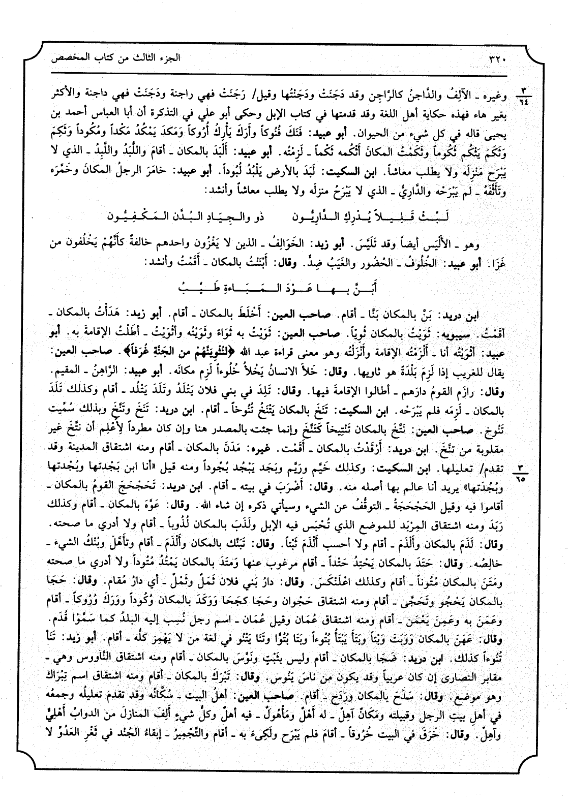 وَغَيره - الآلِف والدّاجن كالرّاجِن وَقد دجَنَتْ ودجَنْتُها وَقيل رجنَتْ فَهِيَ راجنة ودجَنَتْ فَهِيَ داجنة وَالْأَكْثَر بِغَيْر هَاء فَهَذِهِ حِكَايَة أهل اللُّغَة وَقد قدمتها فِي كتاب الْإِبِل وَحكى أَبُو عَليّ فِي التَّذْكِرَة أَن أَبَا الْعَبَّاس أَحْمد بن يحيى قَالَه فِي كل شَيْء من الْحَيَوَان. أَبُو عبيد: فنَكَ فُنوكاً وأرّك يأرِك أُروكاً ومكَد يمكُد مكْداً ومُكوداً وثَكِم وثكَم يثْكُم ثُكوماً وثكَمْت الْمَكَان أثكُمه ثَكْماً - لَزِمته. أَبُو عبيد: ألبدَ بِالْمَكَانِ - أَقَامَ واللُبَد واللّبِد - الَّذِي لَا يبرح منزلَه وَلَا يطْلب معاشاً. ابْن السّكيت: لبدَ بِالْأَرْضِ يلبُد لُبوداً. أَبُو عبيد: خامرَ الرجل المكانَ وخمّره وتأثّفه - لم يبرحْه والدّاريّ - الَّذِي لَا يبرَح منزله وَلَا يطْلب معاشاً وَأنْشد: لبِّثْ قَلِيلا يُدرِكِ الدّاريّون ذَوُو الجِياد البُدّن المكْفِيّون وَهُوَ - الألْيَس أَيْضا وَقد تليّس. أَبُو زيد: الخَوالِف - الَّذين لَا يغْزون واحدهم خالفة كأنهُم يخلُفون من غَزا. أَبُو عبيد: الخُلوف - الحُضور والغيَب ضدّ. وَقَالَ: أبنَنْتُ بِالْمَكَانِ - أقمتُ وَأنْشد: أبَنّ بهَا عوْدَ المَباءةِ طيّبُ ابْن دُرَيْد: بَنّ بِالْمَكَانِ بَنّاً - أَقَامَ. صَاحب الْعين: أخلطَ بِالْمَكَانِ - أَقَامَ. أَبُو زيد: هدَأتُ بِالْمَكَانِ - أَقمت. سِيبَوَيْهٍ: ثوَيْت بِالْمَكَانِ ثُويّاً. صَاحب الْعين: ثوَيْت بِهِ ثَواءً وثوَيْته وأثوَيْت - أطلتُ الْإِقَامَة بِهِ. أَبُو عبيد: أثوَيْتُه أَنا - ألزمْتُه الْإِقَامَة وأنزلْتُه وَهُوَ معنى قِرَاءَة عبد الله) لنُثويَنّهُم من الجنّة غُرَفاً (. صَاحب الْعين: يُقَال للغريب إِذا لزِم بَلْدَة هُوَ ثاويها. وَقَالَ: خلأ الْإِنْسَان يخلأ خُلوءاً لزم مَكَانَهُ. أَبُو عبيد: الرّاهِن - الْمُقِيم. وَقَالَ: رازَم الْقَوْم دَارهم - أطالوا الْإِقَامَة فِيهَا. وَقَالَ: تلِدَ فِي بني فلَان يتْلَد وتلَدَ يتلُد - أَقَامَ وَكَذَلِكَ تلَد بِالْمَكَانِ - لزِمَه فَلم يبرَحْه. ابْن السّكيت: تنَخَ بِالْمَكَانِ يتْنَخُ تُنوخاً - أَقَامَ. ابْن دُرَيْد: تنَخَ وتنّخ وَبِذَلِك سُمّيت تَنوخ. صَاحب الْعين: نتْخَ بِالْمَكَانِ تنْتيخاً كتنّخ وَإِنَّمَا جِئْت بِالْمَصْدَرِ هُنَا وَإِن كَانَ مطرداً لأُعْلِم أَن نتّخ غير مَقْلُوبَة من تنّخ. ابْن دُرَيْد: أرقدْتُ بِالْمَكَانِ - أَقمت. غَيره: مدَن بِالْمَكَانِ - أَقَامَ وَمِنْه اشتقاق الْمَدِينَة وَقد تقدم تعليلها. ابْن السّكيت: وَكَذَلِكَ خيّم وريّم وبَجَد يبجُد بُجوداً وَمِنْه قيل أَنا ابْن بجدتها وبُجدتها وبجُدَتها، يُرِيد أَنا عَالم بهَا أَصله مِنْهُ. وَقَالَ: أضرَبَ فِي بَيته - أَقَامَ. ابْن دُرَيْد: تحَجْحَج الْقَوْم بِالْمَكَانِ - أَقَامُوا فِيهِ وَقيل الحَجحَجة - التوقّف عَن الشَّيْء وَسَيَأْتِي ذكره إِن شَاءَ الله. وَقَالَ: عوّهَ بِالْمَكَانِ - أَقَامَ وَكَذَلِكَ ربَد وَمِنْه اشتقاق المِربَد للموضع الَّذِي تُحبَس فِيهِ الْإِبِل ولذَب بِالْمَكَانِ لُذوباً - أَقَامَ وَلَا أَدْرِي مَا صِحَّته. وَقَالَ: لذَم بِالْمَكَانِ وألذَم - أَقَامَ وَلَا أَحسب ألْذَم ثَبْتاً. وَقَالَ: تبنّك بِالْمَكَانِ وألذَم - أَقَامَ وتأهّل وبُنْك الشَّيْء - خالصُه. وَقَالَ: حتَدَ بِالْمَكَانِ يحتِد حتْداً - أَقَامَ مَرْغُوب عَنْهَا ومتَد بِالْمَكَانِ يمْتُد مُتوداً وَلَا أَدْرِي مَا صِحَّته ومتَن بِالْمَكَانِ مُتوناً - أَقَامَ وَكَذَلِكَ اعْلَنْكس. وَقَالَ: دارُ بني فلَان ثَمَل وثَمْل - أَي دَار مُقام. وَقَالَ: حَجا بِالْمَكَانِ يحجو وتحجّى - أَقَامَ وَمِنْه اشتقاق حَجْوان وحَجا كجَحا ووَكَد بِالْمَكَانِ وُكوداً وورَك وُروكا - أَقَامَ وعمَن بِهِ وعمِن يعمَن - أَقَامَ وَمِنْه اشتقاق عُمان وَقيل عُمان - اسْم رجل نُسب إِلَيْهِ الْبَلَد كَمَا سمّوا قُدَم. وَقَالَ: عهَن بِالْمَكَانِ ووَبَت وَبْتاً 