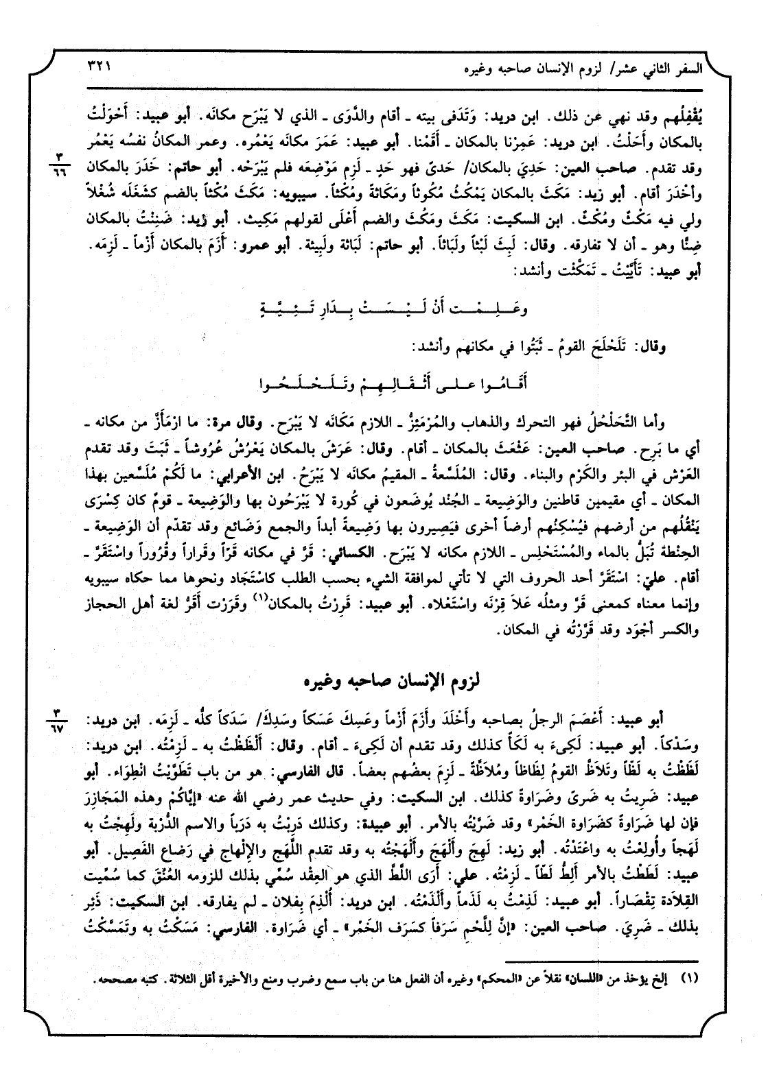 يُقفِلُهم وَقد نهى عَن ذَلِك. ابْن دُرَيْد: وتَدَ فِي بَيته - أَقَامَ والدّوى - الَّذِي لَا يبرَح مَكَانَهُ. أَبُو عبيد: أحْوَلْت بِالْمَكَانِ وأحلْت. ابْن دُرَيْد: عمِرْنا بِالْمَكَانِ - أَقَمْنَا. أَبُو عبيد: عمَر مكانَه يعْمُره وعمَر المكانُ نفسُه يعمُر وَقد تقدم. صَاحب الْعين: حدِيَ بِالْمَكَانِ حدًى فَهُوَ حَدٍ - لزِم موضعَه فَلم يبرَحْه. أَبُو حَاتِم: خدَر بِالْمَكَانِ وأخْدَر أَقَامَ. أَبُو زيد: مكث بِالْمَكَانِ يمكُث مُكوثاً ومكاثةً ومُكْثاً. سِيبَوَيْهٍ: مكث مُكثاً بِالضَّمِّ كشغلَه شُغْلاً ولي فِيهِ مكْث ومُكث. ابْن السّكيت: مكث ومكُث وَالضَّم أَعلَى لقَولهم مَكيث. أَبُو زيد: ضنِنْت بِالْمَكَانِ ضِنّاً وَهُوَ - أَن لَا تُفَارِقهُ. وَقَالَ: لبِثَ لَبْثاً ولَباثاً. أَبُو حَاتِم: لَباثة ولَبيثة. أَبُو عَمْرو: أزَم بِالْمَكَانِ أزْماً - لزِمَه. أَبُو عبيد: تأيّيْت - تمكّثْت وَأنْشد: وعلِمْت أنْ ليسَتْ بدارِ تئيّة وَقَالَ: تلحْلَح الْقَوْم - ثبتوا فِي مكانهم وَأنْشد: أَقَامُوا على أثقالهم وتلحْلَحوا وَأما التحلْحُل فَهُوَ التحرك والذهاب والمُرْمَئزّ - اللَّازِم مَكَانَهُ لَا يبرَح. وَقَالَ مرّة: مَا ارمأزّ من مَكَانَهُ - أَي مَا برِح. صَاحب الْعين: عثْعَث بِالْمَكَانِ - أَقَامَ. وَقَالَ: عرَش بِالْمَكَانِ يعرُش عُروشاً - ثَبت وَقد تقدم العرْش فِي الْبِئْر والكرْم وَالْبناء. وَقَالَ: المُلسّعة - الْمُقِيم مكانَه لَا يبرَح. ابْن الْأَعرَابِي: مَا لَكُم ملسّعين بِهَذَا الْمَكَان - أَي مُقيمين قاطنين والوَضيعة - الجُند يوضَعون فِي كورة لَا يبْرَحون بهَا والوَضيعة - قوم كَانَ كسْرَى ينقُلهم من أَرضهم فيُسكِنُهم أَرضًا أُخْرَى فيَصيرون بهَا وضيعة أبدا وَالْجمع وضائع وَقد تقدّم أَن الوضيعة - الحِنطة تُبَلّ بِالْمَاءِ والمُستَحْلِس - اللَّازِم مَكَانَهُ لَا يبرح. الْكسَائي: قرّ فِي مَكَانَهُ قرّاً وقَراراً وقُروراً واستقرّ - أَقَامَ. عَليّ: استقرّ أحد الْحُرُوف الَّتِي لَا تَأتي لموافقة الشَّيْء بِحَسب الطّلب كاسْتجاد وَنَحْوهَا مِمَّا حَكَاهُ سِيبَوَيْهٍ وَإِنَّمَا مَعْنَاهُ كمعنى قرّ ومثلُه عَلا قِرنَه واستَعْلاه. أَبُو عبيد: قَرِرْت بِالْمَكَانِ وقرَرْت أقرّ لُغَة أهل الْحجاز وَالْكَسْر أجْود وَقد قرّرْتُه فِي الْمَكَان.
