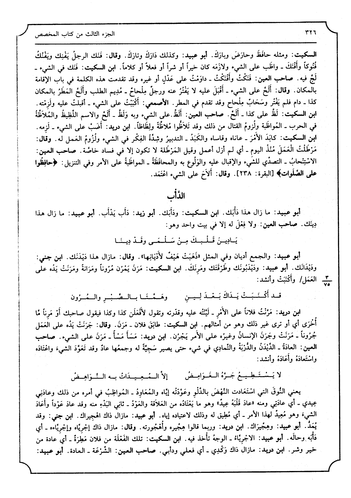 أَبُو عبيد: مازال هَذَا دأبَك. ابْن السّكيت: ودأَبَك. أَبُو زيد: دأَب يدْأَب. أَبُو عبيد: مازال هَذَا دِينَك. صَاحب الْعين: وَلَا فِعل لَهُ إِلَّا فِي بَيت وَاحِد وَهُوَ: يَا دِينَ قلبكَ من سلمى وَقد دِينا أَبُو عبيد: وَالْجمع أَدْيَان وَفِي الْمثل) ذهبَتْ هَيْفٌ لأدْيانها (. وَقَالَ: مازال هَذَا ديدَنَك. ابْن جني: ودَيدانَك. أَبُو عبيد: ودَيدَبونك وطرْقَتَك ومَرِنَك. ابْن السّكيت: مرَن يمرُن مُروناً ومَرانةً ومرَنَتْ يدُه على الْعَمَل وأكْنبَتْ وَأنْشد: قد أكنَبَتْ يَداك بعد لِين وهمّتا بالصّبر والمُرون ابْن دُرَيْد: مرّنْت فلَانا على الْأَمر - ليّنْتُه عَلَيْهِ وَقدرته وَتقول لأفعلَن كَذَا وَكَذَا فَيَقُول صَاحبك أَو مَرِناً مّا أُخْرَى أَي أَو ترى غير ذَلِك وَهُوَ من أمثالهم. ابْن السّكيت: طابقَ فلَان - مرَن. وَقَالَ: جرَنتْ يدُه على الْعَمَل جُروناً - مرَنَتْ وجرَن الْإِنْسَان وغيرُه على الْأَمر يجْرُن. ابْن دُرَيْد: مسَأ مسْأً - مرَن على الشَّيْء. صَاحب الْعين: الْعَادة - الدّيدَن والدُرْبَة والتّمادي فِي شَيْء حَتَّى يصير سجيّة لَهُ وجمعُها عادٌ وَقد تعوّد الشيءَ واعْتادَه واستعادَه وأعادَه وَأنْشد: لَا يستطيعُ جرَّه الغَوامِضُ إِلَّا المُعيداتُ بِهِ النّواهِضُ يَعْنِي النّوقَ الَّتِي استعادت النّهْضَ بالدّلو وعوّدْتُه إِيَّاه والمُعاوِد - المواظِب فِي أمره من ذَلِك وعادَني عِيدي - أَي عادتي وَمِنْه عَاد قلبَه عيدٌ وَهُوَ مَا يعتادُه من العَلاقة والعَوْد - ثَانِي البَدْء مِنْهُ وَقد عَاد عَوْداً وَأعَاد الشيءَ وَهُوَ مُعيد لهَذَا الْأَمر - أَي مُطيق لَهُ وَذَلِكَ لاعتياده إِيَّاه. أَبُو عبيد: مازال ذَاك إهْجِيراك. ابْن جني: وَقد يُمدّ. أَبُو عبيد: وهِجّيراك. ابْن دُرَيْد: وَرُبمَا قَالُوا هِجّيره وأُهجُورته. وَقَالَ: مازال ذَاك إجْرِيّاه وإجْرِيّاءه - أَي دأبَه وحالَه. أَبُو عبيد: الإجْرِيّاءُ - الْوَجْه تَأْخُذ فِيهِ. ابْن السّكيت: تِلْكَ الفَعْلة من فلَان مطِرة - أَي عَادَة من خير وَشر. ابْن دُرَيْد: مازال ذَاك وكْدي - أَي فعلي ودأبي. صَاحب الْعين: الشِرْعة - الْعَادة. أَبُو عبيد: