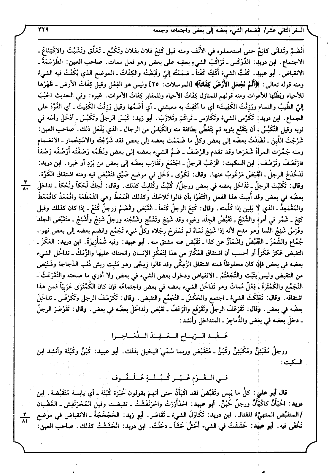 انضمّ وتدانى كانِع حَتَّى استعملوه فِي الْأنف وَمِنْه قيل كنِع فلَان بفلان وتكنّع - تعلّق وتشبّث والاكتِناع - الِاجْتِمَاع. ابْن دُرَيْد: الدّوْكَس - تراكُب الشَّيْء بعضِه على بعض وَهُوَ فعل ممات. صَاحب الْعين: الطّرْسَمة - الانقباض. أَبُو عبيد: كفَتّ الشيءَ أكفِتُه كفْتاً - ضممتُه إليّ وقبَضْتُه والكِفات - الْموضع الَّذِي يُكفَت فِيهِ الشَّيْء وَمِنْه قَوْله تَعَالَى) ألم نجعلِ الأرضِ كِفاتاً (وَلَيْسَ هُوَ الْفِعْل وَقيل كِفاتُ الأَرْض - ظهرُها للأحياء وبطنُها للأموات وَمِنْه قَوْلهم للمنازل كِفات الْأَحْيَاء وللمقابر كِفات الْأَمْوَات. غَيره: وَفِي الحَدِيث) حُبِّبَ إليّ الطيبُ وَالنِّسَاء ورُزِقْت الكَفيت (أَي مَا أكفِت بِهِ معيشتي - أَي أضُمّها وَقيل رُزِقت الكَفيت - أَي القوّة على الْجِمَاع. ابْن دُرَيْد: تكرّس الشيءُ وتكارَس - تراكم وتلازَب. أَبُو زيد: كبَس الرجل وتكبّس - أدخلَ رأسَه فِي ثَوْبه وَقيل التكبُس - أَن يتقنّع بِثَوْبِهِ ثمَّ يتغطى بطَائفَة مِنْهُ والكُباس من الرِّجَال - الَّذِي يفعل ذَلِك. صَاحب الْعين: شرّجْتُ اللبِن - نضدْت بعضَه إِلَى بعض وكلّ مَا ضمَمْت بعضه إِلَى بعض فقد شرّجْتَه والاستِجْمار - الانضمام وَمِنْه جمّرَت الْمَرْأَة شعرَها وَقد تقدم والرّصْف - ضمّ الشَّيْء بعضه إِلَى بعض ونظْمُه رَصَفْتُه أرصُفه رصْفاً فارتَصَف وترصّف. ابْن السّكيت: اقرَعبّ الرجل - اجْتمع وتقارب بعضُه إِلَى بعض من برد أَو غَيره. ابْن دُرَيْد: تدخدَخ الرجل - انقبضَ مَرْغُوب عَنْهَا. وَقَالَ: تكوّى - دخل فِي مَوضِع ضيّق فتقبّض فِيهِ وَمِنْه اشتقاق الكَوّة. وَقَالَ: تكنْبَتَ الرجل - تدَاخل بعضه فِي بعض وَرجل كُنبُت وكُنابِت كَذَلِك. وَقَالَ: لحِكَ لحَكاً ولحْكاً - تدَاخل بعضُه فِي بعض وَقد أُميت هَذَا الْفِعْل واكتفَوا بِأَن قَالُوا تلاجَك وَكَذَلِكَ اقْمَعَطّ وَهِي القَمْعَطة واقمعَدّ كاقمعطّ والمُقمعدّ - الَّذِي لَا يلين إِذا كلّمته. وَقَالَ: كتِع الرجل كتَعاً - انقبض وانضمّ وَرجل كُتَع - إِذا كَانَ كَذَلِك وَقيل كتِع - شمّر فِي أمره والشّنَج - تقبّض الجِلد وَغَيره وَقد شنِج وتشنّج وشنّجْته وَرجل شنجٌ وأشنَج - متقبّض الْجلد وَفرس شنِج النَّسا وَهُوَ مدح لِأَنَّهُ إِذا شنج نَساه لم تسترِح رِجلاه وكل شَيْء تجمّع وانضمّ بعضه إِلَى بعض فَهُوَ - جُمّاع والشّمْز - التّقبّض واشمأزّ عَن كَذَا - تقبّض عَنهُ مُشْتَقّ مِنْهُ. أَبُو عبيد: وَفِيه شُمأزيزة. ابْن دُرَيْد: العَكَز - التقبض عكزَ عكَزاً أَو أَحسب أَن اشتقاق العُكاز من هَذَا لتعكّز الْإِنْسَان وانحنائه عَلَيْهَا والزّمَك - تداخُل الشَّيْء بعضه فِي بعض فَإِن كَانَ مَحْفُوظًا فَمِنْهُ اشتقاق الزِّمِكّى وَقد قَالُوا زِمجّى وَهُوَ منبِت ريش ذنَب الدّجاجة وشَنْيَص من التقبض وَلَيْسَ بثَبْت والنّجَعْثُم - الانقباض وَدخُول بعض الشَّيْء فِي بعض وَلَا أَدْرِي مَا صِحَّته والتّقرْعُث - التجمّع والكمْثَرة - فِعل مُمات وَهُوَ تدَاخل الشَّيْء بعضه فِي بعض واجتماعه فَإِن كَانَ الكُمّثْرى عربيّاً فَمن هَذَا اشتقاقه. وَقَالَ: تعنْكَثَ الشَّيْء - اجْتمع والحَكْش - التجمّع والتقبض. وَقَالَ: تكرْسَف الرجل وتكرْفس - تدَاخل بعضُه فِي بعض. وَقَالَ: تقرْعَف الرجل وتقرْفَع واقْرَعفّ - تقبّض وتداخل بعضُه فِي بعض. وَقَالَ: تقوْصَر الرجل - دخل بعضه فِي بعض والدُّماجِر - المتداخل وَأنْشد: عَقْد الرِّيَاح العَقِدَ الدُّماحِرا وَرجل مقْبَئنّ ومكْبَئنّ وكُبنّ - متقبّض وَرُبمَا سُمّي الْبَخِيل بذلك. أَبُو عبيد: كُبُنّ وكُبُنّة وَأنْشد ابْن السّكيت: فِي الْقَوْم غير كُبُنّة عُلفوف قَالَ أَبُو عَليّ: كلّ مَا يبس وتقبّض فقد اكْبأنّ حَتَّى أَنهم يَقُولُونَ خُبْزة كُبُنّة - أَي يابسة متقبّضة. ابْن دُرَيْد: اخبأنّ كاكْبأنّ وَرجل خُبُنّ. أَبُو عبيد: احذَأرَرْتُ واحرَنْفَشْت - تقبضت وَقيل المُخْرَنْفِش - الغضبان المتقبّض المتهيئ 