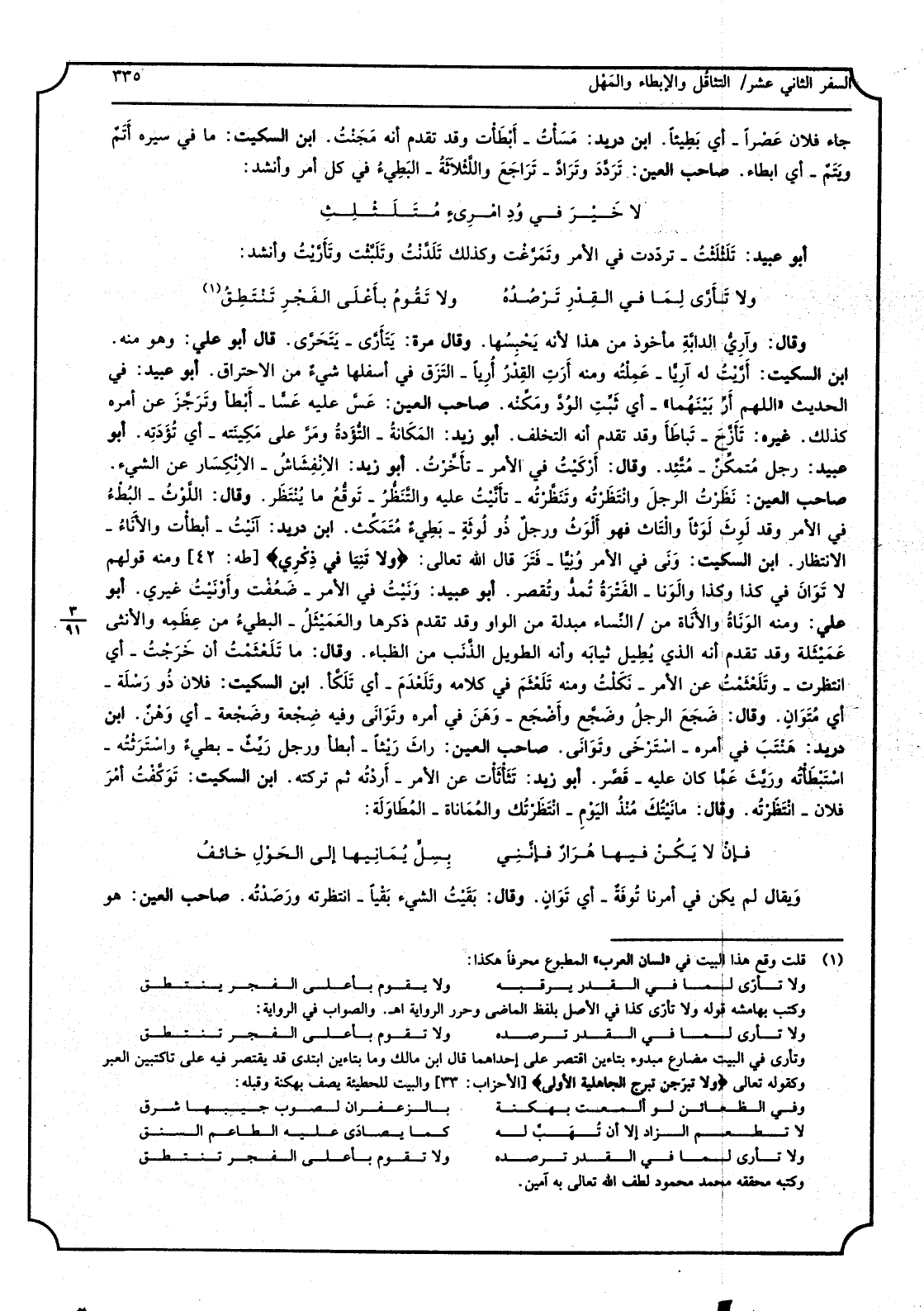 جَاءَ فلَان عصْراً - بطيئاً. ابْن دُرَيْد: مسَأت - أَبْطَأت وَقد تقدم أَنه مجَنت. ابْن السّكيت: مَا فِي سيره أتَمٌ ويتَمٌ - أَي إبطاء. صَاحب الْعين: تردّد وترادّ - ترجع واللّثْلاثة - البطيء فِي كل أَمر وَأنْشد: لَا خيرَ فِي وُدِ امرئٍ متَلثلثِ أَبُو عبيد: تلثلثْتُ - ترددت فِي الْأَمر وتمرّغت وَكَذَلِكَ تلدّنْتُ وتلبّثت وتارّيْتُ وَأنْشد: وَلَا تأرّى لِما فِي القِدر ترصُدُه وَلَا تقوم بِأَعْلَى الفجرِ تنتطِق قَالَ: وآريُّ الدابّة مَأْخُوذ من هَذَا لِأَنَّهُ يحبِسها. وَقَالَ مرّة: يتأرّى - يتحرّى. قَالَ أَبُو عَليّ: وَهُوَ مِنْهُ. ابْن السّكيت: أرّيْت لَهُ آريّاً - عملتُه وَمِنْه أرَتِ القِدر أرِياً - التزَق فِي أَسْفَلهَا شَيْء من الاحتراق. أَبُو عبيد: فِي الحَدِيث) اللَّهُمَّ أرِّ بَينهمَا (- أَي ثبّت الودّ ومكّنْه. صَاحب الْعين: عسّ عَلَيْهِ عسّاً - أَبْطَأَ وترجّز عَن أمره كَذَلِك. غَيره: تأزّح - تباطأ وَقد تقدم أَنه التَّخَلُّف. أَبُو زيد: المكانة - التُؤَدة ومرّ على مَكينته - أَي تُؤَدتِه. أَبُو عبيد: رجل متمكّن - متّئد. وَقَالَ: أرْكَيت فِي الْأَمر - تأخّرت. أَبُو زيد: الانفشاش - الانكسار عَن الشَّيْء. صَاحب الْعين: نظرْت الرجلَ وانتظرتُه وتنظّرته - تأنّيتُ عَلَيْهِ والتّنظّر - توقّع مَا يُنتظر. وَقَالَ: اللّوْث - البطء فِي الْأَمر وَقد لوِث لَوَثاً والْتاث فَهُوَ ألوَث وَرجل ذُو وُلوثة - بطيء متكّث. ابْن دُرَيْد: آنَيت - أَبْطَأت والأناء - الِانْتِظَار. ابْن السّكيت: ونَى فِي الْأَمر وُنيّاً - فتر قَالَ الله تَعَالَى) وَلَا تنِيا فِي ذكْري (وَمِنْه قَوْلهم لَا تَوانَ فِي كَذَا وَكَذَا والوَنا - الفترة تمدّ وتُقصر. أَبُو عبيد: وَنّيت فِي الْأَمر - ضعفْت وأوْنَيت غَيْرِي. أَبُو عَليّ: وَمِنْه الوَناة والأناء من النِساء مبدلة من الْوَاو وَقد تقدم ذكرهَا والعَميثَل - البطيء من عِظَمِه وَالْأُنْثَى عمَيْثَلة وَقد تقدم أَنه الَّذِي يُطيل ثيابَه وَأَنه الطَّوِيل الذّنَب من الظباء. وَقَالَ: مَا تلعْثَمتُ أَن خرجْتُ - أَي انتظرت - وتلعْثَمتُ عَن الْأَمر - نكلت وَمِنْه تلعثَم فِي كَلَامه وتلعْدَم - أَي تلكّأ. ابْن السّكيت: فلَان ذُو رَسْلة - أَي مُتوان. وَقَالَ: ضجَع الرجل وضجّع وأضجَع - وهَن فِي أمره وتوانى وَفِيه ضِجعة وضَجعة - أَي وهْن. ابْن دُرَيْد: هنْتَب فِي أمره - استرخى وتوانى. صَاحب الْعين: راثَ رَيثاً - أَبْطَأَ وَرجل ريّث - بطيء واستَرَثْتُه - استبطأتُه وريّث عمّا كَانَ عَلَيْهِ - قصّر. أَبُو زيد: تثأثأت عَن الْأَمر - أردته ثمَّ تركته. ابْن السّكيت: توكّفْت أَمر فلَان انتظرته. وَقَالَ: مانَيتُك مُنْذُ الْيَوْم - انْتَظَرْتُك والمُماناة - المُطاولة. فَإِن لَا يكُن فِيهَا هُرارٌ فإنّني بِسِلٍّ يُمانيها إِلَى الحَول خائفُ وَيُقَال لم يكن فِي أمرنَا توفة - أَي توانٍ. وَقَالَ: بقيتُ الشَّيْء بقيّاً - انتظرته ورصدْتُه. صَاحب الْعين: هُوَ -