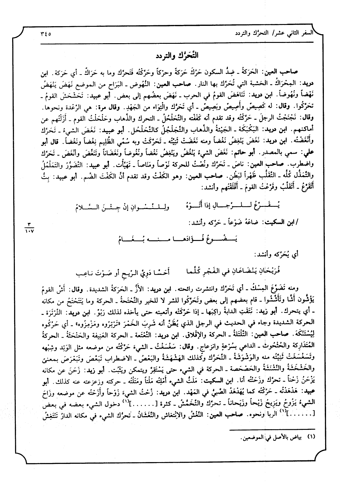 صَاحب الْعين: الْحَرَكَة - ضد السّكُون حرُك حرَكة وحرْكاً وحرّكته فتحرّك وَمَا بِهِ حَراك - أَي حَرَكَة. ابْن دُرَيْد: المِحراك - الْخَشَبَة الَّتِي تُحرّك بهَا النَّار. صَاحب الْعين: النّهوض - البَراح من الْموضع نَهَضَ ينهَض نهضاً ونُهوضاً. ابْن دُرَيْد: تناهض الْقَوْم فِي الْحَرْب - نَهَضَ بعضُهم إِلَى بعض. أَبُو عبيد: تحشحش الْقَوْم - تحرّكوا. وَقَالَ: لَهُ كَصيص وأصيص وبَصيص - أَي تحرّك والتِواء من الجَهد. وَقَالَ مرّة: هِيَ الرِعدة وَنَحْوهَا. وَقَالَ: نجنَجْت الرجل - حرّكته وَقد تقدم أَنه كففْته والتّحلْحُل - التحرك والذهاب وحلحَلتُ الْقَوْم - أزلتُهم عَن أماكنهم. ابْن دُرَيْد: البكْبَكَة - الجيئة والذّهاب والتّجلجُل كالتّحلحُل. أَبُو عبيد: نغضَ الشَّيْء - تحرّك وأنغضْتُه. ابْن دُرَيْد: نغضَ ينغِضُ نغْضاً وَمِنْه نغضَت ثنيّته - تحركت وَبِه سمي الظّليم نِغْضاً ونَغضاً. قَالَ أَبُو عَليّ: سمي بِالْمَصْدَرِ. أَبُو حَاتِم: نغضَ الشَّيْء ينغُضُ وينغِض نغْضاً ونُغوضاً ونَغَضاناً وتنغّض وأنغَض - تحرّك واضطرب. صَاحب الْعين: ناصَ - تحرّك ونُصْت للحركة نوْصاً ومَناصاً - تهيأت. أَبُو عبيد: التضوّر والتملْمُل والتمذّل كلّه - التقلّب ظَهراً لبطن. صَاحب الْعين: وَهُوَ الكفْت وَقد تقدم أَن الكفْت الضّم. أَبُو عبيد: بتّ أتقرّع - أتقلّب وقرّعْت الْقَوْم - أقلقْتُهم وَأنْشد: يُقَرّع للرِّجَال إِذا أَتَوْهُ وللنِسوان إِن جئن السّلام ابْن السّكيت: ضاعَه ضوْعاً - حرّكه وَأنْشد: يضوع فؤادها مِنْهُ بُغامُ أَي يحركه وَأنْشد: فُرَيخان ينْضاعان فِي الْفجْر كلّما أحسّا دويّ الريحِ أَو صوتَ ناعِب وَمِنْه تضوّع الْمسك - أَي تحرّك وانتشرت رَائِحَته. ابْن دُرَيْد: الأزّ - الْحَرَكَة الشَّدِيدَة. وَقَالَ: أشّ الْقَوْم يَؤشّون أشّاً وتأشّشوا - قَامَ بَعضهم إِلَى بعض وتحرّكوا للشّر لَا للخير والتّحْتَحة - الْحَرَكَة وَمَا يتتحْتَح من مَكَانَهُ - أَي يَتَحَرَّك. أَبُو زيد: نتقَت الدَّابَّة راكبَها - إِذا حرّكته وأتعبته حَتَّى يَأْخُذهُ لذَلِك ربْو. ابْن دُرَيْد: التّرتَرة - الْحَرَكَة الشَّدِيدَة وَجَاء فِي الحَدِيث فِي الرجل الَّذِي يُظَنّ أَن شرِب الخمْر) ترتِروه ومَزمِزوه (- أَي حرّكوه ليُسْتَنْكَه. صَاحب الْعين: التّلتَلة - الْحَرَكَة والإقلاق. ابْن دُرَيْد: التّعتَعة - الْحَرَكَة العنيفة والحثحثة - الْحَرَكَة المُتدارِكة والحُثْحوث - الدَّاعِي بِسُرْعَة وانزعاج. وَقَالَ: سغْسَغْتُ - الشيءَ حركته من مَوْضِعه مثل الوتد وَشبهه وتسغسغَتْ ثنيّته مِنْهُ والوشوشة - التحرك وَكَذَلِكَ الهشهشة والبعص - الِاضْطِرَاب تبعّص وتبعرص بِمَعْنى والخشخشة والنّشنشة والحصْحصة - الْحَرَكَة فِي الشَّيْء حَتَّى يستقرّ ويتمكن ويَثبت. أَبُو زيد: زحَن عَن مَكَانَهُ يزْحَن زَحْناً - تحرّك وزحنْتُه أَنا. ابْن السّكيت: ملتُّ الشيءَ أملِتُه ملْتاً ومتلْتُه - حركته وزعزعته عَنهُ كَذَلِك. أَبُو عبيد: هدهدْتُه - حرّكته كَمَا يهدْهَد الصّبي فِي المهد. ابْن دُرَيْد: زُحْت الشَّيْء زوْحاً وأزحْته وأزخْته عَن مَوْضِعه وزاح الشَّيْء يزوح ويزيح زيْحاً وزَيَحاناً - تحرّك والتخمُّش - كثر ... ... . . دُخُول الشَّيْء بعضه فِي بعض ... ... . . الرِّبَا وَنَحْوه. صَاحب الْعين: النّغْش والانتغاش والنّغَشان - تحرّك الشَّيْء فِي مَكَانَهُ الدَّار تنتغِش