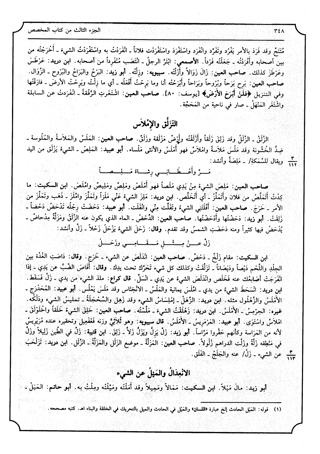الزّلَق - الزّلل وَقد زلِق زلَقاً وأزلَقتُه وَأَرْض مزلقة وزلَق. صَاحب الْعين: الملَسُ والمَلاسة والمُلوسة - ضدّ الخشونة وَقد ملُس مَلاسة وامّلاسّ فَهُوَ أملس وَالْأُنْثَى ملْساء. أَبُو عبيد: الملِص - الشَّيْء ينزلق من الْيَد وَيُقَال للسّمكة ملِصة وَأنْشد: مرّ وَأَعْطَانِي رِشاءً ملِصا صَاحب الْعين: ملِص الشَّيْء من يَدي ملَصاً فَهُوَ أملَص وملِص ومَليص وامّلص. ابْن السّكيت: مَا كِدت أتملّص من فلَان وأتملّز - أَي أتخلّص. ابْن دُرَيْد: ملِز الشَّيْء عنّي ملَزاً وتملّز وامّلز - ذهب وتملّز من الْأَمر - خرج. صَاحب الْعين: أفلتَني الشيءُ وتفلّت مني وانفلت. أَبُو عبيد: دحَضَتْ رجلُه تدحَض دحْضاً - زلِقَت. أَبُو زيد: دحضْتُها وأدحَضْتُها. صَاحب الْعين: الدّحْض - المَاء الَّذِي يكون عَنهُ الزّلَق ومزلّة مِدْحاض - يُدحَض فِيهَا كثيرا وَمِنْه دحضَت الشَّمْس وَقد تقدم. وَقَالَ: زحل الشَّيْء يزحل زحْلاً - زلّ وَأنْشد: زلّ عَن مثلِ مَقامي وزحَلْ ابْن السّكيت: مقَام زَلْخ - دحْض. صَاحب الْعين: اندلَص عَن الشَّيْء - خرج. وَقَالَ: داصَت الغُدّة بَين الْجلد واللحْم دَيْصاً ودَيَصاناً - تزلّقت وَكَذَلِكَ كل شَيْء تحرّك تَحت يدك. وَقَالَ: أفاص الضّبّ عَن يَدي - إِذا انفرجَت أصابعُك عَنهُ فخلص واندلَص الشَّيْء عَن يَدي - انسلّ. قَالَ كرَاع: ملذ الشَّيْء من يَدي - زلّ فَسقط. ابْن دُرَيْد: انسحَط الشَّيْء من يَدي امّلس يَمَانِية والمَلس - الانخناس وَقد ملَس يملُس. أَبُو عبيد: المُحدْرَج - الأملس والزُهْلول مثله. ابْن دُرَيْد: الزَّهَل - امِليساس الشَّيْء وَقد زهِل والسّجْعَلة - تمليس الشَّيْء ودلْكه. غَيره: الحِرمِس - الأملس. ابْن دُرَيْد: زهْلَقْت الشيءَ - ملّستُه. صَاحب الْعين: خلِق الشيءُ خلَقاً واخْلَولَق - امْلاسّ واستْوى. أَبُو عبيد: المَرمَريس - الأملس. قَالَ سِيبَوَيْهٍ: وَهُوَ ثلاثي وَزنه فعْفَعيل وتحقيره عِنْده مُرَيريس لِأَنَّهُ من المَراسة وَكَأَنَّهُم حقّروا مَرّاساً. أَبُو زيد: زلّ يزِلّ ويزَلّ زلاًّ - زلِق. ابْن قُتَيْبَة: زلّ فِي الطين زَليلاً وزلّ فِي مَنْطِقه زلّة وزلّت الدَّرَاهِم زُلولاً. صَاحب الْعين: المزلّة - مَوضِع الزّلل والمَزَلّة - الزّلل. ابْن دُرَيْد: تزَلْحب عَن الشَّيْء - زلّ عَنهُ والجَلَج - القلق.