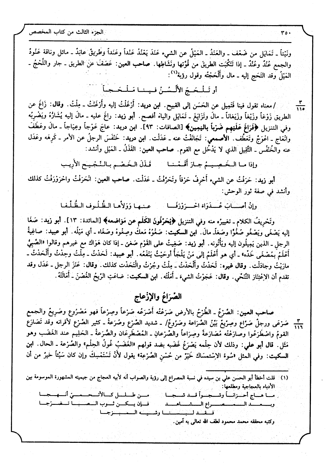 ونَيتاً - تمايل من ضف - والعَنَد - الْميل عَن الشَّيْء عنَدَ يعنُد عنْداً وعنَداً وَطَرِيق عانِد - مائل وناقة عَنود وَالْجمع عُنُد وعنّد - إِذا تنكّبَت الطَّرِيق من قوّتها ونشاطِها. صَاحب الْعين: عصَف عَن الطَّرِيق - جَار واللّحْج - الميْل وَقد التحَج إِلَيْهِ - مَال وألحَجْتُه وَقَول رؤبة: أَو تلْحَج الألسُن فِينَا مَلْحَجا مَعْنَاهُ تَقول فِينَا فَتميل عَن الحسَن إِلَى الْقَبِيح. ابْن دُرَيْد: أرْغَلت إِلَيْهِ وأرغَنتُ - ملْت. وَقَالَ: زاغ عَن الطَّرِيق زَوغاً وزَيغاً وزَيَغاناً - مَال وتزايَغ - تمايل وَالْيَاء أفْصح. أَبُو زيد: راغ عَلَيْهِ - مَال إِلَيْهِ يُشارّه ويضربه وَفِي التَّنْزِيل) فراغَ عَلَيْهِم ضرْباً بِالْيَمِينِ (. ابْن دُرَيْد: عاج عوْجاً وعِياجاً - مَال وعطَف وانْعاج - اعوجّ وتعطّف. الْأَصْمَعِي: تجانَفْت عَنهُ - عدلْت. ابْن دُرَيْد: خنْفس الرجل عَن الْأَمر - كرِهه وَعدل عَنهُ والخُنْفُس - الثّقيل اذي لَا يدْخل مَعَ الْقَوْم. صَاحب الْعين: القَذَل - الْميل وَأنْشد: وَإِذا مَا الخَصيم جَار أقمْنا قَذَل الخصْم بالنّجيح الأريب أَبُو زيد: حرَفْت عَن الشَّيْء أحرِف حرْفاً وتحرّفْت - عدلْت. صَاحب الْعين: انحرفْت واحرَوْرَفْت كَذَلِك وَأنْشد فِي صفة ثَوْر الْوَحْش: وَإِن أصابَ عُدَواءَ احرَوْرَفا عَنْهَا وولاّها الظّلوف الظُّلَّفا وتحريف الْكَلَام - تَغْيِيره مِنْهُ وَفِي التَّنْزِيل) يحرِفون الكلِم عَن مواضِعه (. أَبُو زيد: صَغا إِلَيْهِ يصغى ويصغو صُغُوّاً وصَغاً - مَال. ابْن السّكيت: صغْوُه معكَ وصِغْوه وصَغاه - أَي ميْلُه. أَبُو عبيد: صاغية الرجل - الَّذِي يميلون إِلَيْهِ ويأتونه. أَبُو زيد: صغيتُ على الْقَوْم صغًى - إِذا كَانَ هَوَاك مَعَ غَيرهم وَقَالُوا الصَّبِي أعلَم بمُصْغى خدّه - أَي هُوَ أعلم إِلَى من يلجأ أَو حَيْثُ يَنْفَعهُ. أَبُو عبيد: لحدْت - ملت وحدْتُ وألحَدْت - ماريْت وجادلْت. وَقَالَ غَيره: لحدْت وألحَدْت - ملت وجُرْت والتحدْت كَذَلِك. وَقَالَ: عنَز الرجل - عدل وَقد تقدم أَن الاعتِناز التّنحّي. وَقَالَ: عجوْت الشيءَ - أملْتُه. ابْن السّكيت: ضاعتِ الريحُ الغُصْنَ - أمالتْه.