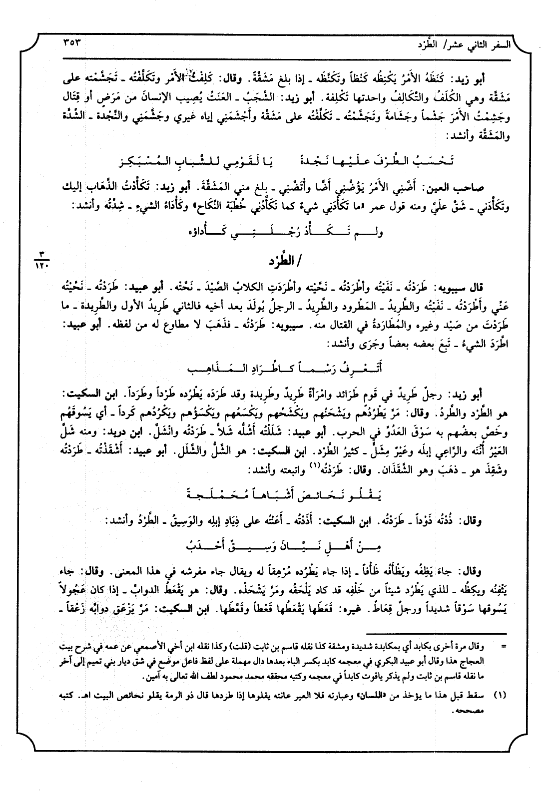 قَالَ سِيبَوَيْهٍ: طردْته - نفيته وأطرَدْته - نحّيته وأطردَت الْكلاب الصّيد - نحّته. أَبُو عبيد: طردْته - نحّيته عنّي وأطردته - نفيته والطّريد - المطرود والطّريد - الرجل يولَد بعد أَخِيه فَالثَّانِي طريد الأول والطّريدة - مَا طردْت من صيْد وَغَيره والمُطاردة فِي الْقِتَال مِنْهُ. سِيبَوَيْهٍ: طردْته فذهبَ لَا مُطَاوع لَهُ من لَفظه. أَبُو عبيد: اطّرد الشَّيْء - تبِع بعضه بَعْضًا وَجرى وَأنْشد: أتعرِف رسْماً كاطّراد المَذاهب أَبُو زيد: رجل طَريد فِي قوم طرائد وَامْرَأَة طَريد وطَريدة وَقد طردَه يطرُده طرْداً وطرَداً. ابْن السّكيت: هُوَ الطّرْد والطّرَد. وَقَالَ: مرّ يطردُهم ويشحَنُهم ويكشحُهم ويكسَعهم ويكسؤهم ويكرُدُهم كرْداً - أَي يسوقهم وخصّ بَعضهم سوْق العدوّ فِي الْحَرْب. أَبُو عبيد: شللْته أشُلّه شلاً - طردته وانشلّ. ابْن دُرَيْد: وَمِنْه شلّ العَيْر أُنُنَه والرّاعي إبلَه وعيْر مِشَلّ - كثير الطّرد. ابْن السّكيت: هُوَ الشّلّ والشّلل. أَبُو عبيد: أشقَذْته - طردْته وشقِذ هُوَ - ذهب وَهُوَ الشّقَذان. وَقَالَ: طردْتُه واتبعته وَأنْشد: يَقْلو نحائصَ أشْباهاً محمْلَجة وَقَالَ: ذُدْته ذوْداً - طردته. ابْن السّكيت: أذَدْته - أعنْته على ذِياد إبِله والوَسيق - الطّرد وَأنْشد: من أهلِ نَيّان وسيقٌ أحدَب وَقَالَ: جَاءَ يظِفه ويظأفُه ظأفاً - إِذا جَاءَ يطرُده مرهِقاً لَهُ وَيُقَال جَاءَ مفرشه فِي هَذَا الْمَعْنى، وَقَالَ: جَاءَ ينفِثه ويكِظه - للَّذي يطرُد شَيْئا من خلفِه وَقد كَاد يلحَقه ومرّ يشحَذه. وَقَالَ: هُوَ يقْعَط الدوابّ - إِذا كَانَ عَجولاً يَسُوقهَا سوْقاً شَدِيدا وَرجل قِعاط. غَيره: قعَطَها يقعَطها قعْطاً وقعّطها. ابْن السّكيت: مرّ يزعَق دوابّه زعْقاً -