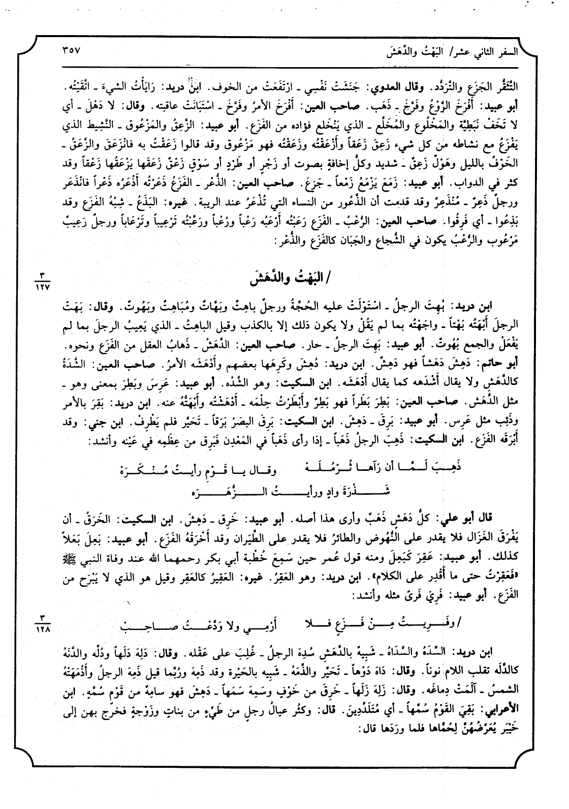 ابْن دُرَيْد: بُهِت الرجل - استولت عَلَيْهِ الْحجَّة وَرجل باهِت وبهّات ومُباهِت وبَهوت. وَقَالَ: بهَت الرجل أبهتُه بهْتاً - واجهته بِمَا لم يقُل وَلَا يكون ذَلِك إِلَّا بِالْكَذِبِ وَقيل الباهِت - الَّذِي يَعيب الرجل بِمَا لم يفعل وَالْجمع بُهوت. أَبُو عبيد: بهِت الرجل حَار. صَاحب الْعين: الدَّهَش - ذهَاب الْعقل من الفزَع وَنَحْوه. أَبُو حَاتِم: دهِش دهَشاً فَهُوَ دهِش. ابْن دُرَيْد: دُهِش وكرِهَها بَعضهم وأدهَشه الْأَمر. صَاحب الْعين: الشَّدَه كالدَّهَش وَلَا يُقَال أشْدَهه كَمَا يُقَال أدْهَشه. ابْن السّكيت: وَهُوَ الشَّدْه. أَبُو عبيد: عرِس وبطِر بِمَعْنى وَهُوَ - مثل الدَهَش. صَاحب الْعين: بطِر بطَراً فَهُوَ بطِر وأبْطَرْت حِلْمَه - أدْهَشته وأبْهَتّه عَنهُ. ابْن دُرَيْد: بقِر بِالْأَمر وذئب مثل عرِس. أَبُو عبيد: برِق - دهِش. ابْن السّكيت: برِق البصَر برَقاً - تحيّر فَلم يطرِف. ابْن جني: وَقد أبرَقَه الفزَع. ابْن السّكيت: ذهِب الرجلُ ذهَباً - إِذا رأى ذهَباً فِي المعْدِن فبرِق من عِظَمِه فِي عيْنه وَأنْشد: ذهِب لمّا أَن رَآهَا ثُرمُلَهْ وَقَالَ يَا قوم رأيتُ مُنكَرَه شَذْرة وادٍ ورأيتُ الزُّهَرَه قَالَ أَبُو عَليّ: كل دهَش ذهب وَرَأى هَذَا أَصله. أَبُو عبيد: دهِش. ابْن السّكيت: الخرَق - أَن يفْرَق الغَزال فَلَا يقدر على النّهوض والطائر فَلَا يقدر على الطّيران وَقد أخْرَقه الفزَع. أَبُو عبيد: بعِل بعَلاً كَذَلِك. أَبُو عبيد: عقِر كبعِل وَمِنْه قَول عمر حِين سمع خُطبة أبي بكر رحمهمَا الله عِنْد وَفَاة النَّبِي صلى الله عَلَيْهِ وَسلم فعقِرتُ حَتَّى مَا أقدِر على الْكَلَام. ابْن دُرَيْد: وَهُوَ العقِر. غَيره: العَقير كالعَقِر وَقيل هُوَ الَّذِي لَا يبرَح م الْفَزع. أَبُو عبيد: فرِيَ فَرًى مثله وَأنْشد: وفَرِيت من فزَع فَلَا أرمي وَلَا ودّعْت صاحِبْ ابْن دُرَيْد: السَّدَه والسّداه - شَبيه بالدَّهَش سُدِه الرجل - غُلِب على عقله. وَقَالَ: دلِه دَلَهاً ودُلِّه والدَّه كالدّلَه تغلب اللَّام نوناً. وَقَالَ: داءَ دوْهاً - تحيّر والذَّمَه - شَبيه بالحيْرة وَقد ذمِه وربّما قيل ذمِه الرجل وأذمَهَته الشَّمْس - آلمَت دِماغه. وَقَالَ: دَلِه زلَهاً - خرِق من خوف وسمِه سمَهاً - دهِش فَهُوَ سامِه من قوم سُمّه. ابْن الْأَعرَابِي: بَقِي الْقَوْم سُمّهاً - أَي متلدّدي. قَالَ: وكثُر عِيال رجلٍ م طَيّئ من بَنَات وَزَوْجَة فَخرج بِهن إِلَى خَيْبَر يعرضُهّ لحُمّاها فَلَمَّا وردهَا قَالَ: