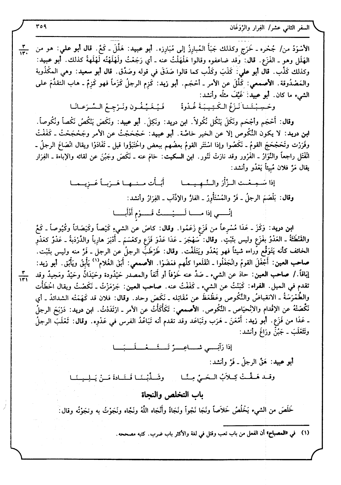 الأسْوَد من جُحْره - خرج وَكَذَلِكَ جبأ المُبارز إِلَى مُبارِزه. أَبُو عبيد: هلّل - كعّ. قَالَ أَبُو عَليّ: هُوَ من الهَلَل وَهُوَ - الفزَع. قَالَ: وَقد ضاعفوه وَقَالُوا هلْهَلْت عَنهُ - أَي رجَعْت ولَهْلَهْته لَهلهْتُه لهْلَهة كَذَلِك. أَبُو عبيد: وَكَذَلِكَ كذّب. قَالَ أَبُو عَليّ: كذَب وكذّب كَمَا قَالُوا صدَق فِي قَوْله وصدّق. قَالَ أَبُو سعيد: وَهِي المكذوبة والمصْدوقة. الْأَصْمَعِي: كلّل عَن الْأَمر - أحْجم. أَبُو زيد: كزِم الرجل كزَماً فَهُوَ كزِم - هاب التقدّم على الشَّيْء مَا كَانَ. أَبُو عبيد: غيّف مثلُه وَأنْشد: وحسِبْتنا نزَع الكتيبةَ غُدْوة فيُغَيّفون ونرجِع السّرَعانا وَقَالَ: أحجَم وأجْحم وَنكل ونكَل ينكُل نُكولاً. ابْن دُرَيْد: ونكِل: أَبُو عبيد: ونكَص ينكُص نكْصاً ونُكوصاً. ابْن دُرَيْد: لَا يكون النكوص إِلَّا عَن الْخَيْر خاصّة. أَبُو عبيد: حَجْحَجْت عَن الْأَمر وجَحْجَحْت - كففْت وفررْت وتحجْحَج الْقَوْم - نكصوا وَإِذا اسْتتَر الْقَوْم بعضُهم بِبَعْض واختبَؤوا قيل - تفادَوا وَيُقَال انصاع الرجل - انْفَتَلَ رَاجعا والنّوَار - الفَرور وَقد نارَت تَنود. ابْن السّكيت: خامَ عَنهُ - نكص وجبُن عَن لِقَائِه والإباءة - الفِرار يُقَال مرّ فلَان مُبيئاً يَعْدو وَأنْشد: إِذا سمعْت الزّأرَ والنهِيما أبأت مِنْهَا هرَباً عَزيما وَقَالَ: بلْصَم الرجل - فرّ والمُستأوِر - الفارّ والإذْآب - الفِرار وَأنْشد: إِنِّي إِذا مَا ليْثُ قوم أذْأبا ابْن دُرَيْد: وكَز - عدا مُسرِعا من فزَع زَعموا. وَقَالَ: كاصَ عَن الشَّيْء كيْصاً وكَيَصاناً وكُيوصاً - كعّ والقَنطَئة - العدْو بفزَع وَلَيْسَ بثبت. وَقَالَ: سهْجَر - عَدا عدْوَ فزَع وكعْسَم - أدْبَر هارِباً والدّرْدَبة - عدْو كعدْو الْخَائِف كَأَنَّهُ يتوقّع وَرَاءه شَيْئا فَهُوَ يعْدو ويتلفّت. وَقَالَ: طرْطَب الرجل عَن الرجل فرّ مِنْهُ وَلَيْسَ بثبْت. صَاحب الْعين: أجْفَل الْقَوْم وانجَفلوا - انقلعوا كلهم فَمَضَوْا. الْأَصْمَعِي: أبَقَ الغُلام يأبِق ويأبُق. أَبُو زيد: إباقاً. صَاحب الْعين: حاد عَن الشَّيْء - صدّ عَنهُ خوْفاً أَو أنفًا والمصدر حَيدودة وحَيَدان وحيْد ومَحيد وَقد تقدم فِي الْميل. الْفراء: كبَنتُ عَن الشَّيْء - كففْتُ عَنهُ. صَاحب الْعين: جرْمَزْت - نكصْت وَيُقَال أخْطأت والطّمْرَسة - الانقباض والنكوص وعظْعَظ عَن مُقاتِله - نكص وحاد. وَقَالَ: فلَان قد كهمَتْه الشدائد - أَي نكّصَتْه عَن الْإِقْدَام والانحياص - النكوص. الْأَصْمَعِي: تكأ كأْتُ عَن الْأَمر - ارتددْتُ. ابْن دُرَيْد: درْبَح الرجل - عَدا م فزَع. أَبُو زيد: أمعَن - هرب وتباعد وَقد تقدم أَنه تباعُد الْفرس فِي عدْوه. وَقَالَ: ثعلَبَ الرجل وتثعْلَب - جبُن وراغ وَأنْشد: إِذا رَآنِي شاعِر تثعْلَبا أَبُو عبيد: هقّ الرجل - فرّ وَأنْشد: وَقد هقّتْ كِلابُ الحيّ منا وشذّبْنا قَتادةَ مَن يَلينا