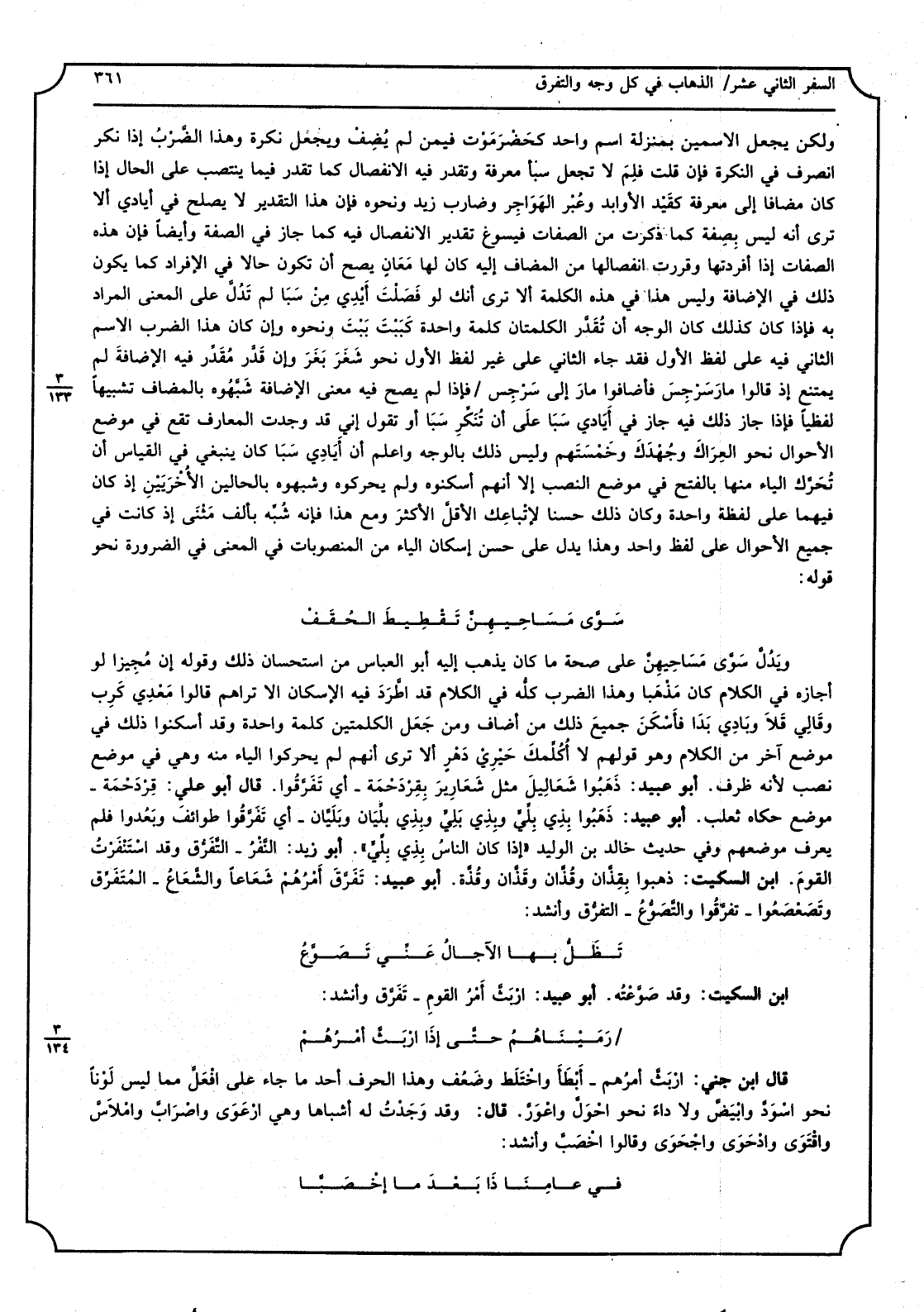 وَلَكِن يَجْعَل الاسمين بِمَنْزِلَة اسْم وَاحِد كحضْرَمَوت فِيمَن لم يُضف وَيجْعَل نكرَة وَهَذَا الضّرب إِذا نكر انْصَرف فِي النكرَة فَإِن قلت فلِم لَا تجْعَل سبأ معرفَة وتقدر فِيهِ الِانْفِصَال كَمَا تقدر فِيمَا ينْتَصب على الْحَال إِذا كَانَ مُضَافا إِلَى معرفَة كقيْد الأوابد وعُبْر الهَواجر وضارب زيد وَنَحْوه فَإِن هَذَا التَّقْدِير الِانْفِصَال فِيهِ كَمَا جَازَ فِي الصّفة وَأَيْضًا فَإِن هَذِه الصِّفَات إِذا أفردتها وقررت انفصالها من الْمُضَاف إِلَيْهِ كَانَ لَهَا معاٍ يَصح أَن تكون حَالا فِي الْإِفْرَاد كَمَا يكون ذَلِك فِي الْإِضَافَة وَلَيْسَ هَذَا فِي هَذِه الْكَلِمَة أَلا ترى أَنَّك لَو فصَلْت أيْدي من سبَا لم تدلّ على الْمَعْنى المُرَاد بِهِ فَإِذا كَانَ كَذَلِك كَانَ الْوَجْه أَن تقدّر الكلمتان كلمة وَاحِدَة كيَبْت بَيْت وَنَحْوه وَإِن كَانَ هَذَا الضَّرْب الِاسْم الثَّانِي فِيهِ على لفظ الأول فقد جَاءَ الثَّانِي على غير لفظ الأول نَحْو شغَر بغَر وَإِن قدّر مُقدِّر فِيهِ الْإِضَافَة لم يمْتَنع إِذْ قَالُوا مارَسَرْجِس فأضافوا مار إِلَى سَرْجِس فَإِذا لم يَصح فِيهِ معنى الْإِضَافَة شبّهوه بالمضاف تَشْبِيها لفظياً فَإِذا جَازَ ذَلِك فِيهِ جَازَ فِي أيادي سَبا على أَن تنكر سبا أَو تَقول إِنِّي قد وجدت المعارف تقع فِي مَوضِع الْأَحْوَال نَحْو العِراك وجُهدَك وخمْسَتَهم وَلَيْسَ ذَلِك بأوجه وَاعْلَم أَن أيادي سبا كَانَ يَنْبَغِي فِي الْقيَاس أَن تحرّك الْيَاء مِنْهَا بِالْفَتْح فِي مَوضِع النصب إِلَّا أَنهم أسكنوه وَلم يحركوه وشبهوه بالحالين الأخرَييْن إِذْ كَانَ فيهمَا على لَفْظَة وَاحِدَة وَكَانَ ذَلِك حسنا لاتْباعِك الأقلّ الأكثرَ وَمَعَ هَذَا فَإِنَّهُ شُبِّه بِأَلف مَثْنى إِذْ كَانَت فِي جَمِيع الْأَحْوَال على لفظ وَاحِد وَهَذَا يدل على حسن إسكان الْيَاء من المنصوبات فِي الْمَعْنى فِي الضَّرُورَة نَحْو قَوْله: سوّى مَساحيهنّ تَقْطيطَ الحُقَقْ ويدلّ سوّى مَساحيهنّ على صِحَة مَا كَانَ يذهب إِلَيْهِ أَبُو الْعَبَّاس من اسْتِحْسَان ذَلِك وَقَوله إِن مُجيزاً لَو أجَازه فِي الْكَلَام كَانَ مذْهَباً وَهَذَا الضَّرْب كُله فِي الْكَلَام قد اطّرد فِيهِ الإسكان أَلا تراهم قَالُوا مَعْدي كَرِب وقالي قَلا وبادِي بَدا فأسْكن جَمِيع ذَلِك من أضَاف وَمن جعل الْكَلِمَتَيْنِ كلمة وَاحِدَة وَقد أسكنوا ذَلِك فِي مَوضِع آخر من الْكَلَام وَهُوَ قَوْلهم لَا أكلّمك حيْريْ دهْر أَلا ترى أَنهم لم يحركوا الْيَاء مِنْهُ وَهِي فِي مَوضِع نصب لِأَنَّهُ ظرف. أَبُو عبيد: ذهَبوا شَعاليلَ مثل شَعاريرَ بقِرْدَحْمة - أَي تفرّقوا. قَالَ أَبُو عَليّ: قِردَحْمَة - مَوضِع حَكَاهُ ثَعْلَب. أَبُو عبيد: ذهَبوا بذِي بِليّ وبذي بَليّ وبذي بلّيان وبَليّان - أَي تفرّقوا طوائف وبعُدوا فَلم يعرف موضعهم وَفِي حَدِيث خَالِد بن الْوَلِيد إِذا كَانَ النَّاس بِذِي بِلّي. أَبُو زيد: النّفْر - التفرّق وَقد استنفرت الْقَوْم. ابْن السّكيت: ذَهَبُوا بقِذّان وقُذّان وقَذّان وقُذّة. أَبُو عبيد: تفرّق أمرُهم شَعاعاً والشّعاع - المُنَفَرِّق وتصعْصَعوا - تفرّقوا والتّصوّع - التفرّق وَأنْشد: تظلّ بهَا الْآجَال عني تصوّعُ ابْن السّكيت: وَقد صوّعته. أَبُو عبيد: ارْبَثّ أمرُ الْقَوْم - تفرّق وَأنْشد: رمَيْناهُمُ حَتَّى إِذا ارْبَثّ أمرُهمْ قَالَ ابْن جني: ارْبثّ أمرُهم - أَبْطَأَ واختلطَ وضعُف وَهَذَا الْحَرْف أحد مَا جَاءَ على افْعَلّ مِمَّا لَيْسَ لوناً نَحْو اسودّ وابيضّ ولاداء نَحْو احْولّ واعْوَرّ. قَالَ: وَقد وجدْت لَهُ أشباهاً وَهِي ارْعَوى واصْرابّ وامْلاسّ واقْتَوى وادْحَوى واحْجَوى وَقَالُوا اخْصَبّ وَأنْشد: فِي عامِنا ذَا بعْدَ مَا اخْصَبّا