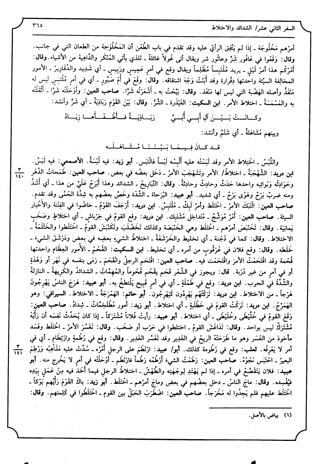 أمرُهم مخْلوجة - إِذا لم يتّفِق الرَّأْي عَلَيْهِ وَقد تقدم فِي بَاب الطّعن أَن المَخلوجة من الطعان الَّتِي فِي جَانب. وَقَالَ: وَقَعُوا فِي عافور شرّ وعاثور شَرّ وَيُقَال أَتَى غولاً غائلة - للَّذي يَأْتِي المُنكر والدّاهية من الْأَشْيَاء. وَقَالَ: أمرُكم هَذَا أَمر لَيل - يُرِيد مُلتَبِساً مُظلِماً وَيُقَال وَقع فِي أَمر عَميس ورَبيس - أَي شَدِيد والدّقارير - الْأُمُور الْمُخَالفَة السَّيئَة واحدتها دِقرارة وَقد أبَنت وجهَ اشتقاقه. وَقَالَ: وَقع فِي أمّ صَبّور - أَي فِي أَمر مُلتَبس لَيْسَ لَهُ منفَذ وَأَصله الهَضْبة الَّتِي لَيْسَ منفذ. وَقَالَ: بيّحْت بِهِ - أشعرتُه شرّاً. صَاحب الْعين: وأوحَلْتُه شرا - أثقَلته بِهِ والمَسْمَسة - اخْتِلَاط الْأَمر. ابْن السّكيت: الغَيذَرة - الشّر. وَقَالَ: بَين الْقَوْم وباذيَه - أَي شرّ وَأنْشد: َ الْأَمر - إِذا لم يلتَئم. وَقَالَ: وَقع فِي الرَّقِم الرّقْماء - أَي فِيمَا لَا يقوم بِهِ وَهِي الدّاهية أَيْضا. ابْن دُرَيْد: وَهِي الرَّقَم والرّقْماء. ابْن السّكيت: ... ... . . عَلَيْهِم أَمرهم - إِذا لم يدروا كَيفَ يتوجهون لَهُ. وَقَالَ: وعْكَة الْأَمر - دفْعَته وشدّته. وَقَالَ: أمرُهم مخْلوجة - إِذا لم يتّفِق الرَّأْي عَلَيْهِ وَقد تقدم فِي بَاب الطّعن أَن المَخلوجة من الطعان الَّتِي فِي جَانب. وَقَالَ: وَقَعُوا فِي عافور شرّ وعاثور شَرّ وَيُقَال أَتَى غولاً غائلة - للَّذي يَأْتِي المُنكر والدّاهية من الْأَشْيَاء. وَقَالَ: أمرُكم هَذَا أَمر لَيل - يُرِيد مُلتَبِساً مُظلِماً وَيُقَال وَقع فِي أَمر عَميس ورَبيس - أَي شَدِيد والدّقارير - الْأُمُور الْمُخَالفَة السَّيئَة واحدتها دِقرارة وَقد أبَنت وجهَ اشتقاقه. وَقَالَ: وَقع فِي أمّ صَبّور - أَي فِي أَمر مُلتَبس لَيْسَ لَهُ منفَذ وَأَصله الهَضْبة الَّتِي لَيْسَ منفذ. وَقَالَ: بيّحْت بِهِ - أشعرتُه شرّاً. صَاحب الْعين: وأوحَلْتُه شرا - أثقَلته بِهِ والمَسْمَسة - اخْتِلَاط الْأَمر. ابْن السّكيت: الغَيذَرة - الشّر. وَقَالَ: بَين الْقَوْم وباذيَه - أَي شرّ وَأنْشد: وَكَانَت بَين آل أبي أُبَي رَباذِيةٌ فأطْفأها زِياد وَبينهمْ مُشاهلة - أَي شتْم وَأنْشد: قد كَانَ فِيمَا بَيْننَا مُشاهَلَه واللّبْسُ - اختِلاط الْأَمر وَقد لبَسْته عَلَيْهِ ألبِسُه لَبْساً فالْتبَس. أَبُو زيد: فِيهِ لُبْسَة. الْأَصْمَعِي: فِيهِ لَبَس. ابْن دُرَيْد: الشّهْجَبة - اخْتِلَاط الْأَمر وتشَهجَب الْأَمر - دخل بعضُه فِي بعض. صَاحب الْعين: طَمَحات الدَّهْر وحوادثُه ونوائبه وَاحِدهَا حدث وحادِث وحادثة. وَقَالَ: التّباريح - الشدائد وَهَذَا أبرَح عليّ من هَذَا - أَي أشدّ وَمِنْه ضربٌ برْح وَهوى برحٌ - أَي شَدِيد. أَبُو عبيد: البُرَحاء - الشِدّة وخصّ بعضُهم بِهِ شدّة الحُمّى وَقد تقدم. صَاحب الْعين: التَبَك الْأَمر - اخْتَلَط وَأمر لبِك - ملتبِس. ابْن دُرَيْد: أرْجَف الْقَوْم - خَاضُوا فِي الفِتنة وَالْأَخْبَار السَّيئَة. صَاحب الْعين: أَمر موشّج - متداخل مشتبك. ابْن دُرَيْد: وَقع الْقَوْم فِي خِرباش - أَي اختلاطٍ وصخب يَمَانِية. وَقَالَ: تخنبَص أَمرهم - اخْتَلَط وَهِي الخنبصة وَكَذَلِكَ تخضْلَب وتكنبَش الْقَوْم - اختلطوا والخثلَمة - الِاخْتِلَاط. وَقَالَ: كَمَا فِي دُجُنة - أَي تَخْلِيط والخرْشَفة - اخْتِلَاط الشَّيْء بعضِه فِي بعض ودرْشَق الشيءَ - خلطه. وَقَالَ: وَقع فلَان فِي عُرقوب من أمره - أَي تَخْلِيط. ابْن السّكيت: القُحم - الْأُمُور العِظام واحدتها قُحمة وَقد اقتحمْتُ الْأَمر واقتحمْت فِيهِ. صَاحب الْعين: اقتحمَ الرجل وانقَحم - رمى بِنَفسِهِ فِي نهرأ ووهدة أَو فِي أَمر من غير دُرْبة. قَالَ: وَيجوز فِي الشِعر قحَم يقحُم قُحوماً والمُهمّات - الشدائد والكريهة - النَّازِلَة والشدّة فِي الْحَرْب. ابْن دُرَيْد: وَقع فِي طمْلَة - أَي فِي أَمر قَبِيح يلتطخ بِهِ. أَبُو عبيد: هرَج النَّاس يهرِجون هرْجاً - من الِاخْتِلَاط. اب