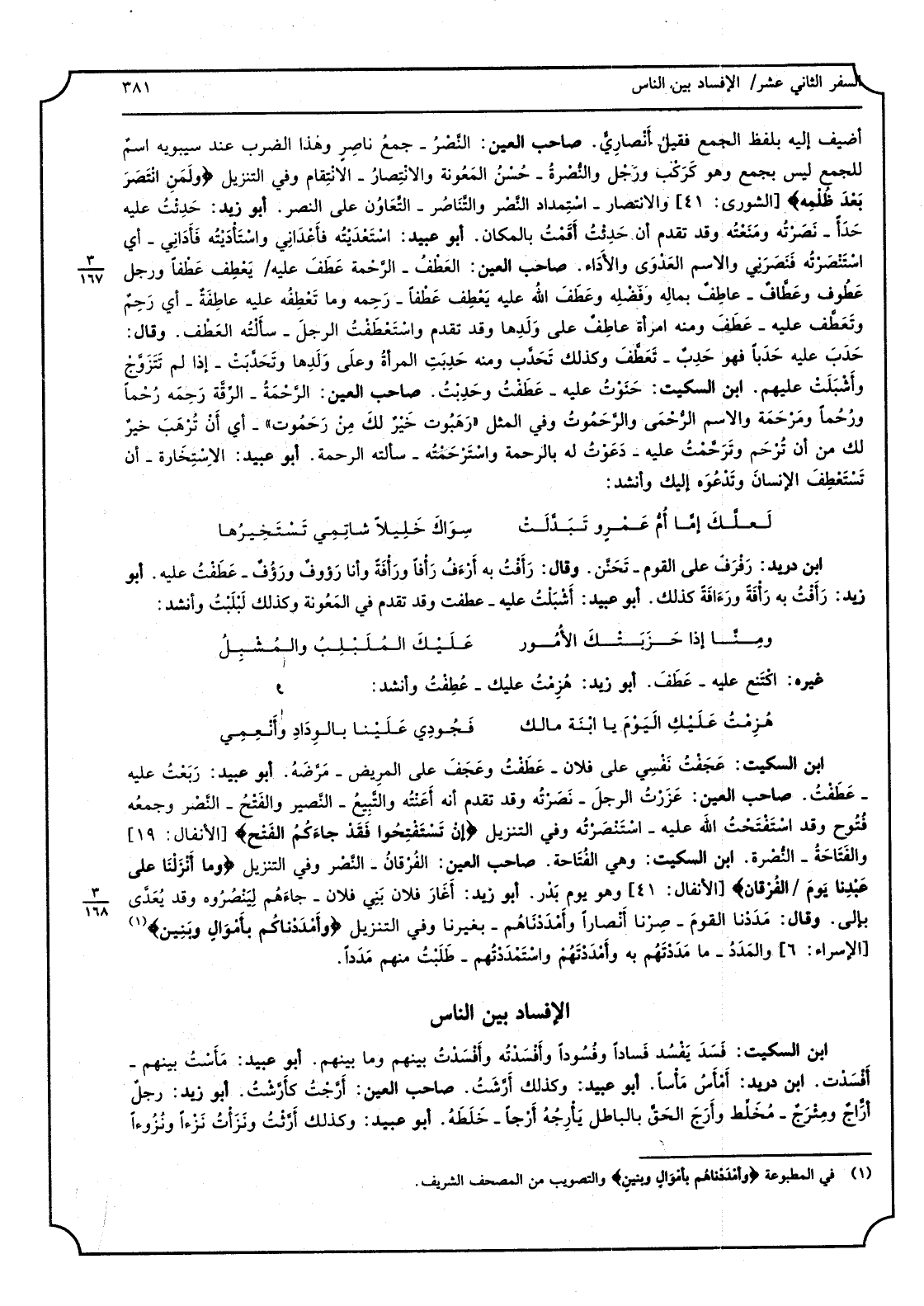 أضيف إِلَيْهِ بِلَفْظ الْجمع فَقيل أنْصاري. صَاحب الْعين: النّصْر - جمع نَاصِر وَهَذَا الضَّرْب عِنْد سِيبَوَيْهٍ اسْم للْجمع لَيْسَ بِجمع وَهُوَ كرَكْب ورجْل والنُّصْرة - حُسن المَعونة والانتصار - الانتقام وَفِي التَّنْزِيل) ولمَن التنصر بعد ظُلمِه (والانتصار - استمداد النّصر والتّناصر - التعاون على النَّصْر. أَبُو زيد: حدئْت عَلَيْهِ حدَأ - نصرته ومنعته وَقد تقدم أَن حدِئْت أقمْت بِالْمَكَانِ. أَبُو عبيد: استعديْتُه فأعداني واستأدَيتُه فأداني - أَي استنصرته فنصرني وَالِاسْم العَدْوى وَالْأَدَاء. صَاحب الْعين: العطْف - الرّحمة عَطفَ عَلَيْهِ يعطِف عطْفاً وَرجل عَطوف وعطّاف - عاطِف بِمَالِه وفضله وعطَف الله عَلَيْهِ يعطِف عطْفاً - رحِمه وَمَا تعطِفه عَلَيْهِ عاطِفة - أَي رحِم وتعطّف عَلَيْهِ - عطَف وَمِنْه امْرَأَة عاطِف على ولدِها وَقد تقدم واستعطَفْت الرجل - سألتُه العطْف. وَقَالَ: حدِب عَلَيْهِ حدَباً فَهُوَ حدِب - تعطّف وَكَذَلِكَ تحدّب وَمِنْه حدِبَت الْمَرْأَة على ولدِها وتحدّبَت - إِذا لم تتزوّج وأشبلَت عَلَيْهِم. ابْن السّكيت: حَنَوت عَلَيْهِ - عطفْت وحدِبْبت. صَاحب الْعين: الرّحمة - الرِقّة رحِمَه رُحْماً ورُحُماً ومَرحَمة وَالِاسْم الرُحْمى والرّحَموت وَفِي الْمثل) رهَبوت خيرٌ لَك من رحَموت (- أَي أَن تُرهَب خيرٌ لَك من أَن تُرحَم وترحّمْت عَلَيْهِ - دعوْتُ لَهُ بِالرَّحْمَةِ واسترحَمْته - سألتُه الرَّحْمَة. أَبُو عبيد: الاستِخارة - أَن تستعطِف الْإِنْسَان وتدعوَه إِلَيْك وَأنْشد: لعلّك إمّا أمُ عمْرٍو تبدّلت سِواك خَليلاً شاتِمي تَستخيرُها ابْن دُرَيْد: رفرَف على الْقَوْم - تحنّن. وَقَالَ: رأفْتُ بِهِ أرءف رأفاً ورأفَة وَأَنا رءوف ورَؤُف - عطفْت عَلَيْهِ. أَبُو زيد: رأفْت بِهِ رأفَةً ورءافةً كَذَلِك. أَبُو عبيد: أشْبَلْتُ عَلَيْهِ - عطفت وَقد تقدم فِي المَعونة وَكَذَلِكَ لبْلَبْت وَأنْشد: ومنّا إِذا خربَتْك الْأُمُور عَلَيْك المُلَبْلِب والمُشْبِل غَيره: اكْتَنع عَلَيْهِ - عطَف. أَبُو زيد: هُزمْتُ عَلَيْك - عُطِفْت وَأنْشد: هُزمْت عليكِ الْيَوْم يَا ابْنةَ مَالك فجودي علينا بالوِداد وأنعِمي ابْن السّكيت: عجفْت نَفسِي على فلَان - عطَفْت وعجفَ على الْمَرِيض - مرّضه. أَبُو عبيد: ربعْتُ عَلَيْهِ - عطفْت. صَاحب الْعين: عززْت الرجل - نصرْتُه وَقد تقدم أَنه أعَنْته والتّبيع - النّصير وَالْفَتْح - النّصر وجمعُه فُتوح وَقد استفْتَحْت عللهَ عَلَيْهِ - استنصرْتُه وَفِي التَّنْزِيل) إِن تستَفتِحوا فقد جاءَكم الفتْح (والفَتاحة - النُصرة. ابْن السّكيت: وَهِي الفُتاحة. صَاحب الْعين: الفُرقان - النّصر وَفِي التَّنْزِيل) وَمَا أنزَلْنا على عبدِنا يومَ الفُرقان (وَهُوَ يَوْم بدْر. أَبُو زيد: أغارَ فلَان بَني فلَان - جاءَهم لينصروه وَقد يُعدّى بإلى. وَقَالَ: مدَدْنا الْقَوْم - صِرْنا لَهُم أنصاراً وأمْدَدْناهُم - بغيرنا وَفِي التَّنْزِيل) وأمْدَدْناهم بأموال وبَنين (والمدَد - مَا مدَدْتَهم بِهِ وأمددتهم واستمددتهم - طلبتُ منهُم مَدداً.