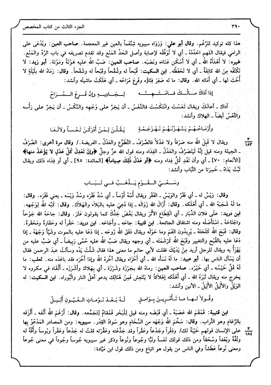 هَذَا كُله توكيد للرّغم. وَقَالَ أَبُو عَليّ: وَرَوَاهُ سِيبَوَيْهٍ شِنّعماً بِالْعينِ غير الْمُعْجَمَة. صَاحب الْعين: ويدعى على الرَّامِي فَيُقَال اللَّهُمَّ احْدُدْه - أَي لَا تُوفّقه لإصابة وأصل الْحَد الْمَنْع وَقد تقدم تصريفه فِي بَاب الردّ وَالْمَنْع. غَيره: لَا أهدأه الله - أَي لَا أسْكن عَناءَه ونصبه. صَاحب الْعين: صبّ الله عَلَيْهِ هوْتَة وموتة. أَبُو زيد: لَا تكنُفه من الله كانِفة - أَي لَا تخفظه. ابْن السّكيت: قُبْحاً لَهُ وشُقْحاً وقَبحاً لَهُ وشَقحاً. وَقَالَ: رَمَاه الله بليلة لَا أُخْت لَهَا - أَي أَمَاتَهُ الله، وَقَالَ: مَا لَهُ صَفِر فِناؤه وقرِع مُراحه - أَي هَلَكت مَاشِيَته وَأنْشد: إِذا آداك مالُك فامْتهنه لجاديه وإنْ قرِع المُراحُ آداك - أعانك وَيُقَال تعسْت وانتكسْت فالتّعْس - أَن يحزّ على وَجهه والنّكس - أَن يحزّ على رَأسه والتّعْس أَيْضا - الْهَلَاك وَأنْشد: وأرماحُهم ينهزنَهم نهزَ جمّة يقُلن لمنْ أدركن تعْساً وَلَا لَعا وَيُقَال لَا قبل الله مِنْهُ صرفا وَلَا عدْلاً فالصّرف - التطوّع وَالْعدْل - الْفَرِيضَة. وَقَالَ مرّة أُخْرَى: الصّرف - الْحِيلَة وَمِنْه قيل إِنَّه ليتصرّف وَالْعدْل - الفِدا وَمِنْه قَول الله عز وَجل) وَإِن تعدِل كلّ عدْلٍ لَا يؤخَذ مِنْهَا (- أَي وَإِن تفِد كل فدَاء وَمِنْه) أَو عدْل ذَلِك صِياماً (- أَي أَو فِدا ذَلِك وَيُقَال تبّت يَدَاهُ - خسِرَتا من التّباب وَأنْشد: وسعْيُ الْقَوْم يذهب فِي تَباب وَقَالَ: ويْسٌ لَهُ - أَي فقْر والويس - الْفقر وَيُقَال أُسْه أوْساً - أَي سُد فقرَه وسدّ ويْسَه - يَعْنِي فقره. وَقَالَ: مَا لَهُ شجبه الله - أَي أهلكه. وَقَالَ: أَزَال الله زَواله - إِذا دُعِي عَلَيْهِ بالبَلاء والهَلاك. وَقَالَ: كبّه الله لوجههه. ابْن دُرَيْد: على فلَان الدّبار - أَي انْقِطَاع الْأَثر وَيُقَال بغُض جدُّك كَمَا يَقُولُونَ عثر. وَقَالَ: جاحَه الله جوْحاً واجتاحه - استأصله وَمِنْه اشتقاق الْجَائِحَة. ابْن قُتَيْبَة: جاحه - وأجاحه. ابْن دُرَيْد: حقْراً لَهُ وحَقارة ومحقَرة. وَقَالَ: قبح الله كلمَته - يُرِيدُونَ الفَم وَمَا حوله وَيُقَال دفَق الله روحه - إِذا دَعَا عَلَيْهِ بِالْمَوْتِ وشيّأ وَجهه - إِذا دَعَا عَلَيْهِ بالقُبْح والتغيير وقبح الله كَرشَمَته - أَي وَجهه وَيُقَال صبّ الله عَلَيْهِ حُمّى رَبيضاً - أَي صبّ عَلَيْهِ من يهزأ بِهِ وَيُقَال للرجل أُرِيد من يَديك فَقلت لأبي حَاتِم مَا معنى هَذَا فَقَالَ شلّت يدُه وَسَأَلت عبدَ الرَّحْمَن فَقَالَ أَن يسْأَل النَّاس بهَا. أَبُو عبيد: مَا لَهُ نسأه الله - أَي أَخْزَاهُ وَيُقَال أخّره الله وَإِذا أخّره فقد باعدَه مِنْهُ. ثَعْلَب: مَا لَهُ قلّ خَيسُه - أَي خَيره. صَاحب الْعين: رَمَاه الله بجرْزَة وشَرْزة - أَي بِهَلَاك وأشْرزَه - أَلْقَاهُ فِي مَكْرُوه لَا يخرج مِنْهُ وَيُقَال ثبَره الله - أَي أهلكه إهلاكاً لَا ينتعش فَمن هُنَالك يَدْعُو أهل النَّار واثُبوراه. ابْن السّكيت: لَهُ الويل والأليل والأليل - الأنين وَأنْشد: وقولا لَهَا مَا تأمرين بوامِق لَهُ بعْد نومات العُيون أليلُ ابْن قُتَيْبَة: قمْقَم الله عصبَه - أَي قَبضه وَمِنْه قيل للبحر قمْقام لتجمّعه. وَقَالَ: أرْغم الله أَنفه - أزقه بالرَّغام وَهُوَ التُّرَاب. وَقَالَ سخّم الله وَجهه من السُخام وَهُوَ سَواد القِدْر. سِيبَوَيْهٍ: وَمن المصادر الْمَدْعُو بهَا على الْإِنْسَان قَوْلهم خيبَةً لَك ودَفْراً وجدْعاً وعقْراً وَقد جدّعْته وعقّرْته قلت لَهُ جدْعاً وعَقْراً وبوساً وأفّة لَهُ وتُفّة وبُعداً وسُحقاً وَمن ذَلِك قَوْلك تَعساً وتَباً وجوعاً ونوعاً وَذكر غير سِيبَوَيْهٍ جُوساً وجودا فِي معنى وجوعاً وَمعنى نوعا عطَشاً وَفِي النَّاس من يَقُول هُوَ اتِّبَاع وَمن ذَلِك قَول ابْن ميّادة: