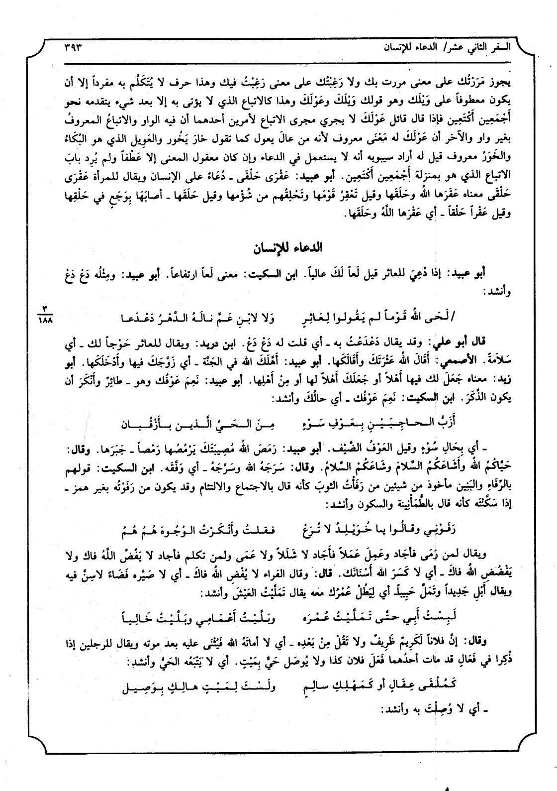 أَبُو عبيد: إِذا دُعي للعاثر قيل لَعا لَك عَالِيا. ابْن السّكيت: معنىلعاً ارتفاعاً. أَبُو عبيد: وَمثله دعْ دعْ وَأنْشد: لحا الله قوماًلم يَقُولُوا لعاثِر وَلَا لِابْنِ عمّ ناله الدهرُ دعْدَعا قَالَ أَبُو عَليّ: وَقد يُقَال دعدعْت بِهِ - أَي قلت لَهُ دعْ دعْ. ابْن دُرَيْد: وَيُقَال للعاثر حَوجاً لَك - أَي سَلامة. الْأَصْمَعِي: أقَال اللهُ عثرَتَك وأقالَكها. أَبُو عبيد: أهلك الله فِي الجنّة - أَي زوّجك فِيهَا وأدخلَكَها. أَبُو زيد: مَعْنَاهُ جعلَ لَك فِيهَا أهْلاً أَو جعلك أَهلا لَهَا أَو من أهلِها. أَبُو عبيد: نعِم عوفُك وَهُوَ - طَائِر وَأنكر أَن يكون الذّكر. ابْن السّكيت: نعِم عوفُك - أَي حالك وَأنْشد: أزَبُّ الحاجبَين بعوْف سَوْء منَ الحيّ الَّذين بأزقُبان - أَي بِحَال سَوءٍ وَقيل العوْف الضَّيْف. أَبُو عبيد: رمصَ الله مُصيبتَك يرمُصُها رمْصاً - جبرَها. وَقَالَ: حيّاكمُ الله وأشاعَكُم السّلام وشاعكم السّلام. وَقَالَ: سَرْجه الله وسرّجه - أَي وفّقه. ابْن السّكيت: قَوْلهم بالرِفاء والبَنين مَأْخُوذ من شَيْئَيْنِ من رفأْت الثَّوْب كَأَنَّهُ قَالَ بالاجتماع والالتئام وَقد يكون من رَفَوته بِغَيْر همز - إذاسكّنتَه كَأَنَّهُ قَالَ بالطمأنينة والسكون وَأنْشد: رفوني وَقَالُوا يَا خوَيلِد لَا تُرَع فَقلت وأنكرتُ الوجوهَ همُ همُ وَيُقَال لمن رمى فأجاد وَعمل عملا فأجاد لَا شللاً وَلَا عمى وَلمن تكلم فأجاد لَا يفُضّ الله فَاك وَلَا يفضُض الله فَاك - أَي لَا كسَر الله أسنانك. قَالَ: وَقَالَ الْفراء لَا يُفْضِ الله فَاك - أَي لَا صيّره فضاءً لَا سنّ فِيهِ وَيُقَال أبْلِ جَدِيدا وتملّ حبيباً - أَي ليَطُل عمرك مَعَه يُقَال تملّيت الْعَيْش وَأنْشد: لبِسْتُ أبي حَتَّى تملّيت عمرَه وبلّيت أعمامي وبلّيت خالِيا وَقَالَ: إنّ فلَانا لكريم ظريف وَلَا تقُل من بعدِه - أَي لَا أماتَه الله فيُثْنىعليه بعد مَوته وَيُقَال للرجلين إِذا ذُكِرا فِي فَعال قد مَاتَ أحدُهما فعلَ فلَان كَذَا وَلَا يوصَل حيّ بميت - أَي لَا يتبَعه الْحَيّ وَأنْشد: كمُلْقى عِقال أَو كمهلِك سَالم ولستَ لمَيْتٍ هالكٍ بوصيل أَي لَا وُصِلْت بِهِ وَأنْشد: