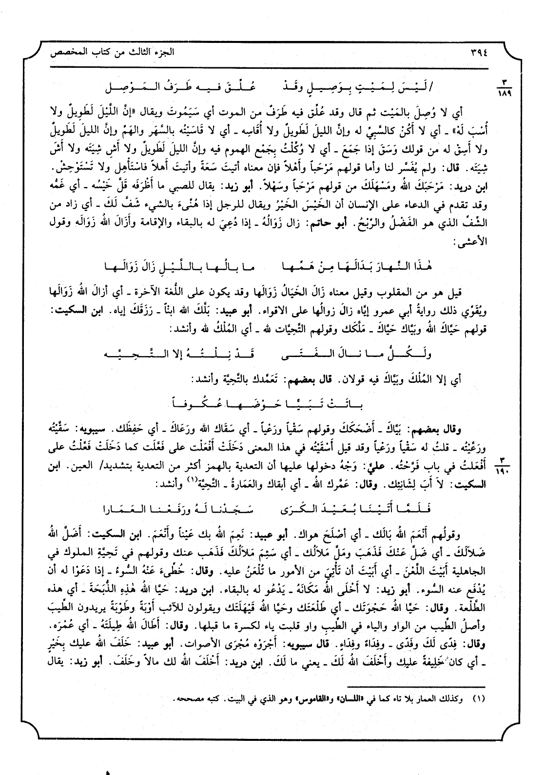 لَيْسَ لمَيت بوصيل وَقد علِقَ فِيهِ طرف الموصِل أَي لَا وُصِل بِالْمَيتِ ثمَّ قَالَ وَقد عُلِّق فِيهِ طرف من الْمَوْت أَي سيموت وَيُقَال إِن اللَّيْل لطَويل وَلَا أُسْبَ لَهُ - أَي أأكُن لَهُ كالسّبي لَهُ وإنّ اللَّيْل لطويل وَلَا أقاسه - أَي لَا قاسيته بالسّهر والهم وَإِن اللَّيْل طَوِيل وَلَا أسِقْ لَهُ من قَوْلك وسَق إِذا جمع - أَي لَا وكِّلْت بِجمع الهموم فِيهِ وإنّ اللَّيْل لطويل وَلَا أشِ شيتَه وَلَا أش شيَتَه. قَالَ: وَلم يفسّر لنا وَأما قَوْلهم مرْحَبًا وَأهلا فَإِن مَعْنَاهُ أتيت سَعة وأتيت أَهلا فاسْتأهِل وَلَا تستوحِش. ابْن دُرَيْد: مرحَبَك الله ومسْهلَك من قَوْلهم مرْحباً وسهْلاً. أَبُو زيد: يُقَال للصَّبِيّ مَا أظرفه قلّ خيْسُه - أَي غمّه وَقد تقدم فِي الدُّعَاء على الْإِنْسَان أَن الخيْس الْخَيْر وَيُقَال للرجل إِذا هُنّئ بالشَّيْء شفّ لَك - أَي زَاد من الشِفّ الَّذِي هُوَ الْفضل وَالرِّبْح. أَبُو حَاتِم: زَالَ زَواله - إِذا دُعِي لَهُ بِالْبَقَاءِ وَالْإِقَامَة وأزال الله زَواله وَقَول الْأَعْشَى: هَذَا النَّهَار بَدا لَهَا من همّها مَا بالُها بِاللَّيْلِ زَالَ زَوالَها قيل هُوَ من المقلوب وَقيل مَعْنَاهُ زَالَ الخيال زوالَها وَقد يكون على اللُّغَة الْآخِرَة - أَي أَزَال الله زَوَالهَا ويقوّي ذَلِك رِوَايَة أبي عَمْرو إِيَّاه زَالَ زوالُها على الإقواء. أَبُو عبيد: بلّك الله ابْناً - رزقك إِيَّاه. ابْن السّكيت: قَوْلهم حيّاك اله وبيّاك حيّاك - ملّكك وَقَوْلهمْ التّحيّات لله - أَي المُلك لله وَأنْشد: ولكلّ مَا نَالَ الْفَتى قد نلتُه إِلَّا التحيّهْ أَي إِلَّا المُلك وبيّاك فِيهِ قَولَانِ. قَالَ بَعضهم: تعمّدك بالتّحية وَأنْشد: بَانَتْ تبيّاً حوضَها عُكوفا وَقَالَ بَعضهم: بيّاك - أضْحكك وَقَوْلهمْ سَقياً ورعْياً - أَي سقاك الله ورعاك - أَي حفظك. سِيبَوَيْهٍ: سقّيتُه ورعْيته - قلت لَهُ سقيا ورعياً وَقد قيل أسقَيته فِي هَذَا الْمَعْنى دخلَت أفعلْت على فعلت كَمَا دخلت فعّلْت على أفعلْت فِي بَاب فرّحته. عليّ: وَجه دُخُولهَا عَلَيْهَا أَن التَّعْدِيَة بِالْهَمْز أَكثر من التَّعْدِيَة بتَشْديد الْعين. ابْن السّكيت: لَا أَب لشانئك. وَقَالَ: عُمّرك الله - أَي أبقاك والعَمارة - التَّحِيَّة وَأنْشد: فَلَمَّا أَتَيْنَا بُعيد الْكرَى سجدْن اله ورفعْنا العَمارا وَقَوْلهمْ أنعم الله بالك - أَي أصلح هَوَاك. أَبُو عبيد: نعِم الله بك عيْناً وأنعم. ابْن السّكيت: أضلّ الله ضلالَك - أَي ضلّ عَنْك مَذْهَب وملّ ملالُك - أَي سئم ملالُك فَذهب عَنْك وَقَوْلهمْ فِي تحيّة الْمُلُوك فِي الْجَاهِلِيَّة أبيْتَ اللعْن - أَي أَبيت أَن تَأتي من الْأُمُور مَا تُلعَن عَلَيْهِ. وَقَالَ: خُطئ عَنهُ السّوء - إِذا دعوا لَهُ أَن يُدفَع عَنهُ السوء. أَبُو زيد: لَا أخلى الله مكانَه - يَدْعُو لَهُ بِالْبَقَاءِ. ابْن دُرَيْد: حيّا الله هَذِه الذُبَحة - أَي هَذِه الطّلعة. وَقَالَ: حيّا الله حجوتَك - أَي طلعتَك وحيّا الله قيهلتك وَيَقُولُونَ للآئب أوبة وطوْبة يُرِيدُونَ الطِيب وأصل الطّيب من الْوَاو وَالْيَاء فِي الطّيب وَاو قلبت يَاء لكسرة مَا قبلهَا. وَقَالَ: أَطَالَ الله طيلتَه - أَي عمره. وَقَالَ: فدى لَك وفدى - وفداءٌ وفداءٍ. قَالَ سِيبَوَيْهٍ: اجْرَوْه مُجرى الْأَصْوَات. أَبُو عبيد: خلَف الله عَلَيْك بِخَير - أَي كَانَ خَليفَة عَلَيْك وأخلَف الله لَك - يَعْنِي مَالك. ابْن دُرَيْد: أخلف الله لَك مَالا وَخلف. أَبُو زيد: يُقَال