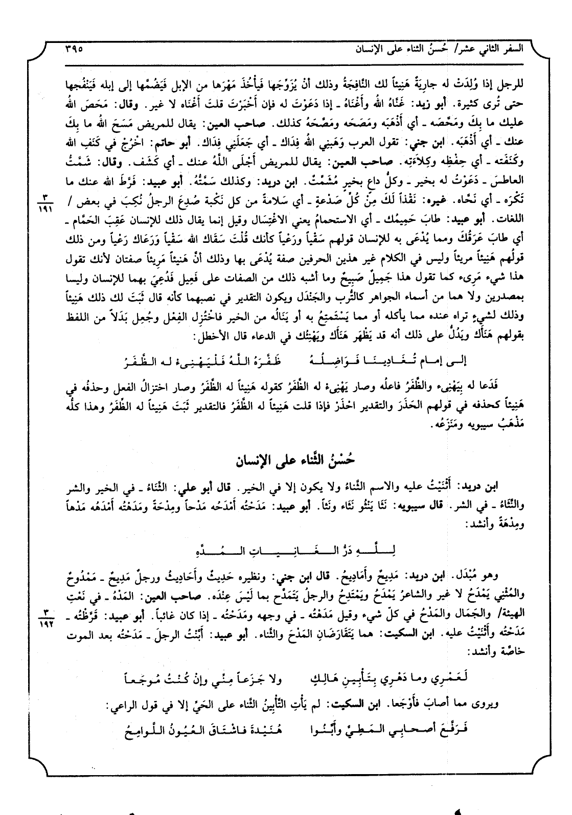 للرجل إِذا ولدَت لَهُ جَارِيَة هَنِيئًا لَك النّافِجة وَذَلِكَ أَن يزوِّجها فيأخذَ مهرَها من الْإِبِل فيضُمّها إِلَى إبِله فينفُجها حَتَّى تُرى كَثِيرَة. أَبُو زيد: غنّاه الله وأغناه - إِذا دعوْت لَهُ فَإِن أخبرْتَ قلت أغناه لَا غير. وَقَالَ: محصَ الله عَلَيْك مَا بك ومحّصه - أَي أذهبه ومصحَه ومصّحه كَذَلِك. صَاحب الْعين: يُقَال للْمَرِيض مسح الله مَا بك عَنْك - أَي أذهبه. ابْن جني: تَقول الْعَرَب وهَبني الله فِداك - أَي جعلني فِداك. أَبُو حَاتِم: اخرُج فِي كنَف الله وكنفَته - أَي حِفظِه وكلاءته. صَاحب الْعين: يُقَال للْمَرِيض أجلى الله عَنْك - أَي كشف. وَقَالَ: شمّتّ الْعَاطِس - دَعَوْت لَهُ بِخَير - وكل داعٍ بِخَير مشمّت. ابْن دُرَيْد: وَكَذَلِكَ سمّته. أَبُو عبيد: فرّط الله عَنْك مَا تكره - أَي نحّاه. غَيره: نقْذاً لَك من كل صدْعة - أَي سَلامَة من كل نكْبة صُدِع الرجل نُكِب فِي بعض اللُّغَات. أَبُو عبيد: طَابَ حميمُك - أَي الاستحمام يَعْنِي الاغتِسال وَقيل إِنَّمَا يُقَال ذَلِك للْإنْسَان عقِب الحمّام - أَي طَابَ عرقُك وممايُدعى بِهِ للْإنْسَان قَوْلهم سَقْياً ورعْياً كَأَنَّك قلت سقاك الله سقيا ورعاك رعْياً وَمن ذَلِك قَوْلهم هَنِيئًا مريئاً وَلَيْسَ فِي الْكَلَام غير هذَيْن الحرفين صفة يُدعى بهَا وَذَلِكَ أَن هَنِيئًا مريئاً صفتان لِأَنَّك تَقول هَذَا شَيْء مريء كَمَا تَقول هَذَا جميل صبيح وَمَا أشبه ذَلِك من الصِّفَات على فَعيل فدُعي بهما للْإنْسَان وليسا بمصدرين وَلَا هما من أَسمَاء الْجَوَاهِر كالتُرب والجنْدَل وَيكون التَّقْدِير فِي نصبهما كَأَنَّهُ قَالَ ثبتَ لَك ذَلِك هَنِيئًا وَذَلِكَ لشَيْء ترَاهُ عِنْده مِمَّا يَأْكُلهُ أَو مِمَّا يسْتَمْتع بِهِ أَو يَنَالهُ من الْخَيْر فاختُزِل الفِعل وجُعِل بدَلاً من اللَّفْظ بقَوْلهمْ هَنَّأَك ويدلّ على ذَلِك أَنه قد يظهَر هنأَك ويهنِئُك فِي الدُّعَاء قَالَ الأخطل: إِلَى إِمَام تُغادينا فواضِلُه ظفْرَه الله فليهنئ لَهُ الظّفَر فَدَعَا لَهُ بيهنئ والظّفر فَاعله وَصَارَ يهنئ لَهُ الظّفَر كَقَوْلِه هَنيئاً لَهُ الظّفر وَصَارَ اختزال الْفِعْل وحذفُه فِي هَنِيئًا كحذفه فِي قَوْلهم الحذَر وَالتَّقْدِير احْذَر فَإِذا قلت هَنِيئًا لَهُ الظّفَر فالتقدير ثبتَ هَنِيئًا لَهُ الظّفَر وَهَذَا كُله مَذْهَب سِيبَوَيْهٍ ومنزَعه.