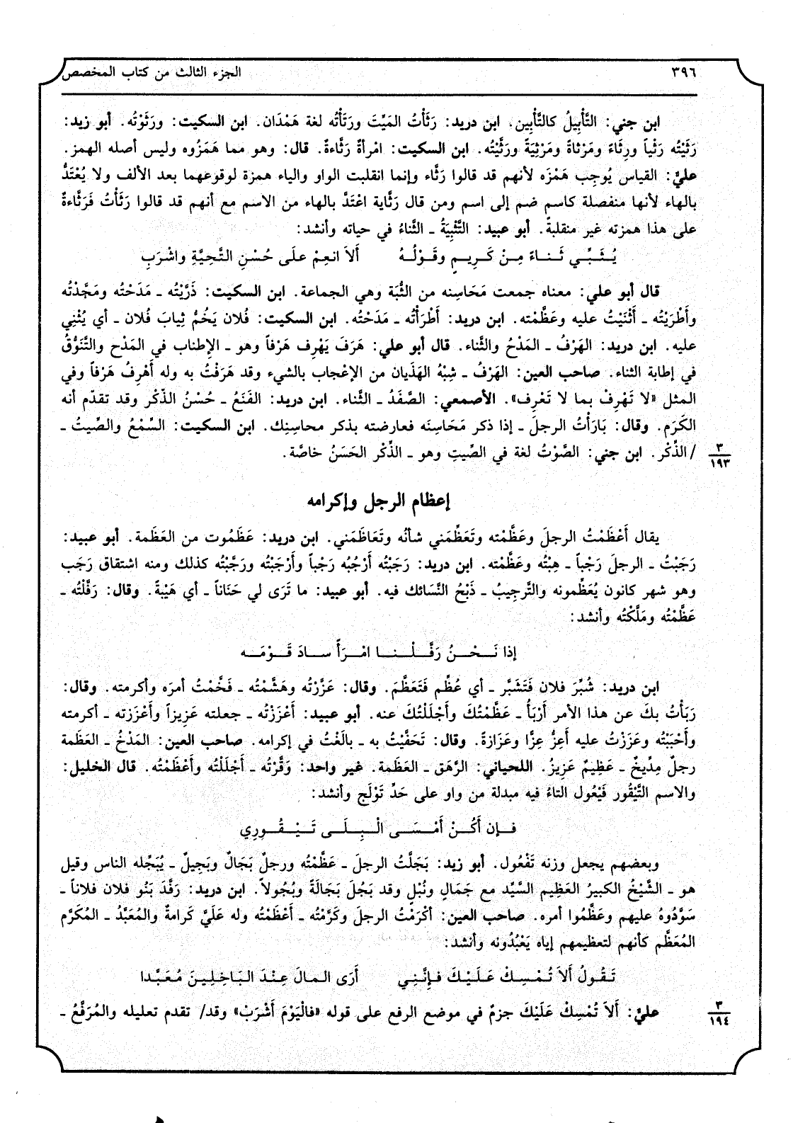 ابْن جني: التأبيل كالتّأبين. ابْن دُرَيْد: رثأتُ الميْت ورتأتُه لُغَة همْدان. ابْن السّكيت: ورثَوْته. أبوزيد: رثيتُه رثْياً ورثاء ومرْثاة ومرثية ورثيْته. ابْن السّكيت: امْرَأَة رثّاءة. قَالَ: وَهُوَ مِمَّا همزوه وَلَيْسَ أَصله الْهَمْز. عَليّ: الْقيَاس يوجِب همزه لأَنهم قد قَالُوا رَثّاه وَإِنَّمَا انقلبت الْوَاو وَالْيَاء همزَة لوقوعهما بعد الْألف وَلَا يُعتدّ بِالْهَاءِ لِأَنَّهَا مُنْفَصِلَة كاسم ضم إِلَى اسْم وَمن قَالَ رثّاية اعتدّ بِالْهَاءِ من الِاسْم مَعَ أَنهم قد قَالُوا رثأت فرثّاءة على هَذَا همزته غير منقلبة. أَبُو عبيد: التثْبية - الثّناء فِي حَيَاته وَأنْشد: يُثَبّي ثَناءً من كريم وَقَوله أَلا انعِمْ على حُسن التَّحِيَّة واشرَبِ قَالَ أَبُو عَليّ: مَعْنَاهُ جمعت محاسِنه من الثُبة وَهِي الْجَمَاعَة. ابْن السّكيت: ذرّيتُه - مدحْته ومجّدته وأطريته - أثنيت عَلَيْهِ وعظّمته. ابْن دُرَيْد: أطرأته - مدحته. ابْن السّكيت: فلَان يخُمّ ثيابَ فلَان - أَي يثني عَلَيْهِ. ابْن دُرَيْد: الهرْف - المدْح وَالثنَاء. قَالَ أَبُو عَليّ: هرَف يهرِف هرْفاً وَهُوَ - الإطناب فِي الْمَدْح والتنوّق فِي إطابة الثَّنَاء. صَاحب الْعين: الهرْف - شبه الهذَيان من الْإِعْجَاب بالشَّيْء وَقد هرَفْت بِهِ وَله أهرِف هرْفاً وَفِي الْمثل) لَا تهرِف بِمَا لَا تعرِف (. الْأَصْمَعِي: الصّفَد - الثَّنَاء. ابْن دُرَيْد: الفنَع - حُسن الذِكر وَقد تقدم أَنه الكرَم. وَقَالَ: بارأْت الرجل - إِذا ذكر محاسِنه فعارضته بِذكر محاسِنك. ابْن السّكيت: السِمْع والصّيت - الذِكر. ابْن جني: الصّوت لُغَة فِي الصِيت وَهُوَ - الذكرالحسَن خاصّة.
