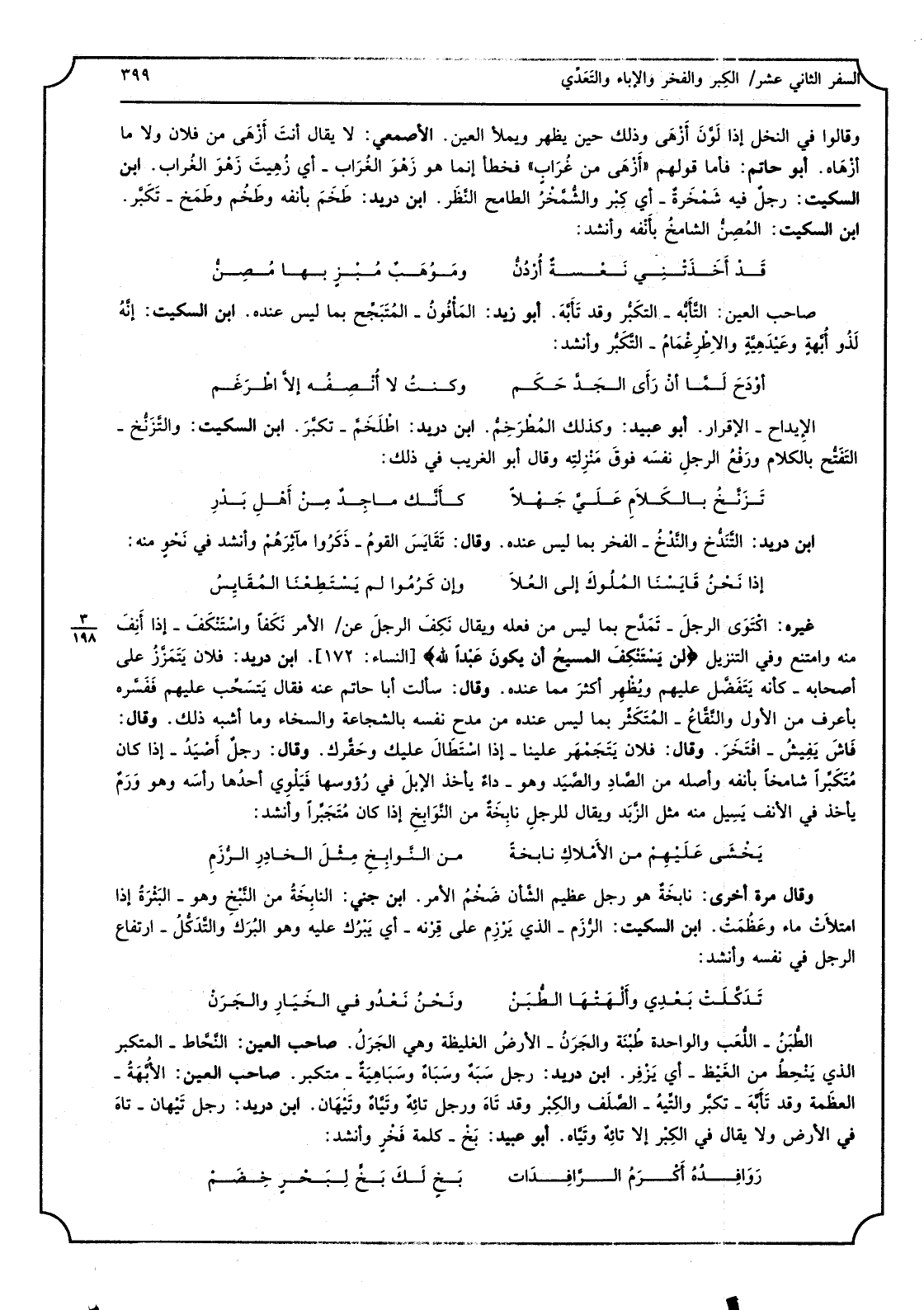 وَقَالُوا فِي النّخل إِذا لوّن أزْهى وَذَلِكَ حِين يظْهر ويملأ الْعين. الْأَصْمَعِي: لَا يُقَال أنتَ أزْهى من فلَان وَلَا مَا أزْهاه. أَبُو حَاتِم: فَأَما قَوْلهم) أزهى من غُراب (فخطأ إِنَّمَا هُوَ زَهْو الغُراب - أَي زُهيتَ زهْو الغُراب. ابْن السّكيت: رجل فِيهِ شمْخَرة - أَي كِبْر والشُمّخْر الطامح النّظر. ابْن دُرَيْد: طخَم بِأَنْفِهِ وطخُم وطمَخ - تكبّر. ابْن السّكيت: المُصِنُّ - الشامخ بأنْفه وَأنْشد: قد أخذَتْني نعْسة أرْدُنّ وموهَبٌ مُبْزٍ مُصِنّ صَاحب الْعين: التّأبّه - التكبّر وَقد تأبّه. أَبُو زيد: المأفون - المتبجّح بِمَا لَيْسَ عِنْده. ابْن السّكيت: إِنَّه لَذو أبهة وعَيدَهيّة والاطِرْغْمام - التكبّر وَأنْشد: أودَح لمّا أنْ رأى الجدَ حكَم وكنتُ لَا أنصِفه إِلَّا اطْرَغَم الإيداح - الْإِقْرَار. أَبُو عبيد: وَكَذَلِكَ المُطرَخِمّ. ابْن دُرَيْد: اطلخَمّ - تكبّر. ابْن السّكيت: والتزنُّخ - التفتّح بالْكلَام وَرفع الرجل نَفسه فَوق مَنْزِلَته وَقَالَ أَبُو الْغَرِيب فِي ذَلِك: تزنّخُ بالْكلَام عليّ جهلا كَأَنَّك ماجِدٌ من أهلِ بدْرِ ابْن دُرَيْد: التّندّخ والنّدْخُ - الْفَخر بِمَا لَيْسَ عِنْده. وَقَالَ: تقايَس الْقَوْم - ذكرُوا مآثرهم وَأنْشد فِي نَحْو مِنْهُ: إِذا نحنُ قايَسْنا الملوكَ إِلَى العُلا وَإِن كرُموا لم يستطِعْنا المُقايس غَيره: اكتوى الرجل - تمدّح بِمَا لَيْسَ من فعله وَيُقَال نكِف الرجل عَن الْأَمر نكَفاً واستنكَف - إِذا أنِف مِنْهُ وَامْتنع وَفِي التَّنْزِيل) لن يستنكِف المسيحُ أَن يكون عبْداً لله (. ابْن دُرَيْد: فلَان يتمزّز على أَصْحَابه - كَانَ يتفضّل عَلَيْهِم ويُظهِر أَكثر مِمَّا عِنْده. وَقَالَ: سَأَلت أَبَا حَاتِم عَنهُ فَقَالَ يتسحّب عَلَيْهِم ففسره بأعرف من الأول والنّقّاع - المتكثّر بِمَا لَيْسَ عِنْده من مدح نَفسه بالشجاعة والسخاء وَمَا أشبه ذَلِك. وَقَالَ: فاشَ يفيشُ - افتخَر. وَقَالَ: فلَان يتجمْهَر علينا - إِذا استطال عَلَيْك وحقّرك. وَقَالَ: رجل أصْيَد - إِذا كَانَ متكبّراً شامخاً بِأَنْفِهِ وَأَصله من الصّاد والصّيَد وَهُوَ - دَاء يَأْخُذ الْإِبِل فِي رؤوسها فيلوي أحدُها رَأسه وَهُوَ ورَم يَأْخُذ فِي الْأنف يسيل مِنْهُ مثل الزّبد وَيُقَال للرجل نابخة من النّوابخ إِذا كَانَ متجبّراً وَأنْشد: يخْشَى عَلَيْهِم من الْأَمْلَاك نابخة من النوابخ مثل الخادر الرزُم وَقَالَ مرّة أُخْرَى: نابخة هُوَ رجل عَظِيم الشّأن ضخم الْأَمر. ابْن جني: النابخة من النّبِخ وَهُوَ - البثْرة إِذا امْتَلَأت مَاء وعظُمت. ابْن السّكيت: الرُزَم - الَّذِي يرزِم على قِرنه - أَي يبرُك عَلَيْهِ وَهُوَ البرَك والتدكّل - ارْتِفَاع الرجل فِي نَفسه وَأنْشد: تدكّلت بعدِي وألْهَتها الطُبَن وَنحن نعدو فِي الخَبار والجرَنْ الطُبَن - اللُعَب الْوَاحِدَة طُنبة والجرَن - الأَرْض الغليظة وَهِي الجرَل. صَاحب الْعين: النّحّاط - المتكبر الَّذِي ينحِط من الغيظ ? ? أَي يزفِر. ابْن دُرَيْد: رجل سبَه وسَباه وسباهية - متكبر. صَاحب الْعين: الأبّهة - العظمة وَقد تأبّه - تكبّر والتّيه - الصّلَف والكِبْر وَقد تاه وَرجل تائه وتَيّاه وتيْهان. ابْن دُرَيْد: رجل تيهان - تاه فِي الأَرْض وَلَا يُقَال فِي الكِبْر إِلَّا تائه وتيّاه. أَبُو عبيد: بخْ - كلمة فَخر وَأنْشد: روافُدُه أكْرَم الرافدات بخٍ لَك بخٍ لبحرٍ خضَمّ