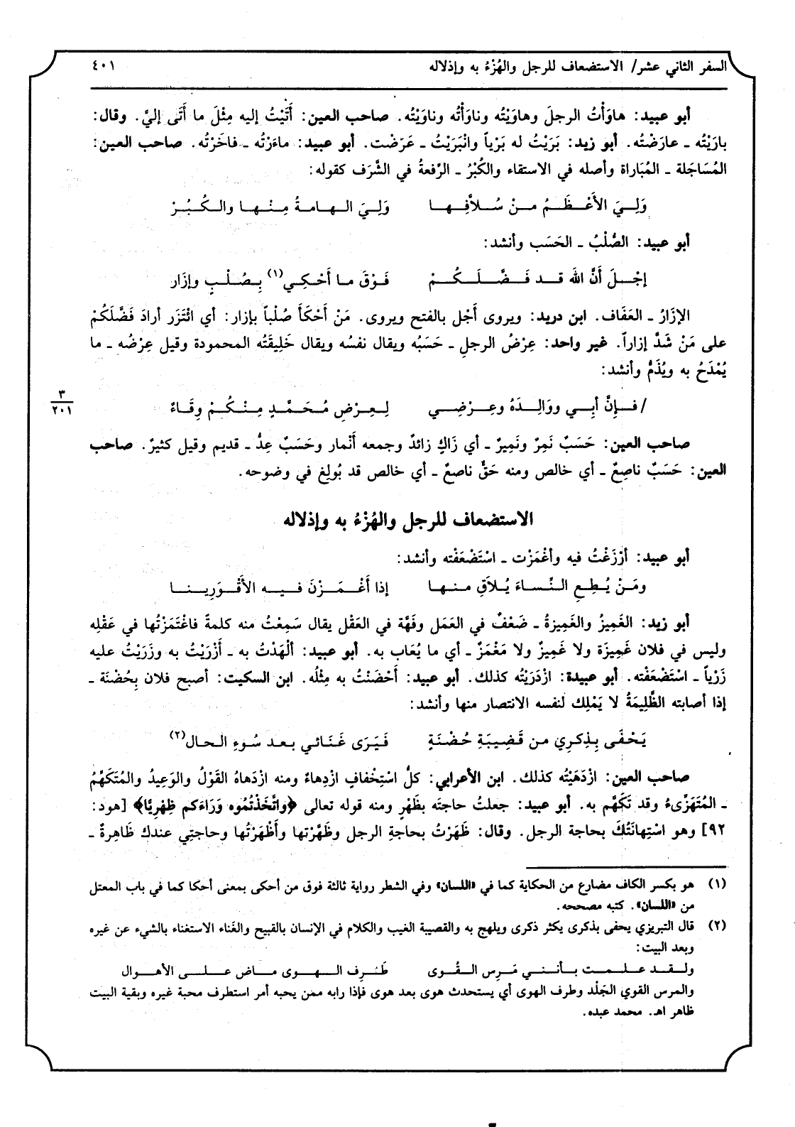أَبُو عبيد: أرْزَغْتُ فِيهِ وأغْمَزْت - استَضعَفته وَأنْشد: ومَن يُطِع النساءَ يلاقِ مِنْهَا إِذا أغْمَزْن فِيهِ الأقْوَرينا أَبُو زيد: الغَميزُ والغميزة - ضعْف فِي العمَل وفهّة فِي العَقْل يُقَال سَمِعت مِنْهُ كلمة فاغتمزْتُها فِي عقله وَلَيْسَ فِي فلَان غَميزة وَلَا غميز وَلَا مغمَز - أَي مَا يُعاب بِهِ. أَبُو عبيد: ألهَدْت بِهِ - أزرَيتُ بِهِ وزريْتُ عَلَيْهِ زَرْياً - استضعفته. أَبُو عُبَيْدَة: ازدرَيْتُه كَذَلِك. أَبُو عبيد: أحضَنْت بِهِ مثله. ابْن السّكيت: أصبح فلَان بحُضنة - إِذا أَصَابَته الظّليمة لَا يملِك لنَفسِهِ الِانْتِصَار مِنْهَا وَأنْشد: يَحفى بذكرى من قضيبة حُضنَةٍ فَيرى غَنائي بعد سوء الْحَال صَاحب الْعين: ازدهيته كَذَلِك. ابْن الْأَعرَابِي: كل استخفاف ازدِهاء وَمِنْه ازدهاه القَوْل والوعيد والمتكهّم - المتهزّئ وَقد تكهّم بِهِ. أَبُو عبيد: جعلتُ حاجتَه بظَهْر وَمِنْه قَوْله تَعَالَى) واتّخذتموه وراءكم ظِهرياً (وَهُوَ استهانتك بحاجة الرجل. وَقَالَ: ظهرْت بحاجة الرجل وظهّرْتها وأظهرْتُها وحاجتي عنْدك ظَاهِرَة -
