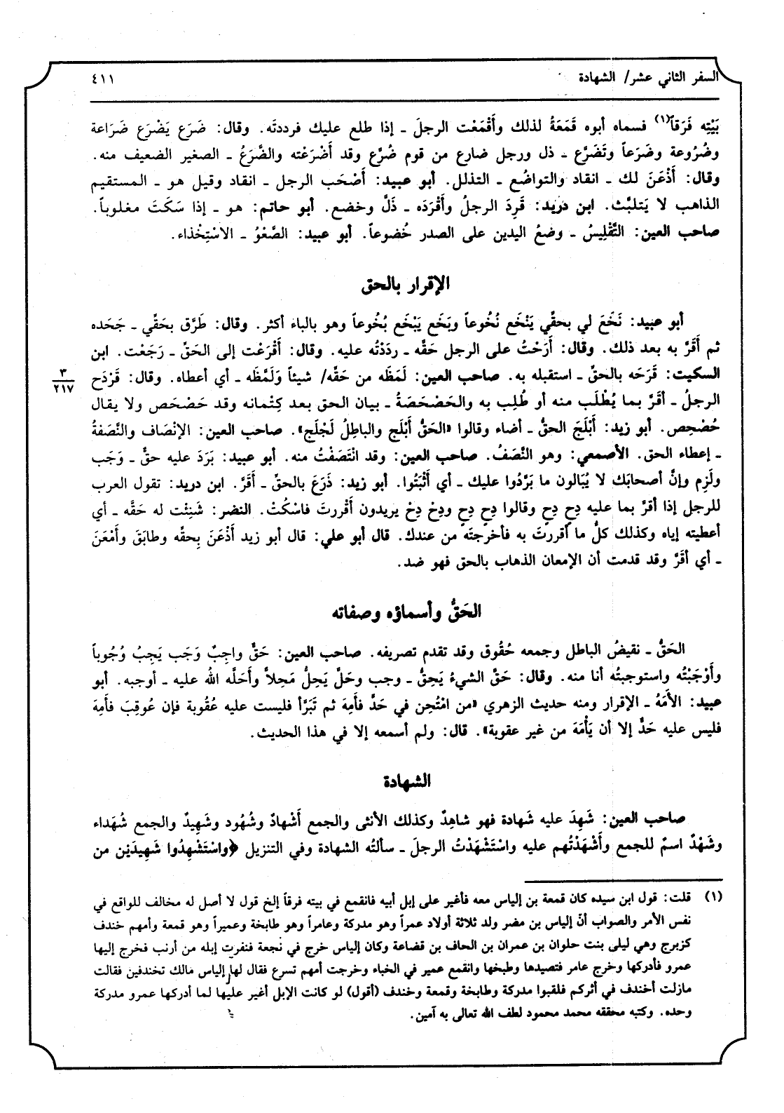 صَاحب الْعين: شهِد عَلَيْهِ شَهَادَة فَهُوَ شَاهد وَكَذَلِكَ الْأُنْثَى وَالْجمع أشهاد وشُهود وشهيد وَالْجمع شُهَدَاء وشهْد اسْم للْجمع وأشهدْتهم عَلَيْهِ واستشهدْت الرجل - سَأَلته الشَّهَادَة وَفِي التَّنْزِيل) واستشهِدوا شهيدين من