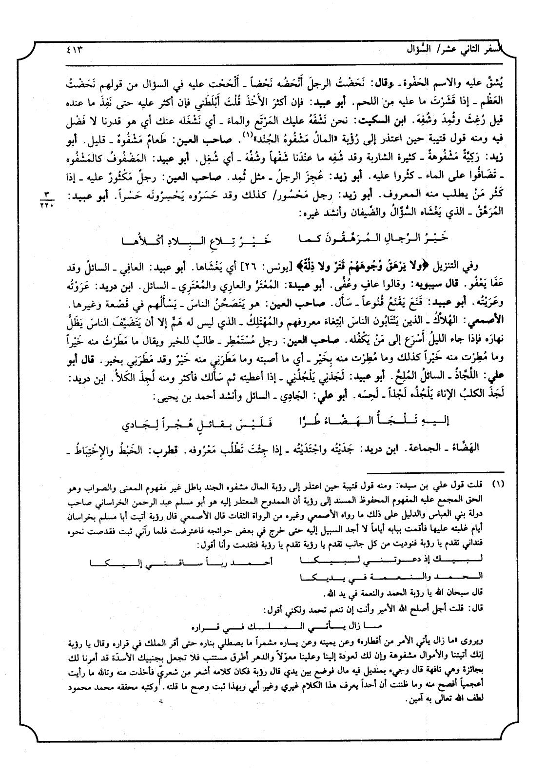 يشُقّ عَلَيْهِ وَالِاسْم الحَفوة. وَقَالَ: نحضْت الرجلَ أنحضُه نحْضاً - ألححت عَلَيْهِ فِي السُّؤَال من قَوْلهم نحضْت العظْم - إِذا قشَرْت مَا عَلَيْهِ من اللَّحْم. أَبُو عبيد: فَإِن أَكثر الأخْذ قلتَ أبلطَني فَإِن أَكثر عَلَيْهِ حَتَّى نفِد مَا عِنْده قيل رُغِثَ وثُمِد وشُفِه. ابْن السّكيت: نَحن نشفَه عَلَيْك المرتَع وَالْمَاء - أَي نشغَله عَنْك أَي هُوَ قَدرنَا لَا فضل فِيهِ وَمِنْه قَول قُتَيْبَة حِين اعتذر إِلَى رؤبة المالُ مشفوهُ الجُند. صَاحب الْعين: طَعَام مشفوه - قَلِيل. أَبُو زيد: ركيّة مشفوهة - كَثِيرَة الشاربة وَقد شُفِه مَا عندنَا شفْهاً وشُفِه - أَي شُغِل. أَبُو عبيد: المضعوف كالمشفوه - تضافّوا على المَاء - كَثُرُوا عَلَيْهِ. أَبُو زيد: عُجِز الرجل - مثل ثُمِد. صَاحب الْعين: رجل مكثور عَلَيْهِ - إِذا كثُر من يطْلب مِنْهُ الْمَعْرُوف. أَبُو زيد: رجل محْسور كَذَلِك وَقد حسروه يحسِرونه حسْراً. أَبُو عبيد: المرهَّق - الَّذِي يَغْشَاهُ السّؤال والضيفان وَأنْشد غَيره: خيرُ الرِّجَال المرهّقون كَمَا خيرُ تِلاع الْبِلَاد أكلأها وَفِي التَّنْزِيل) وَلَا يرهَق وجوهَهم قَتر وَلَا ذِلّة (أَي يَغْشَاهَا. أَبُو عبيد: الْعَافِي - السَّائِل وَقد عَفا يعْفُو. قَالَ سِيبَوَيْهٍ: وَقَالُوا: عافٍ وعُفّى. أَبُو عُبَيْدَة: المعترّ والعاري والمعتَري - السَّائِل. ابْن دُرَيْد: عرَوْته وعرَيْته. أَبُو عبيد: قنع يقنَع قُنوعاً - سَأَلَ. صَاحب الْعين: هُوَ يتصحّن النَّاس - يسألهم فِي قَصْعَة وَغَيرهَا. الْأَصْمَعِي: الهُلاّك - الَّذين ينتابون النَّاس ابْتِغَاء معروفهم والمهتلِك - الَّذِي لَيْسَ لَهُ همّ إِلَّا أَن يتضيّف النَّاس يظل نهارَه فَإِذا جَاءَ اللَّيْل أسْرع إِلَى من يكفُله. صَاحب الْعين: رجل مستمطِر - طَالب للخير وَيُقَال مَا مطَرْت مِنْهُ خيرا وَمَا مُطِرْت مِنْهُ خيرا كَذَلِك وَمَا مُطِرت مِنْهُ بِخَير - أَي مَا أصبته وَمَا مطرَني مِنْهُ خير وَقد مطرني بِخَير. قَالَ أَبُو عَليّ: اللّجّاذ - السَّائِل المُلحّ. أَبُو عبيد: لجذني يلجذُني - إِذا أَعْطيته ثمَّ سَأَلَك فَأكْثر وَمِنْه لُجِذ الْكلأ. ابْن دُرَيْد: لجذَ الكلبُ الْإِنَاء يلجذُه لجْذاً - لحِسَه. أَبُو عَليّ: الجادي - السَّائِل وَأنْشد أَحْمد بن يحيى: إِلَيْهِ تلجأ الهضّاء طُرّاً فَلَيْسَ بقائل هُجْراً لجادي الهضّاءُ - الْجَمَاعَة. ابْن دُرَيْد: جدَيْته واجتديته - إِذا جِئْت تطلب معروفه. قطرب: الْخبط والاختباط -