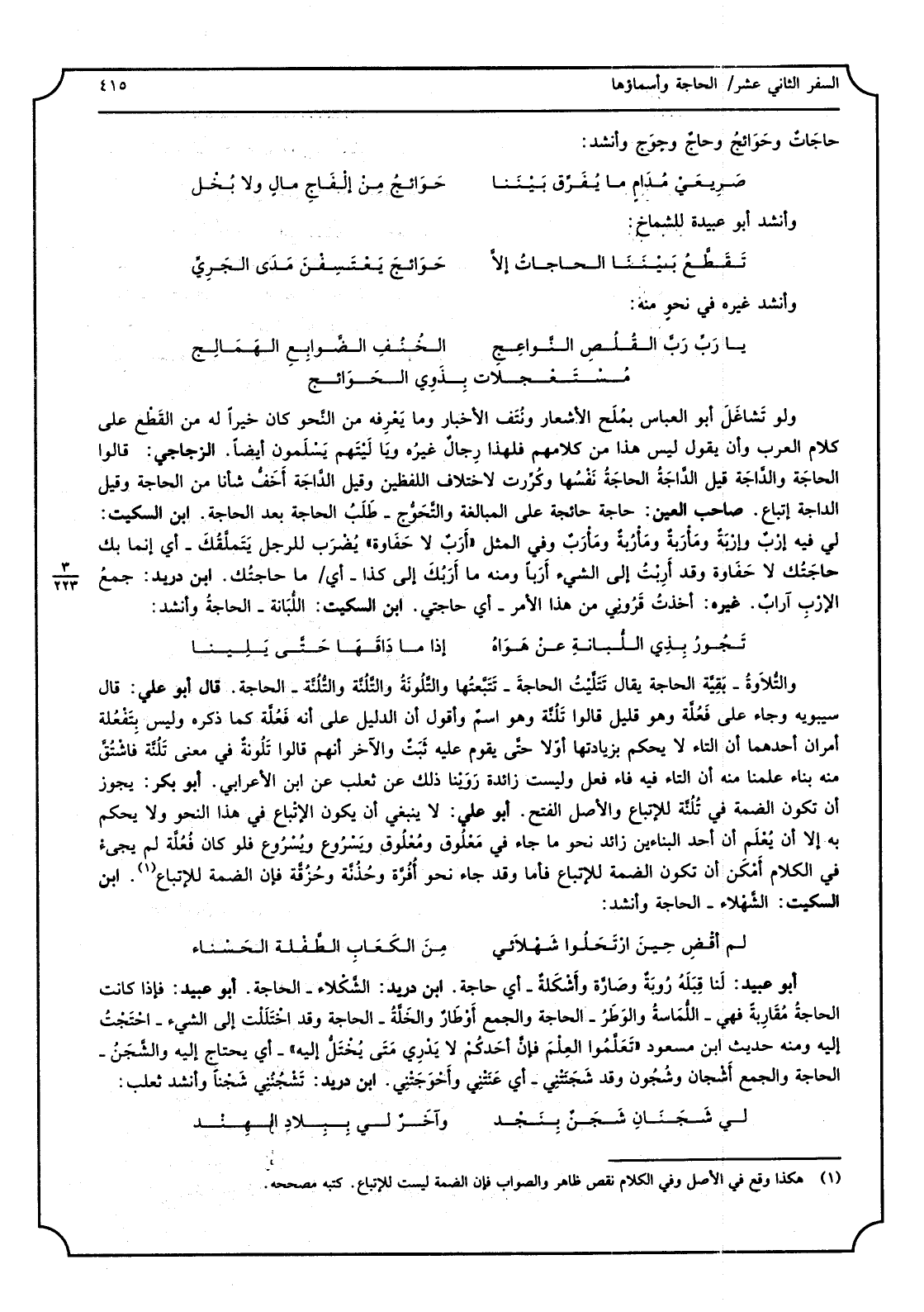 وحوائج وحاج وحوَج وَأنْشد: صريعَي مُدام مَا يفرّق بَيْننَا حوائج من إلفاج مَال وَلَا بُخل وَأنْشد أَبُو عُبَيْدَة للشماخ: تقطّع بَيْننَا الْحَاجَات إِلَّا حوائجَ يعتسِفْن مدى الجريّ وَأنْشد غَيره فِي نَحْو مِنْهُ: يَا ربّ ربّ القُلُص النّواعج الخُنُف الضّوابِع الهَمالِج مستعجلات بذوي الْحَوَائِج وَلَو تشاغل أَبُو الْعَبَّاس بمُلَح الْأَشْعَار ونُتَف الْأَخْبَار وَمَا يعرِفه من النّحو كَانَ خيرا لَهُ من القَطْع على كَلَام الْعَرَب وَأَن يَقُول لَيْسَ هَذَا من كَلَامهم فَلهَذَا رجال غَيره وَيَا ليتَهم يسلَمون أَيْضا. الزجاجي: قَالُوا الْحَاجة والدّاجة قيل الدّاجة الْحَاجة نَفسهَا وكُرِّرت لاخْتِلَاف اللَّفْظَيْنِ وَقيل الدّاجة أخفّ شَأْنًا من الْحَاجة وَقيل الداجة اتِّبَاع. صَاحب الْعين: حَاجَة حائجة على الْمُبَالغَة والتحوّج - طلب الْحَاجة بعد الْحَاجة، ابْن السّكيت: لي فِيهِ إرب وإربَة ومأرَبة ومأرُبة ومأرَب وَفِي الْمثل) أرَبٌ لَا حَفاوة (يضرَب للرجل يتملّقك - أَي إِنَّمَا بك حَاجَتك لَا حفاوة وَقد أرِبْت إِلَى الشَّيْء أرَباً وَمِنْه مَا أرَبُك إِلَى كَذَا - أَي مَا حَاجَتك. ابْن دُرَيْد: جمع الإرْب آرَاب. غَيره: أخذت قَروني من هَذَا الْأَمر - أَي حَاجَتي. ابْن السّكيت: اللُبانة - الْحَاجة وَأنْشد: تجور بِذِي اللُبانة عَن هَوَاهُ إِذا مَا راقها حَتَّى يَلينا والتُّلاوة - بقيّة الْحَاجة يُقَال تتلّيْت الْحَاجة - تتبّعتها والتّلونَة والتّلُنة والتُلُنّة - الْحَاجة. قَالَ أَبُو عَليّ: قَالَ سِيبَوَيْهٍ وَجَاء على فَعُلّة وَهُوَ قَلِيل قَالُوا تلُنّة وَهُوَ اسْم وَأَقُول إِن الدَّلِيل على أَنه فعُلّة كَمَا ذكره وَلَيْسَ بتفعُلة أَمْرَانِ أَحدهمَا أَن التَّاء لَا يحكم بزيادتها أَولا حَتَّى يقوم عَلَيْهِ ثبَت وَالْآخر أَنهم قَالُوا تَلونة فِي معنى تلنّة فاشتُقّ مِنْهُ بِنَاء علمنَا مِنْهُ أَن التَّاء فِيهِ فَاء فعل وَلَيْسَت زَائِدَة رويْنا ذَلِك عَن ثَعْلَب عَن ابْن الْأَعرَابِي. أَبُو بكر: يجوز أَن تكون الضمة فِي تُلُنّة لِلِاتِّبَاعِ وَالْأَصْل الْفَتْح. أَبُو عَليّ: لَا يَنْبَغِي أَن يكون الإتْباع فِي هَذَا النَّحْو وَلَا يحكم بِهِ إِلَّا أَن يُعْلَم أَن أحد البناءين زَائِد نَحْو مَا جَاءَ فِي معلوق ومُعلوق ويَسروع ويُسروع فَلَو كَانَ فُعُلّة لم يجِئ فِي الْكَلَام أمكن أَن تكون الضمة لِلِاتِّبَاعِ فَأَما وَقد جَاءَ نَحْو أُفرّة وحُذُنّة وحُزُقّة فَإِن الضمة لِلِاتِّبَاعِ. ابْن السّكيت: الشّهْلاء - الْحَاجة وَأنْشد: لم أقضِ حِين ارتحلوا شهْلائي من الكَعاب الطَّفلة الْحَسْنَاء أَبُو عبيد: لنا قِبَله رُوبَة وصارّة وأشكلة - أَي حَاجَة. ابْن دُرَيْد: الشّكْلاء - الْحَاجة. أَبُو عبيد: فَإِذا كَانَت الحاجةُ مقاربة فَهِيَ - اللُماسة والوطَر - الْحَاجة وَالْجمع أوطار والخَلّة - الْحَاجة وَقد اختللْت إِلَى الشَّيْء - احتجْت إِلَيْهِ وَمِنْه حَدِيث ابْن مَسْعُود تعلّموا العِلم فإنّ أحدكُم لَا يدْرِي مَتى يفخْتَلّ إِلَيْهِ - أَي يحْتَاج إِلَيْهِ والشّجَن - الْحَاجة وَالْجمع أشجان وشُجون وَقد شجنتْني - أَي عنتْني وأحوجتْني. ابْن دُرَيْد: تشجُنُني شجْناً وَأنْشد ثَعْلَب: لي شَجَنان شجَن بنجْد وَآخر لي بِبِلَاد الهِند