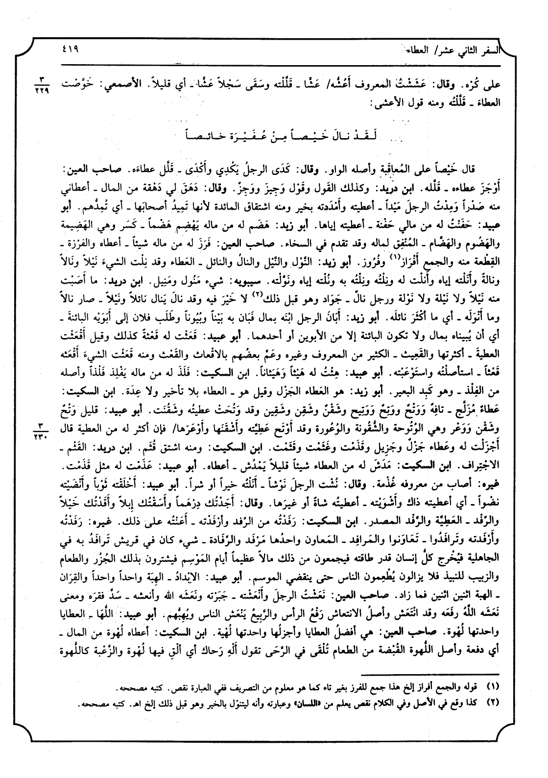 على كُره. وَقَالَ: عششْت الْمَعْرُوف أعُشّه عَشّاً - قلّلته وسَقى سَجْلاً عشّاً - أَي قَلِيلا. الْأَصْمَعِي: خوّصْت الْعَطاء - قلّلْته وَمِنْه قَول الْأَعْشَى: لقد نالَ خَيْصاً من عُفَيْرَة خائِصا قَالَ خيصاً على المُعاقبة وَأَصله الْوَاو. وَقَالَ: كدى الرجل يكدي وأكدى - قلل عطاءه. صَاحب الْعين: أوجز عطاءه - قلله. ابْن دُرَيْد: وَكَذَلِكَ القَوْل وَقَول وجيز ووجِز. وَقَالَ: دهَق لي دهقة من المَال - أَعْطَانِي مِنْهُ صدْراً ومِدْت الرجلَ مَيْداً - أَعْطيته وأمددته بِخَير وَمِنْه اشتقاق الْمَائِدَة لِأَنَّهَا تَميد أَصْحَابهَا - أَي تُمِدّهم. أَبُو عبيد: حفَنْت لَهُ من مَالِي حفْنَة - أَعْطيته إِيَّاهَا. أَبُو زيد: هضَم لَهُ من مَاله يهضِم هضماً - كسر وَهِي الهضيمة والهَضوم والهَضام - المُنفِق لمَاله وَقد تقدم فِي السخاء. صَاحب الْعين: فرزَ لَهُ من مَاله شَيْئا - أعطَاهُ والفرْزة - الْقطعَة مِنْهُ وَالْجمع أفراز وفُروز. أَبُو زيد: النّوْل والنَّيْل والنال والنائل - الْعَطاء وَقد نِلْت الشَّيْء نَيْلاً ونالاً ونالة وأنلته إِيَّاه وأنلْت لَهُ ونِلْته ونِلته بِهِ ونلته إِيَّاه ونوّلته. سيبوه: شَيْء مَنول ومَنيل. ابْن دُرَيْد: مَا أصبت مِنْهُ نَيْلاً وَلَا نَيلة وَلَا نولة وَرجل نالٌ - جواد وَهُوَ قبل ذَلِك لَا خير فِيهِ وَقد نَالَ ينَال نائلاً ونَيلاً - صَار نالاً وَمَا أنوله - أَي مَا أَكثر نائلَه. أَبُو زيد: أبان الرجل ابْنه بِمَال فَبَان بِهِ بيْناً وبُيوناً وَطلب فلَان إِلَى أَبَوَيْهِ البائنة - أَي أَن يُبيناه بِمَال وَلَا تكون البائنة إِلَّا من الْأَبَوَيْنِ أَو أَحدهمَا. أَبُو عبيد: قعَثْت لَهُ قعثة كَذَلِك وَقيل أقعثت الْعَطِيَّة - أكثرتها والقَعيث - الْكثير من الْمَعْرُوف وَغَيره وعمّ بعضُهم بالاقععاث والقعْث وَمِنْه قعثت الشَّيْء أقعثه قعثاً - استأصلته واستوعبته. أَبُو عبيد: هِثت لَهُ هَيثاً وهيَثاناً. ابْن السّكيت: فلذ لَهُ من مَاله يفلِذ فلْذاً وَأَصله من الفِلذ وَهُوَ - كبد الْبَعِير. أَبُو زيد: هُوَ العَطاء الجزل وَقيل هُوَ - الْعَطاء بِلَا تَأْخِير وَلَا عِدَة. ابْن السّكيت: عَطاء مُزَلّج - تافه ووتْح ووتِح ووتيح وشقْن وشقِن وشَقين وَقد وتُحَت عطيته وشقُنت. أَبُو عبيد: قَلِيل وتْح وشقْن ووعْت وَهِي الوُتوحة والشُقونة والوعورة وَقد أوتح عطيّته وأشقَنها وأوعرَها فَإِن أَكثر لَهُ من الْعَطِيَّة قَالَ أجزلت لَهُ وَعَطَاء جزل وجزيل وقدمت وغثمت وقثمت. ابْن السّكيت: مدَش لَهُ من الْعَطاء شَيْئا قَلِيلا يمدُش - أعطَاهُ. أَبُو عبيد: عذَمْت لَهُ مثل قذمْت. غَيره: أصَاب من معروفه غُذْمة. وَقَالَ: نُشْت الرجل نوشاً - أنلته وأشْوَيْته - أَعْطيته شَاة أَو غَيرهَا. وَقَالَ: أجدْتك دِرهماً وأسقتُك إبِلا وأقدتُك خيْلاً والرِفد - الْعَطِيَّة والرّفد الْمصدر. ابْن السّكيت: رفدته من الرفد وأرفدته - أعنته على ذَلِك. غَيره: رفدته وأرفدته وترافدوا - تعاونوا والمافِد - المعاون وَاحِدهَا مرْفَد والرِفادة - شَيْء كَانَ فِي قُرَيْش ترافد بِهِ فِي الْجَاهِلِيَّة فَيخرج كل إِنْسَان قدر طاقته فَيجْمَعُونَ من ذَلِك مَالا عَظِيما أَيَّام الموسِم فيشترون بذلك الجزُر وَالطَّعَام وَالزَّبِيب للنبيذ فَلَا يزالون يُطعمون النَّاس حَتَّى قنقضي الْمَوْسِم. أَبُو عبيد: الإبْداد - الْهِبَة وَاحِدًا وَاحِدًا والقِران - الْهِبَة اثْنَيْنِ اثْنَيْنِ فَمَا زَاد. صَاحب الْعين: نعشْت الرجل وأنعشته - جبرْته ونعشَه الله وأنعشه - سدّ فقرَه وَمعنى نعشه الله رَفعه وَقد انْتَعش وأصل الانتعاش رفْع الرَّأْس والرْبيع ينعَش النَّاس ويهبّهم. أَبُو عبيد: اللُها - العطايا واحدتها لُهْوة. صَاحب الْعين: هِيَ أفضل العطايا وأجزلها واحدتها لُهية. ابْن السّكيت: أعطَاهُ لُهوة من المَال - أَي دفْعَة وأصل اللهوة القُبضة من الطَّعَام تُلقى فِي الرّحى تَقول ألْه رَحاك أَي ألْق فِيهَا لُهوة والزّعبة كاللهوة