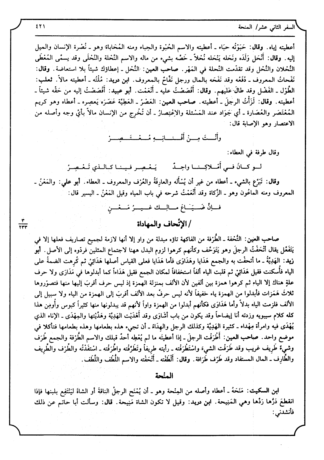 صَاحب الْعين: التُحفة - الطرفة من الْفَاكِهَة تاؤه مبدلة من وَاو إِلَّا أَنَّهَا لَازِمَة لجَمِيع تصاريف فعلهَا إِلَّا فِي يتفعّل يُقَال أتحفت الرجلَ وَهُوَ يتوحّف وَكَأَنَّهُم كَرهُوا لُزُوم الْبَدَل هَهُنَا لِاجْتِمَاع المثلين فردّوه إِلَى الأَصْل. أَبُو زيد: الهديّة - مَا أتحفت بِهِ وَالْجمع هَدَايَا وهداوى فَأَما هَدَايَا فعلى الْقيَاس أَصْلهَا هدائي ثمَّ كُرهت الضمة على الْيَاء فأُسكنت فَقيل هدائي ثمَّ قلبت الْيَاء ألفا اسْتِخْفَافًا لمَكَان الْجمع فَقيل هداءا كَمَا أبدلوها فِي مدارَى وَلَا حرف عِلّة هُنَاكَ إِلَّا الْيَاء ثمَّ كَرهُوا همزَة بَين أَلفَيْنِ لِأَن الْألف بِمَنْزِلَة الْهمزَة إِذْ لَيْسَ حرف أقرب إِلَيْهَا مِنْهَا فتصوّروها ثَلَاث همَزات فأبدلوا من الْهمزَة يَاء خَفِيفا لِأَنَّهُ لَيْسَ حرف بعد الْألف أقرب إِلَى الْهمزَة من الْيَاء وَلَا سَبِيل إِلَى الْألف فلزمت الْيَاء بَدَلا وَأما هَداوى فكأنهم أبدلوا من الْهمزَة واواً لأَنهم قد يبدلونها مِنْهَا كثيرا كبوس وأومِن هَذَا كُله كَلَام سِيبَوَيْهٍ وزدته أَنا إيضاحاً وَقد يكون من بَاب أشاوى وَقد أهدَيت الهديّة وهدّيتها والمِهدَى - الْإِنَاء الَّذِي يُهْدى فِيهِ وَامْرَأَة مِهْداء - كَثِيرَة الهديّة وَكَذَلِكَ الرجل والهِداء - أَن تَجِيء هَذِه بطعامها وَهَذِه بطعامها فتأكلا فِي مَوضِع وَاحِد. صَاحب الْعين: أطرفت الرجل - أذا أَعْطيته مَا لم يُعطِه أحد قبلك وَالِاسْم الطُرْفة وَالْجمع طرَف وَشَيْء طريف غَرِيب وَقد طرفْت الشَّيْء واستطرفته - رَأَيْته طريفاً وتطرّفته واطّرفته - استفدته والطِرْف والطّريف والطّارف - المَال الْمُسْتَفَاد وَقد طرُف طرافة. وَقَالَ: ألطَفته - أتحفْته وَالِاسْم اللطف واللطَف.