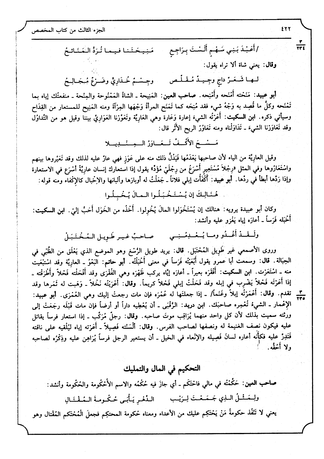 أعبْدَ بني سهم أَلَسْت براجع منيحتَنا فِيمَا تُرَدّ المنائحُ وَقَالَ: يَعْنِي شَاة أَلا ترَاهُ يَقُول: لَهَا شعر داجٍ وجيدٌ مقلّص وجسم خُداريّ وضرْع مُجالِح أَبُو عبيد: منحته أمنحه وأمنِحه. صَاحب الْعين: المنيحة - الشَّاة الممنوحة والمِنحة - منفعتك إِيَّاه بِمَا تمنحه وكل مَا قُصِد بِهِ وَجه شَيْء فقد مُنِحه كَمَا تمنح الْمَرْأَة وَجههَا الْمرْآة وَمِنْه المنيح للمستعار من القِداح وَسَيَأْتِي ذكره. ابْن السّكيت: أعرْته الشَّيْء إِعَارَة وعارة وَهِي العاريّة وتعوّرنا العواريّ بَيْننَا وَقيل هُوَ من التّداول وَقد تعاورْنا الشَّيْء - تداولناه وَمِنْه تعاور الرّيح الْأَثر قَالَ: مسْح الأكفّ تعاوَرُ المِنديلا وَقيل العاريّة من الْيَاء لِأَن صَاحبهَا يعدَمُهافيدلّ ذَلِك مِنْهُ على عوَز فَهِيَ عارٌ عَلَيْهِ لذَلِك وَقد تعيّروها بَينهم واستعاروها وَفِي الْمثل) رِجْلا مستعيرٍ أسْرع من رجلَيْ مؤدٍ (يَقُول إِذا استعارك إِنْسَان عاريّة أسْرع فِي الِاسْتِعَارَة وَإِذا ردّها أَبْطَأَ فِي ردهَا. أَبُو عبيد: أكفأت إبلي فلَانا - جعلت لَهُ أوبارَها وَأَلْبَانهَا والإخبال كالإكفاء وَمِنْه قَوْله: هُنَالك إِن يُستَخبَلوا المالَ يُخبِلوا وَكَانَ أَبُو عُبَيْدَة يرويهِ: هُنَالك إِن يُستخوَلوا المالَ يخوِلوا. أَخذه من الخوَل أحب إليّ. ابْن السّكيت: أخبَله فرَساً - أَعَارَهُ إِيَّاه يَغْزُو عَلَيْهِ وَأنْشد: وَلَقَد أغدو وَمَا يُعدِمُني صَاحب غير طَوِيل المختبَل وروى الْأَصْمَعِي غير طَوِيل المحتبل. قَالَ: يُرِيد طَوِيل الرُسْغ وَهُوَ الْموضع الَّذِي يعلَق من الظّبي فِي الحِبالة. قَالَ: وَسمعت أَبَا عَمْرو يَقُول أبعيْتُه فرَساً فِي معنى أخبلته. أَبُو حَاتِم: البعْو - العاريّة وَقد استبعَيت مِنْهُ - استعرت. ابْن السّكيت: أفقرَه بَعِيرًا - أَعَارَهُ إِيَّاه يركب ظَهره وَهِي الفُقْرى وَقد أفحلْته فحْلاً وأطرَقته - إِذا أعرته فحلاً يضرِب فِي إبِله وَقد فحلْت إبلي فحلاً كَرِيمًا. وَقَالَ: أعريته نخْلاً - وهبْت لَهُ ثَمَرهَا وَقد تقدم. وَقَالَ: أعمرْته إبِلا وَغنما - إِذا جَعلتهَا لَهُ عمرَه فَإِن مَاتَ رجعْت إِلَيْك وَهِي العُمرَى. أَبُو عبيد: الإعمار - الشَّيْء تُعمِره صاحبَك. ابْن دُرَيْد: الرُقْبى - أَن يُعْطِيهِ دَارا أَو أَرضًا فَإِن مَاتَ قبله رجعَتْ إِلَى ورثته سميت بذلك لِأَن كل وَاحِد مِنْهُمَا يراقب موت صَاحبه. وَقَالَ: رجل مركّب - إِذا اسْتعَار فرسا يُقَاتل عَلَيْهِ فَيكون نصف الْغَنِيمَة لَهُ وَنِصْفهَا لصَاحب الْفرس. وَقَالَ: ألسَنْته فصيلا - أعرته إِيَّاه ليُلقيه على نَاقَته فتدرّ عَلَيْهِ فَكَأَنَّهُ أَعَارَهُ لِسَان صيله والإنعاء فِي الْخَيل - أَن يستعير الرجل فرسا يراهِن عَلَيْهِ وذِكره لصَاحبه وَلَا أحُقّه.