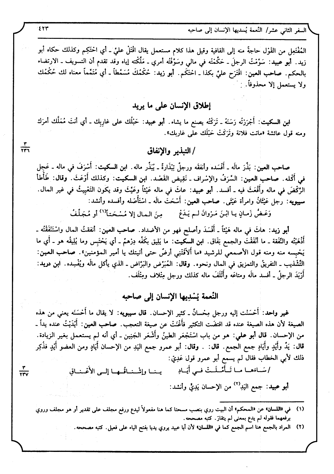 غير وَاحِد: أحسَنت إِلَيْهِ وَرجل مِحسان - كثير الْإِحْسَان. قَالَ سِيبَوَيْهٍ: لَا يُقَال مَا أحْسنه يَعْنِي من هَذِه الصِّيغَة لِأَن هَذِه الصِّيغَة عِنْده قد اقْتَضَت التكثير فأغْنت عَن صِيغَة التَّعَجُّب. صَاحب الْعين: أيْدَيت عِنْده يدا - من الْإِحْسَان. قَالَ أَبُو عَليّ: هُوَ من بَاب استجعَر الطين وأشعر الْجَنِين - أَي أَنه لم يسْتَعْمل بِغَيْر الزِّيَادَة. قَالَ: يَد وأيْدٍ وأيادٍ جمع الْجمع. قَالَ: وَقَالَ أَبُو عَمْرو جمع اليدِ من الْإِحْسَان أيادٍ وَمن الْعُضْو أيدٍ فذُكِر ذَلِك لأبي الْخطاب فَقَالَ لم يسمع أَبُو عَمْرو قَول عديّ: ساءَها مَا تأمّلت فِي أياد ينا وإشناقُها إِلَى الْأَعْنَاق أَبُو عبيد: جمع اليدِ من الْإِحْسَان يديُّ وَأنْشد: