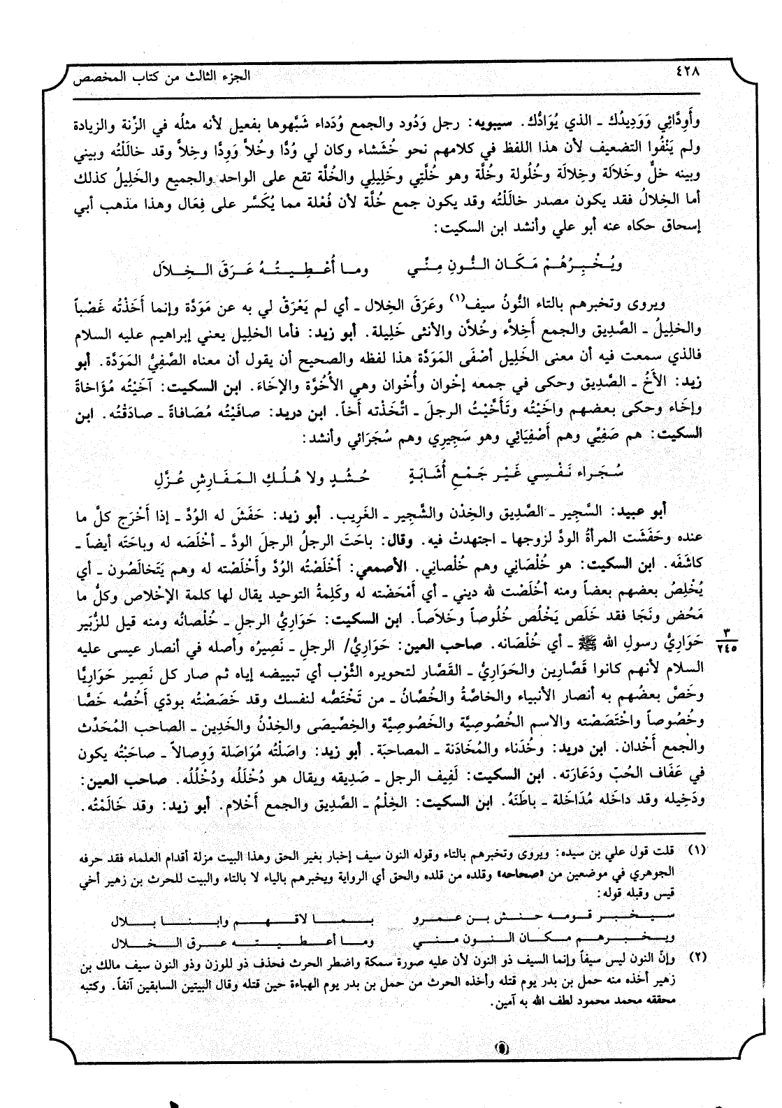 وأودّائي ووديدُك - الَّذِي يوادُّك. سِيبَوَيْهٍ: رجل ودود وَالْجمع وُدداء شبّهوها بفعيل لِأَنَّهُ مثلُ فِي الزِنة وَالزِّيَادَة وَلم ينفوا التَّضْعِيف لِأَن هَذَا اللَّفْظ فِي كَلَامهم نَحْو خُششاء وَكَانَ لي ودّاً وخُلاً ووِداً وخِلاً وَقد خالَلته وبيني وَبَينه خلُّ وخَلالة وخِلالة وخُلولة وخُلّة وَهُوَ خُلّتي وخَليلي والخُلّة تقع على الْوَاحِد والجميع والخليل كَذَلِك أما الخِلال فقد يكون مصدر خاللته وَقد يكون جمع خُلّة لِأَن فُعْلة مِمَّا يُكسّر على فِعال وَهَذَا مَذْهَب أبي إِسْحَاق حَكَاهُ عَنهُ أَبُو عَليّ وَأنْشد ابْن السّكيت: ويخبرهُم مَكَان النُّون مني وَمَا أُعطيته عرَق الخِلال ويروى وتخبرهم بِالتَّاءِ النُّون سيف وعرَق الخِلال - أَي لم يعرَق لي بِهِ عَن مودّة وَإِنَّمَا أَخَذته غصْباً والخليل - الصّديق وَالْجمع أخِلاّء وخُلاّن وَالْأُنْثَى خَلِيلَة. أَبُو زيد: فَأَما الْخَلِيل يَعْنِي إِبْرَاهِيم عَلَيْهِ السَّلَام فَالَّذِي سَمِعت فِيهِ أَن معنى الْخَلِيل أصْفى المودّة هَذَا لَفظه وَالصَّحِيح أَن يَقُول إِن مَعْنَاهُ الصّفيّ المودّة. أَبُو زيد: الأخُ - الصّديق وَحكى فِي جمعه إخْوَان وأُخوان وَهِي الأُخوّة والإخاء. ابْن السّكيت: آخيته مؤاخاة وإخاء وَحكى بَعضهم واخَيته وتأخّيت الرجلَ - اتخذته أَخا. ابْن دُرَيْد: صافيته مُصافاة - صادَقته. ابْن السّكيت: هم صِفيّتي وهم أصفِيائي وَهُوَ سَجيري وهم سُجرائي وَأنْشد: سُجَراء نَفسِي غير جمْعِ أُشابة حُشُدٍ وَلَا هُلُكِ المفارِش عُزّل أَبُو عبيد: السّجير - الصّديق والخِدْن والشّجير - الْغَرِيب. أَبُو زيد: حفَش لَهُ الودّ - إِذا أخرج كلّ مَا عِنْده وحفشَت الْمَرْأَة الودّ لزَوجهَا - اجتهدت فِيهِ. وَقَالَ: باحَتَ الرجل الرجلَ الودَّ - أخلصَه لَهُ وباحتَه أَيْضا - كاشفَه. ابْن السّكيت: هُوَ خُلْصاني وهم خُلصاني. الْأَصْمَعِي: أخلَصْته الودّ وأخلصْته لَهُ وهم يتخالصون - أَي يخلِص بَعضهم بَعْضًا وَمِنْه أخلصْت لله ديني - أَي أمحضْته لَهُ وَكلمَة التَّوْحِيد يُقَال لَهَا كلمة الْإِخْلَاص وكلّ مَا محُض ونَجا فقد خلص يخلُص خُلوصاً وخَلاصاً. ابْن السّكيت: حواريّ الرجل - خُلصانُه وَمِنْه قيل للزُبير حَواريّ رَسُول الله صلى الله عَلَيْهِ وَسلم - أَي خُلصانه. صَاحب الْعين: حَواريّ الرجل - نصيره وَأَصله فِي أنصار عِيسَى عَلَيْهِ السَّلَام لِأَنَّهُ كَانُوا قصّارين والحَواريّ - القصّار لتحويره الثّوب أَي تبييضه إِيَّاه ثمَّ صَار كل نصير حوارياً وخصّ بَعضهم بِهِ أنصار الْأَنْبِيَاء والخاصّة والخُصّان - من تختصّه لنَفسك وَقد خصصته بودي أخُصّه خصّاً وخُصوصاً واختصصْته وَالِاسْم الخصوصية والخَصوصية والخِصّيصَى والخِدْن والخَدين - الصاحب المحدّث وَالْجمع أخْدان. ابْن دُرَيْد: وخُدَناء والمخادنة - المصاحبة. أَبُو زيد: واصلْته مواصَلة ووِصالاً - صاحبته يكون فِي عَفاف الحبّ ودَعارته. ابْن السّكيت: لَفيف الرجل - صديقه وَيُقَال هُوَ دُخلَلُه ودُخلُلُه. صَاحب الْعين: ودَخيله وَقد دَاخله مُداخلة - باطنَه. ابْن السّكيت: الخِلْم الصّديق وَالْجمع أخلام. أَبُو زيد: وَقد خالمْته.