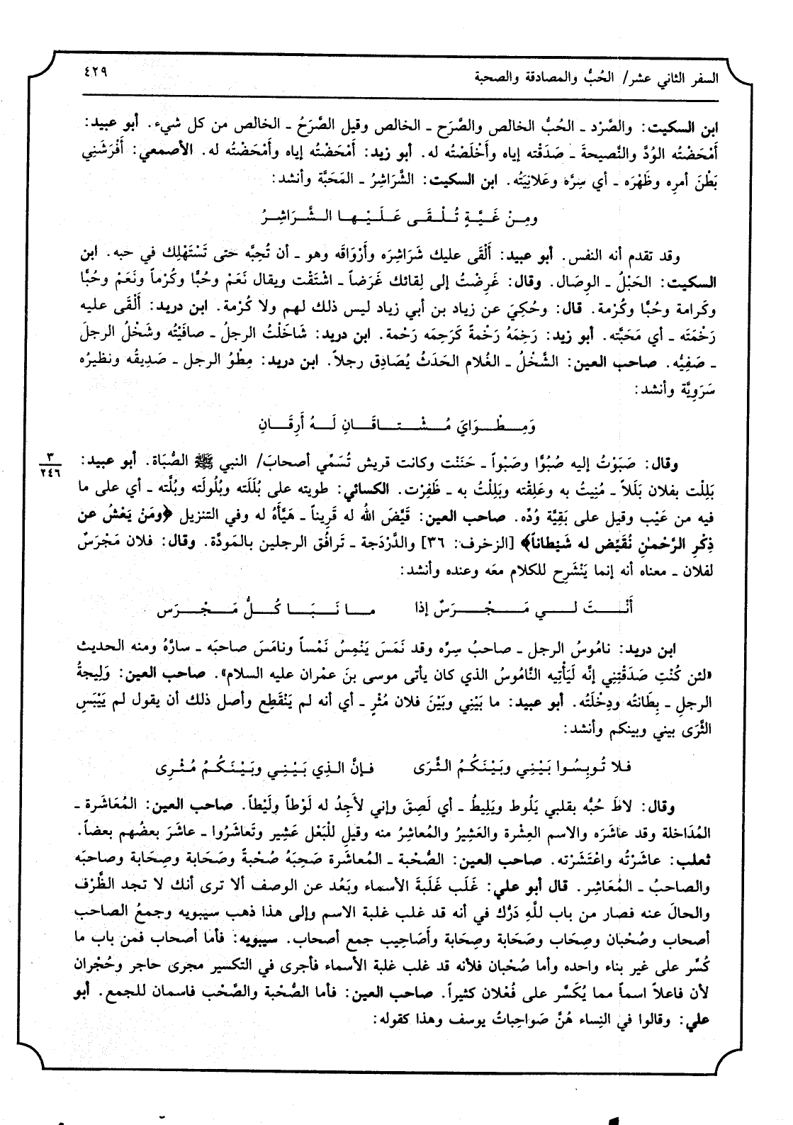 ابْن السّكيت: والصّرْد - الحبّ الْخَالِص والصّرَح - الْخَالِص وَقيل الصّرَح - الْخَالِص من كل شَيْء. أَبُو عبيد: أمحَضْته الودّ والنّصيحة - صدقْته إِيَّاه وأخلَصْتُه لَهُ. أَبُو زيد: أمحضْته إِيَّاه وأمحضْته لَهُ. الْأَصْمَعِي: أفرَشَني بطْن أمره وظهرَه - أَي سرّه وعلانيته. ابْن السّكيت: الشّراشِر - الْمحبَّة وَأنْشد: وَمن غَيّة تُلقى عَلَيْهَا الشّراشِرُ وَقد تقدم أَنه النَّفس. أَبُو عبيد: ألْقى عَلَيْك شراشِرَه وأرواقَه وَهُوَ - أَن تحبّه حَتَّى تستهلك فِي حبه. ابْن السّكيت: الحبْل - الوِصال. وَقَالَ: غرِضْت إِلَى لقائك غرَضاً - اشتقْت وَيُقَال نعم وحُبّاً وكُرماً وَنعم وحباً وكرامة وحباً وكُرمة. قَالَ: وحُكي عَن زِيَاد بن أبي زِيَاد لَيْسَ ذَلِك لَهُم وَلَا كرمة. ابْن دُرَيْد: ألْقى عَلَيْهِ رخمته - أَي محبته. أَبُو زيد: رخِمَه رخْمة كرحمه رَحْمَة. ابْن دُرَيْد: شاخَلْت الرجل - صافيتُه وشخْل الرجل - صفيّه. صَاحب الْعين: الشّخْل - الغُلام الحَدِيث يصادِق رجلا. ابْن دُرَيْد: مِطْو الرجل - صديقه وَنَظِيره وسَرَويّة وَأَشد: ومِطْوايَ مُشتاقان لَهُ أرِقانِ وَقَالَ: صبوْت إِلَيْهِ صُبُوّاً وصَبْواً - حننْت وَكَانَت قُرَيْش تسمي أَصْحَاب النَّبِي صلى الله عَلَيْهِ وَسلم الصُباة. أَبُو عبيد: بلِلْت بفلان بللاً - مُنيت بِهِ وعلِقته وبلِلْت بِهِ - ظفِرت. الْكسَائي: طويته على بُللَته وبُلولَته وبُلّته - أَي عَليّ مَا فِيهِ من عيب وَقيل على بَقِيَّة ودّه. صَاحب الْعين: قيّض الله لَهُ قريناً - هيّأه لَهُ وَفِي التَّنْزِيل) وَمن يعْشُ عَن ذِكر الرّحمنِ نقيّض لَهُ شَيْطَانا (والدّرْدَجة - ترافُق الرجلَيْن بالمودّة. وَقَالَ: فلَان مَجْرس لفُلَان - مَعْنَاهُ أَنه إِنَّمَا ينشرِح للْكَلَام مَعَه وعندَه وَأنْشد: أَنْت لي مجْرَس إِذا مَا نَبا كلّ مجْرَس ابْن دُرَيْد: ناموس الرجل - صَاحب سِرّه وَقد نمَس ينمِس نمْساً ونامَس صاحبَه - سارّه وَمِنْه الحَدِيث) لَئِن كنتِ صدَقْتِني إِنَّه ليَأْتِيه النّاموس الَّذِي كَانَ يَأْتِي مُوسَى بنَ عِمران عَلَيْهِ السَّلَام (. صَاحب الْعين: وليجة الرحلِ - بِطانتُه ودِخْلَته. أَبُو عبيد: مَا بيني وَبَين فلَان مُثْر - أَي أَنه لم يَنْقَطِع وأصل ذَلِك أَن يَقُول لم ييْبَس الثّرى بَين وَبَيْنكُم وَأنْشد: فَلَا تُوبِسوا بيني وبينَكُم الثّرى فإنّ الَّذِي بيني وبينكُمُ مُثري وَقَالَ: لاطَ حُبّه بقلبي يلوط ويَليط - أَي لصِق وَإِنِّي لأجِد لَهُ لوْطاً ولَيْطاً. صَاحب الْعين: المعاشرة - المداخلة وَقد عاشرَه وَالِاسْم العِشْرة والعَشير والمعاشِر مِنْهُ وَقيل للبَعْل عَشير وتعاشَروا - عَاشر بَعضهم بَعْضًا. ثَعْلَب: عاشَرْته واعتشرْته. صَاحب الْعين: الصُحبة - المعاشرة صحِبَه صُحبة وصَحابة وصِحابة وَصَاحبه والصاحب - المعاشِر. قَالَ أَبُو عَليّ: غلب غلَبة الْأَسْمَاء وبَعُد عَن الْوَصْف أَلا ترى أَنَّك لَا تَجِد الظّرْف والحالَ عَنهُ فَصَارَ من بَاب لله درُّك فِي أَنه قد غلب غَلَبَة الِاسْم والى هَذَا ذهب سِيبَوَيْهٍ وجمعُ الصاحب أَصْحَاب وصُحْبان وصِحاب وصَحابة وصِحابة وأصاحِيب جمع أَصْحَاب. سِيبَوَيْهٍ: فَأَما أَصْحَاب فَمن بَاب مَا كُسِّر على غير بِنَاء واحده وَأما صفحْبان فَلِأَنَّهُ قد غلب غَلَبَة الْأَسْمَاء فَأجرى فِي التكسير مجْرى حاجر وحُجْران لِأَن فَاعِلا اسْما مِمَّا يكسّر على فُعْلان كثيرا. صَاحب الْعين: فَأَما الصُحبة والصَّحْب فاسمان للْجَمِيع. أَبُو عَليّ: وَقَالُوا فِي النِّسَاء هنّ صواحِبات يُوسُف وَهَذَا كَقَوْلِه: