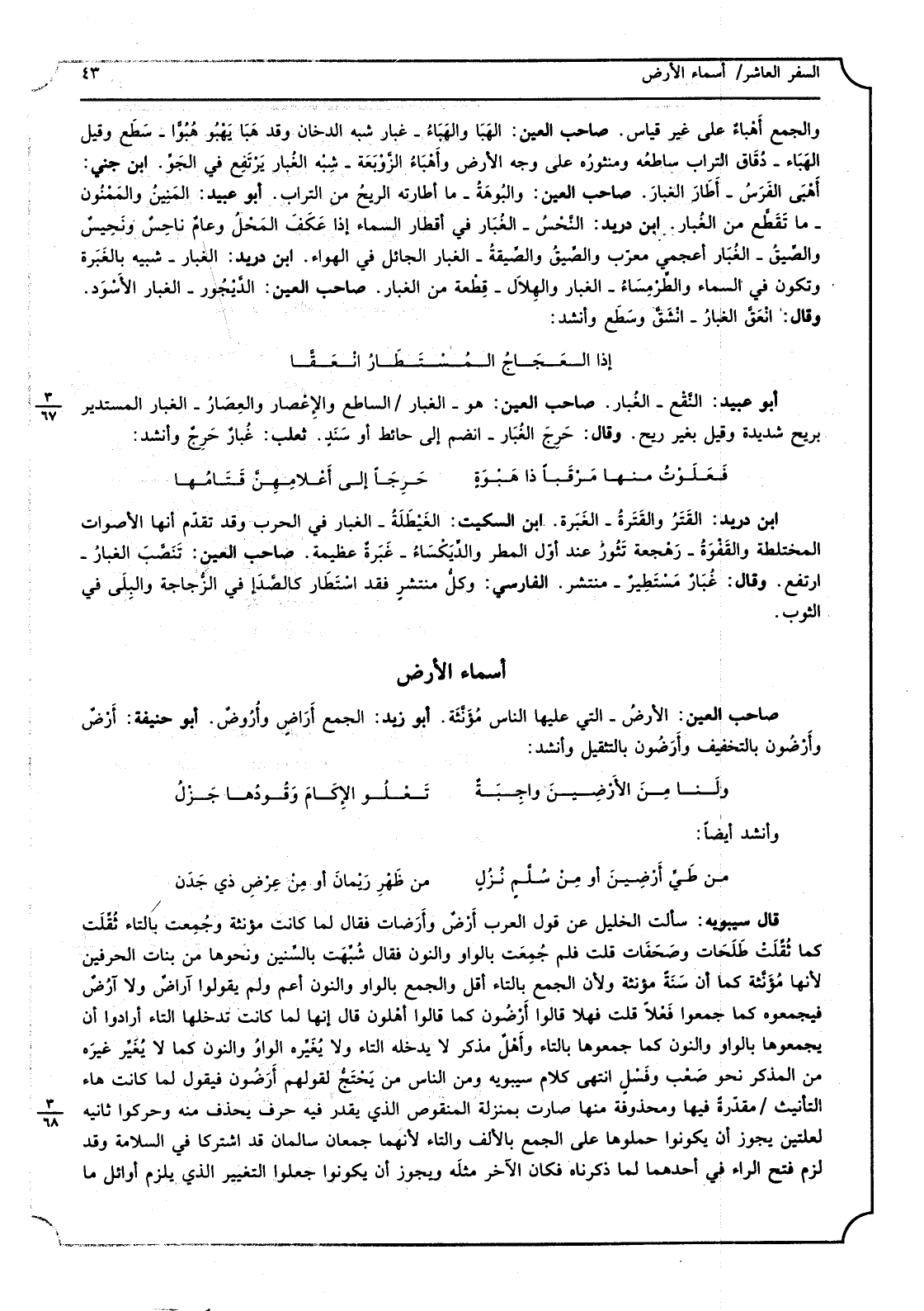 صَاحب الْعين الأَرْض - الَّتِي عَلَيْهَا النَّاس مُؤَنّثَة أَبُو زيد الْجمع - أراض وأروض أَبُو حنيفَة أَرض وأرضون بِالتَّخْفِيفِ وأرضون بالتثقيل وَأنْشد: وَلنَا من الْأَرْضين وَاجِبَة تعلو الأكام وقودها جزل وَأنْشد أَيْضا: من طي أَرضين أَو من سلمٍ نزلٍ من ظهر ريمان أَو من عرض ذِي جدن قَالَ سِيبَوَيْهٍ سَأَلت الْخَلِيل عَن قَول الْعَرَب أَرض وأرضأت فَقَالَ لما كَانَت مُؤَنّثَة وجمعت بِالتَّاءِ ثقلت كَمَا ثقلت طلحات وصحفات قلت فَلم جمعت بِالْوَاو وَالنُّون فَقَالَ شبهت بِالسِّنِينَ وَنَحْوهَا من بَنَات الحرفين لِأَنَّهَا مُؤَنّثَة كَمَا أَن سنة مُؤَنّثَة وَلِأَن الْجمع بِالتَّاءِ أقل وَالْجمع بِالْوَاو وَالنُّون أَعم وَلم يَقُولُوا آراض وَلَا أَرض فيجمعوه كَمَا جمعُوا فعلا قلت فَهَلا قَالُوا آرضون كَمَا قَالُوا أهلون قَالَ إِنَّهَا لما كَانَت تدْخلهَا التَّاء أَرَادوا أَن يجمعوها بِالْوَاو وَالنُّون كَمَا جمعوها بِالتَّاءِ وَأهل مُذَكّر لَا يدْخلهُ التَّاء وَلَا يُغَيِّرهُ الْوَاو وَالنُّون كَمَا لَا يُغير غَيره من الْمُذكر نَحْو صَعب وفسلٍ انْتهى كَلَام سِيبَوَيْهٍ وَمن النَّاس من يحْتَج لقَولهم أرضون فَيَقُول لما كَانَت هَاء التَّأْنِيث مقدرَة فِيهَا ومحذوفة مِنْهَا صَارَت بِمَنْزِلَة المنقوص الَّذِي يقدر فِيهِ حرف يحذف مِنْهُ وحركوا ثَانِيه لعلتين يجوز ان يَكُونُوا حملوها على الْجمع بالالف وَالتَّاء لِأَنَّهُمَا جمعان سالمان قد اشْتَركَا فِي السَّلامَة وَقد لزم فتح الرَّاء فِي أَحدهمَا لما ذَكرْنَاهُ فَكَانَ الآخر مثله وَيجوز أَن يَكُونُوا جعلُوا التَّغْيِير الَّذِي يلْزم أَوَائِل مَا
