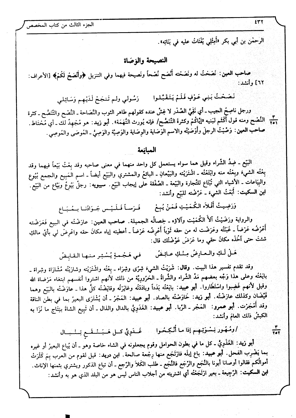 البيع - ضد الشِّرَاء وَقيل هما سَوَاء يسْتَعْمل كل وَاحِد مِنْهُمَا فِي معنى صَاحبه وَقد بِعْت بيعا فيهمَا وَقد بِعته الشَّيْء وبعته مِنْهُ وابتعته - اشْتَرَيْته والبَيِّعان - البَائِع وَالْمُشْتَرِي وَالْبيع أَيْضا - اسْم الْمَبِيع وَالْجمع بُيوع والبِياعات - الْأَشْيَاء الَّتِي تُبتاع للتِّجَارَة والبَيعة - الصّفْقة على إِيجَاب البيع. سِيبَوَيْهٍ: رجل بَيوع وبيّاع من البَيع. ابْن السّكيت: أبَعْت الشيءَ - عرّضته للْبيع وَأنْشد: ورضيت أفْلاء الكُمَيت فمَن يُبِع فرسا فَلَيْسَ جَوادُنا بمُباع وَالرِّوَايَة ورضيت آلَاء الْكُمَيْت وآلاؤه - خِصاله الجميلة. صَاحب الْعين: عارضْته فِي البيع فعرضته أعرُضُه عرْضاً - غبنْته وعرضْت لَهُ من حَقه نوْباً أعرِضه عرْضاً - أَعْطيته إِيَّاه مَكَان حَقه واعرِض لي بِأَيّ مَالك شِئْت حَتَّى آخذَه مَكَان حَقي وَمَا عرض عوّضْتك قَالَ: هَل لكِ والعارضُ منكِ عائِضف فِي هجْمة يُسْئر منهاالقابِض وَقد تقدم تَفْسِير هَذَا الْبَيْت. وَقَالَ: شريْت الشَّيْء شِرًى وشِراء - بِعته واشتريته وشارَيته مُشاراة وشِراء - بايعته وعَلى هَذَا وجّه بَعضهم مدّ الشِراء والشُراة - الحَرورية من ذَلِك لأَنهم اشْتَروا أنفسهم ابْتِغَاء مَرضاة الله وَقيل لأَنهم غضِبوا واستطاروا. أَبُو عبيد: بايعْته بدداً وباددْته وغايرْته وقايَضْته كل هَذَا - عاوضْته بِالْبيعِ وهما قيّضان وَكَذَلِكَ عارضته. أَبُو زيد: خاوصْته بالصَّاد. أَبُو عبيد: المَجْر - أَن يُشترى الْبَعِير بِمَا فِي بطن النَّاقة وَقد أمجَرْت. أَبُو عَمْرو: المجْر - الرِبا. أَبُو عبيد: الغدَويّ بِالدَّال والذال - أَن تبيع الشاةَ بنتاج مَا نَزا بِهِ الكبشُ ذَلِك الْعَام وَأنْشد: ومُهور نِسوتِهم إِذا مَا أُنكِحوا غدَويّ كل هبنْقَع تِنْبال أَبُو زيد: الغذوي - كل مَا فِي بطُون الْحَوَامِل وَقوم يجعلونه فِي الشَّاء خَاصَّة وَهُوَ - أَن يُباع الْبَعِير أَو غَيره بِمَا يضرِب الْفَحْل. أَبُو عبيد: بَاعَ إبلَه فارتجع مِنْهَا رِجعة صَالِحَة. ابْن دُرَيْد: قيل لقوم من الْعَرَب بمَ كثُرَت أموالُكم فَقَالُوا أوصانا أَبونَا بالنُجَع والرِجَع فالنُجَع - طلب الْكلأ والرِجع - أَن تبَاع الذُّكُور ويشترى بِثمنِهَا الْإِنَاث. ابْن السّكيت: الرّجيعة - بعير ارتجَعْته أَي اشْتَرَيْته من أجلاب النَّاس لَيْسَ هُوَ من الْبَلَد الَّذِي هُوَ بِهِ وَأنْشد: