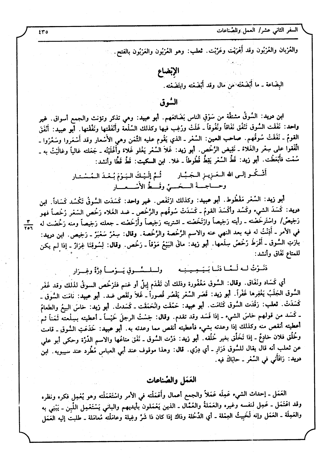 ابْن دُرَيْد: السُّوق مُشْتَقَّة من سَوق النَّاس بضائعَهم. أَبُو عبيد: وَهِي تذكر وتؤنث وَالْجمع أسواق. غير وَاحِد: نفقَت السُّوق تنفُق نَفاقاً ونُفوقاً - غلت ورُغِب فِيهَا وَكَذَلِكَ السّلْعَة وأنفقتها ونفّقتها. أَبُو عبيد: أنْفق الْقَوْم - نفقَتْ سوقُهم. صَاحب الْعين: السِعْر - الَّذِي يقوم عَلَيْهِ الثّمن وَهِي الأسعار وَقد أسعروا وسعّروا - اتّفقوا على سِعر والغلاء - نقيض الرُخْص. أَبُو زيد: غلا السّعر يغلو غلاءً وأغليته - جعلته غالياً وغاليت بِهِ - سُمْت فأبْعَطْت. أَبُو زيد: قطّ السِعر يقِطّ قُطوطاً - غلا. ابْن السّكيت: قطّ قطّاً وَأنْشد: أَشْكُو إِلَى الله الْعَزِيز الجبّارْ ثمَّ إليكَ اليومَ بُعدَ المُستار وحاجة الحيّ وقطّ الأسعار أَبُو زيد: السّعر مقطوط. أَبُو عبيد: وَكَذَلِكَ ارتفَص. غير وَاحِد: كسدت السُّوق تكسُد كساداً. ابْن دُرَيْد: كسدَ الشَّيْء وكسُد وأكسَد الْقَوْم - كسدت سوقُهم والرُخْص - ضد الغلاء رخُص السّعر رُخْصاً فَهُوَ رخيص واسترخصته - رَأَيْته رخيصاً وارتخصْته - اشْتَرَيْته رخيصاً وأرخصْته - جعلته رخيصاً وَمِنْه رخّصْت لَهُ فِي الْأَمر - أذِنْت لَهُ فِيهِ بعد النَّهْي عَنهُ وَالِاسْم الرُخْصة والرخُصة. وَقَالَ: سعر سعبَر - رخيص. ابْن دُرَيْد: بارَت السُّوق - أفرط رُخْص سلعها. أَبُو زيد: ماق البيع موْقاً - رخُص. وَقَالَ: لسوقِنا غِرار - إِذا لم يكن للمتاع نَقاق وَأنْشد: دنوتُ لَهُ لمّا دنا بِيَمِينِهِ وللسوق يَوْمًا دِرّة وغِرار أَي كساد ونفاق. وَقَالَ: السُّوق مغفورة وَذَلِكَ أَن تقدَم إبل أَو غنم فترخص السُّوق لذَلِك وَقد غفر السُّوق الجلَب يغفِرها غفْراً. أَبُو زيد: قصَر السِعر يقصُر قُصوراً - غلا وَنقص ضد. أَبُو عبيد: نَامَتْ السُّوق - كسدت. ثَعْلَب: رقدَت السُّوق كنامَت. أَبُو عبيد: حمُقَت وانحمقت - كسدت. أَبُو زيد: خاس البيعُ والطعامُ - كسَد من قَوْلهم خاس الشَّيْء - إِذا فسد وَقد تقدم. وَقَالَ: خِسْت الرجل خيْساً - أَعْطيته بسِلْعته ثمنا ثمَّ أَعْطيته أنقص مِنْهُ وَكَذَلِكَ إِذْ وعدته بِشَيْء فأعطيته أنقص مِمَّا وعدته بِهِ. أَبُو عبيد: خدعَتِ السُّوق - قَامَت وخُلُق فلَان خادِع - إِذا تخلّق بِغَيْر خلُقه. أَبُو زيد: درّت السُّوق - نفَق متاعُها وَالِاسْم الدِرّة وَحكى أَبُو عَليّ عَن ثَعْلَب أَنه قَالَ يُقَال للسّوق دَرار - أَي دِرّي. قَالَ: وَهَذَا مَوْقُوف عِنْد أبي الْعَبَّاس مطّرد عِنْد سِيبَوَيْهٍ. ابْن دُرَيْد: رافأني فِي السِعر - حاباك فِيهِ.